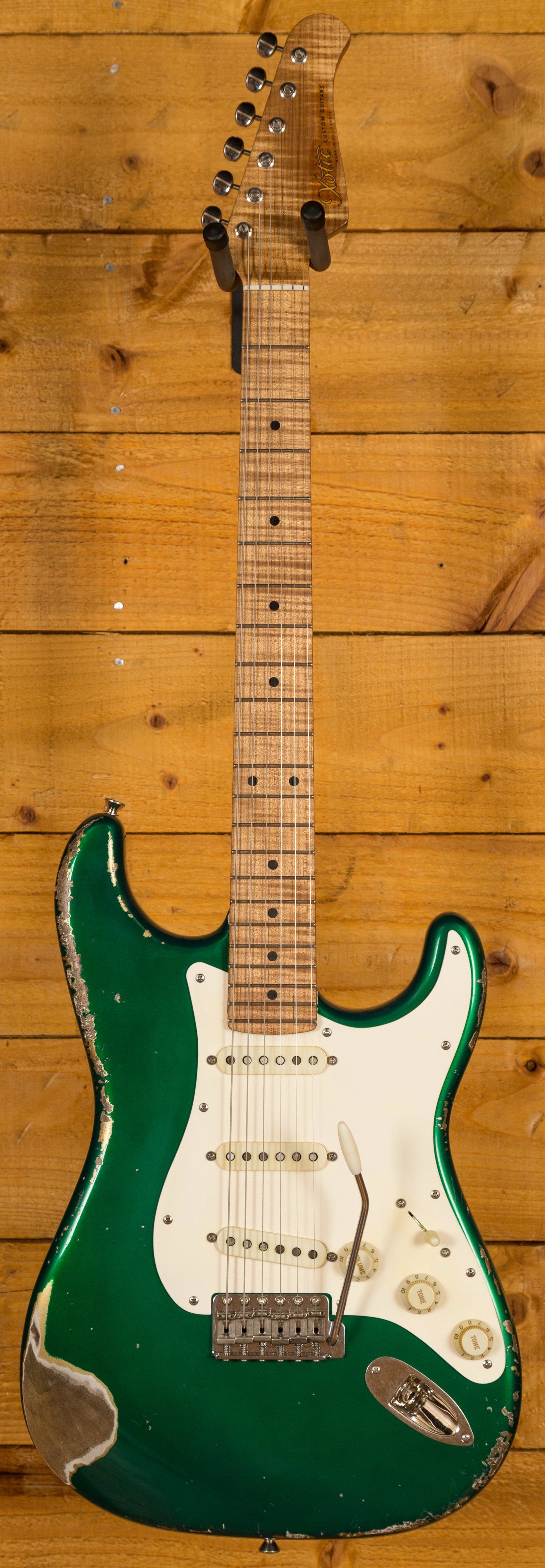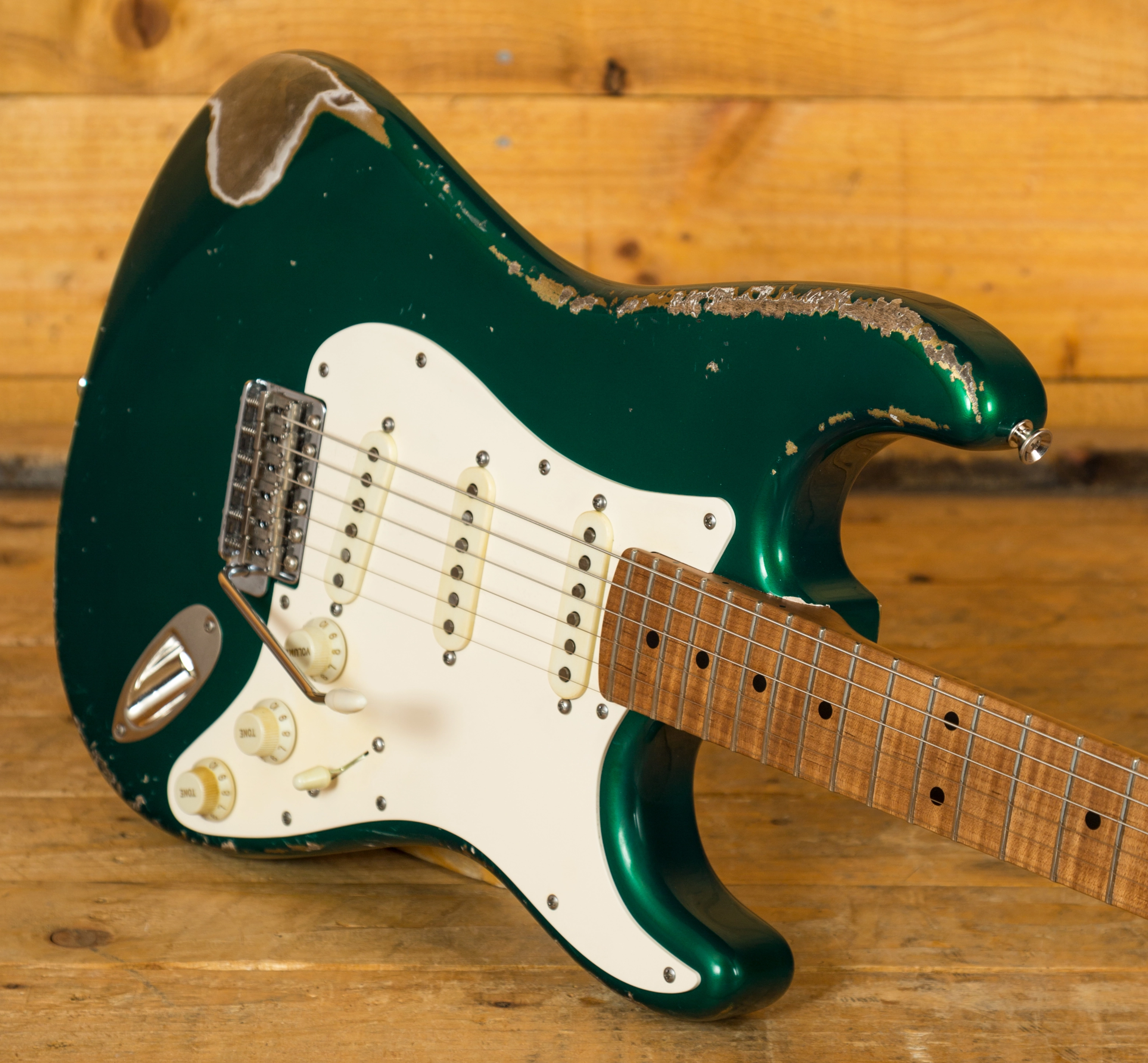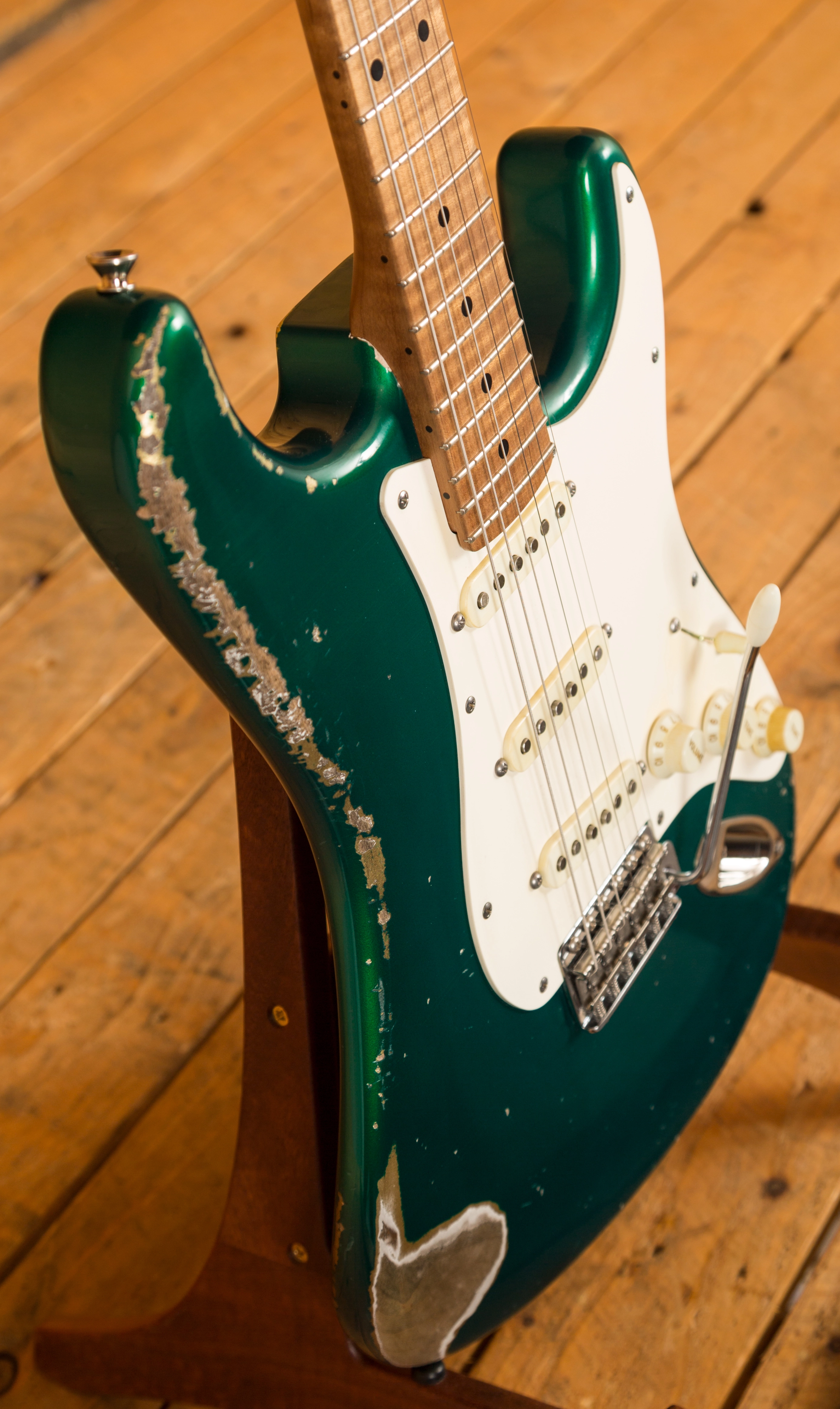 A boutique take on the classic Strat shape, the Alder body is finished in a lush Heavy Relic Candy Apple Green, authentically aged; it looks fresh from the road. With a nitrocellulose lacquer coating, the body has space to breathe, allowing the beautiful, organic tones from each hand selected cut to really resonate.