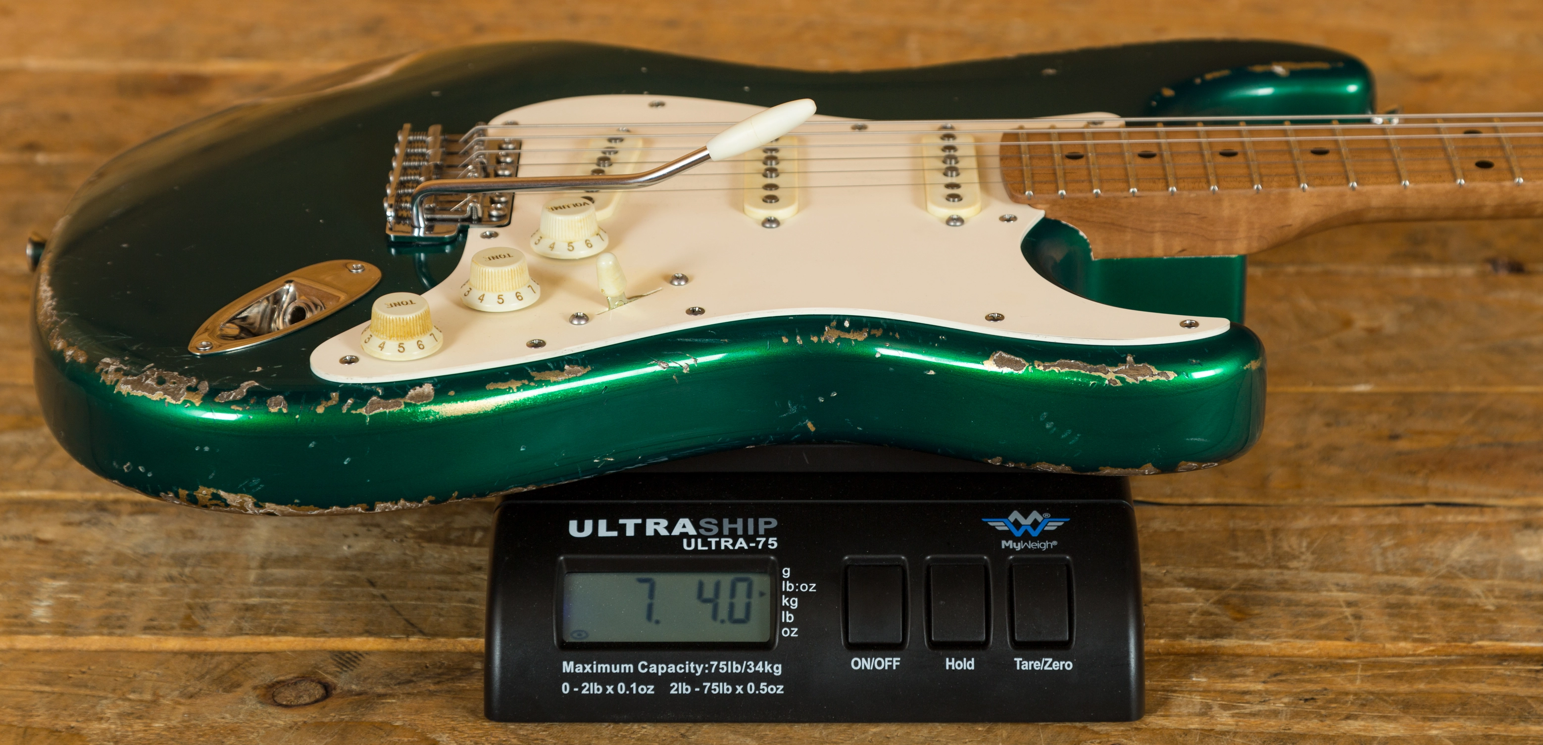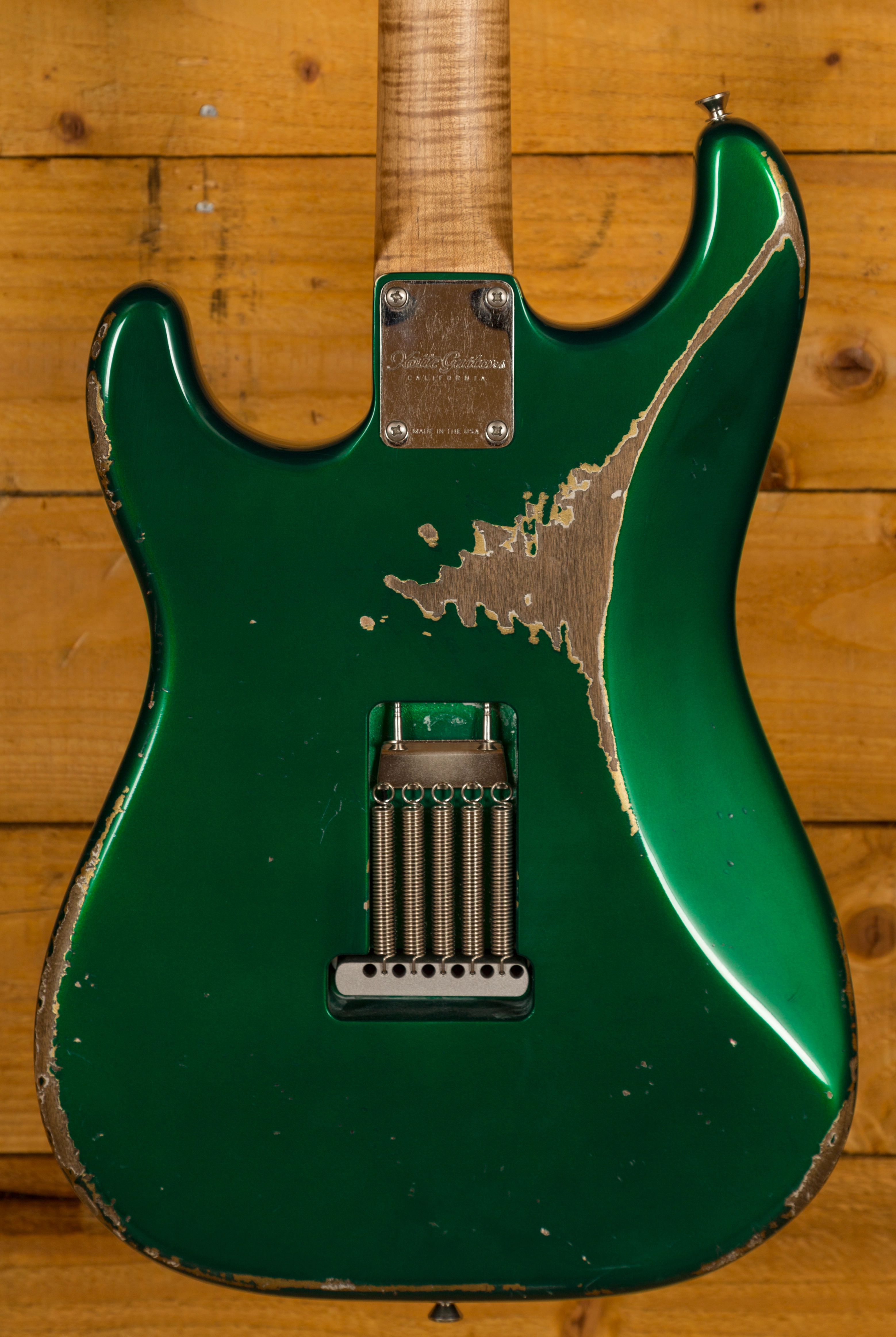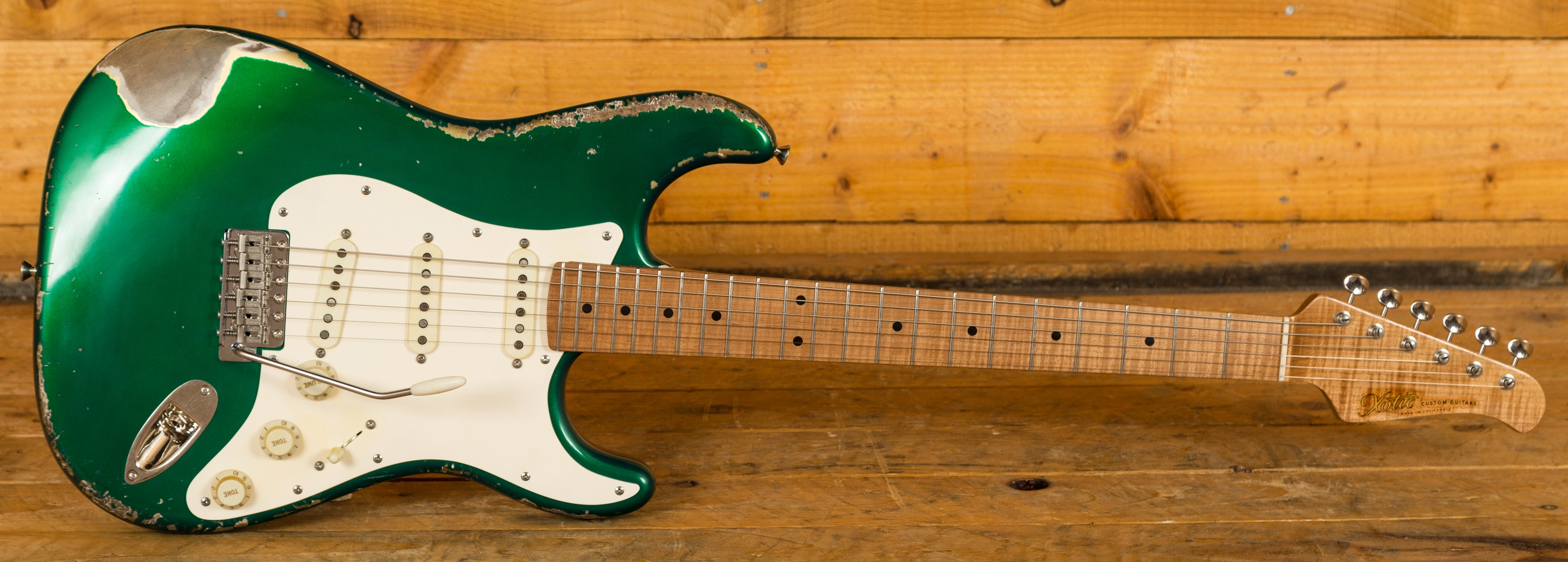 A boutique take on the classic Strat shape, the Alder body is finished in a lush Heavy Relic Candy Apple Green, authentically aged; it looks fresh from the road. With a nitrocellulose lacquer coating, the body has space to breathe, allowing the beautiful, organic tones from each hand selected cut to really resonate.