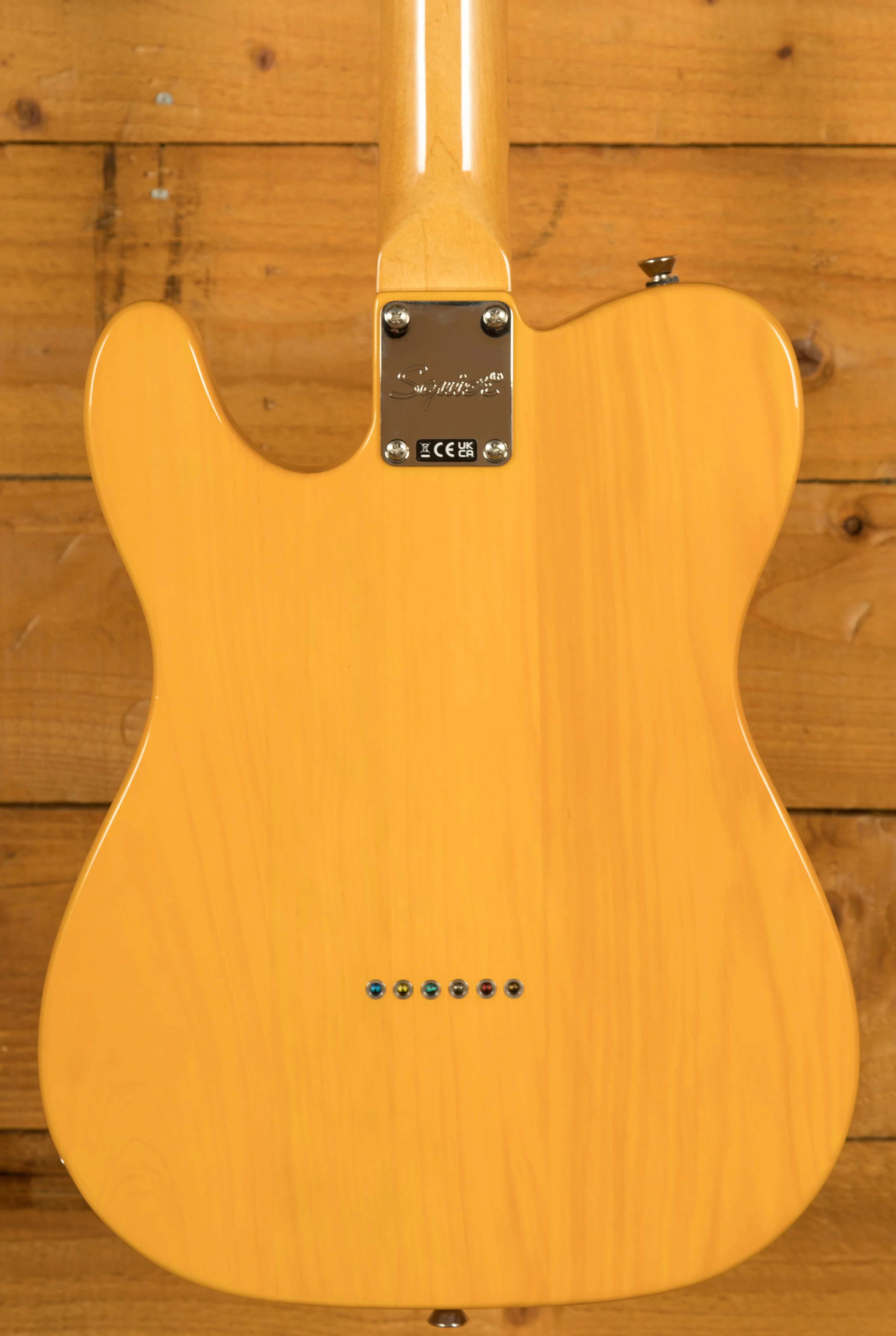 The Pine body is finished in a crisp Butterscotch Blonde, lightweight and finely crafted; it delivers classic Tele tones. The Maple neck features a slim C profile, 25.5" scale length, 9.5" radius and 21 narrow tall frets. It's real comfortable, whether you are playing huge chords or smooth lead lines, the Tele can deliver it.