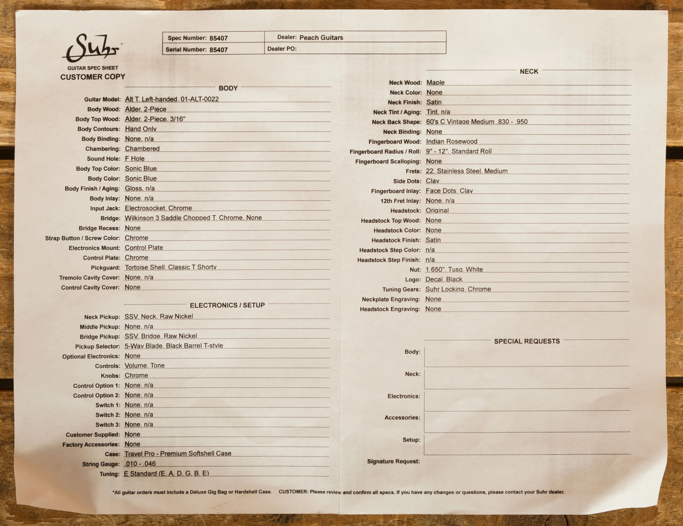 This guitar is all about the Vibe - Suhr don't just make amazing high performance virtuoso guitars, they also make some of the sweetest sounding instruments out there. With an Alder body finished in a cracking Sonic Blue finish, this thinline beaut just sings!