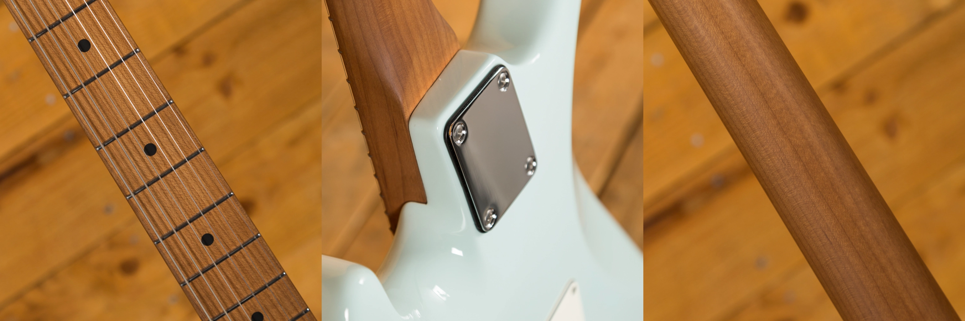 The Roasted Maple neck offers a tighter, snappier response and is really smooth and fluid underhand. With an even C medium profile, rolled frets, a compound 9''-12'' radius and a Roasted Maple fingerboard this a substantial but real comfortable guitar. It has the best possible string action, playability and intonation.