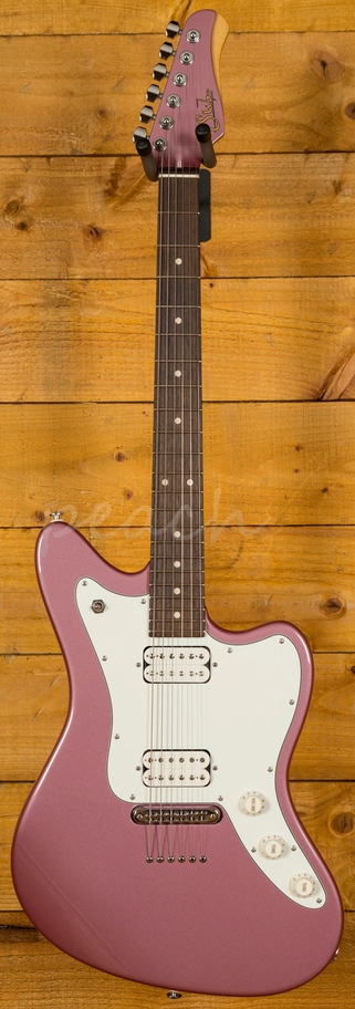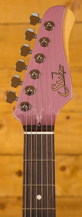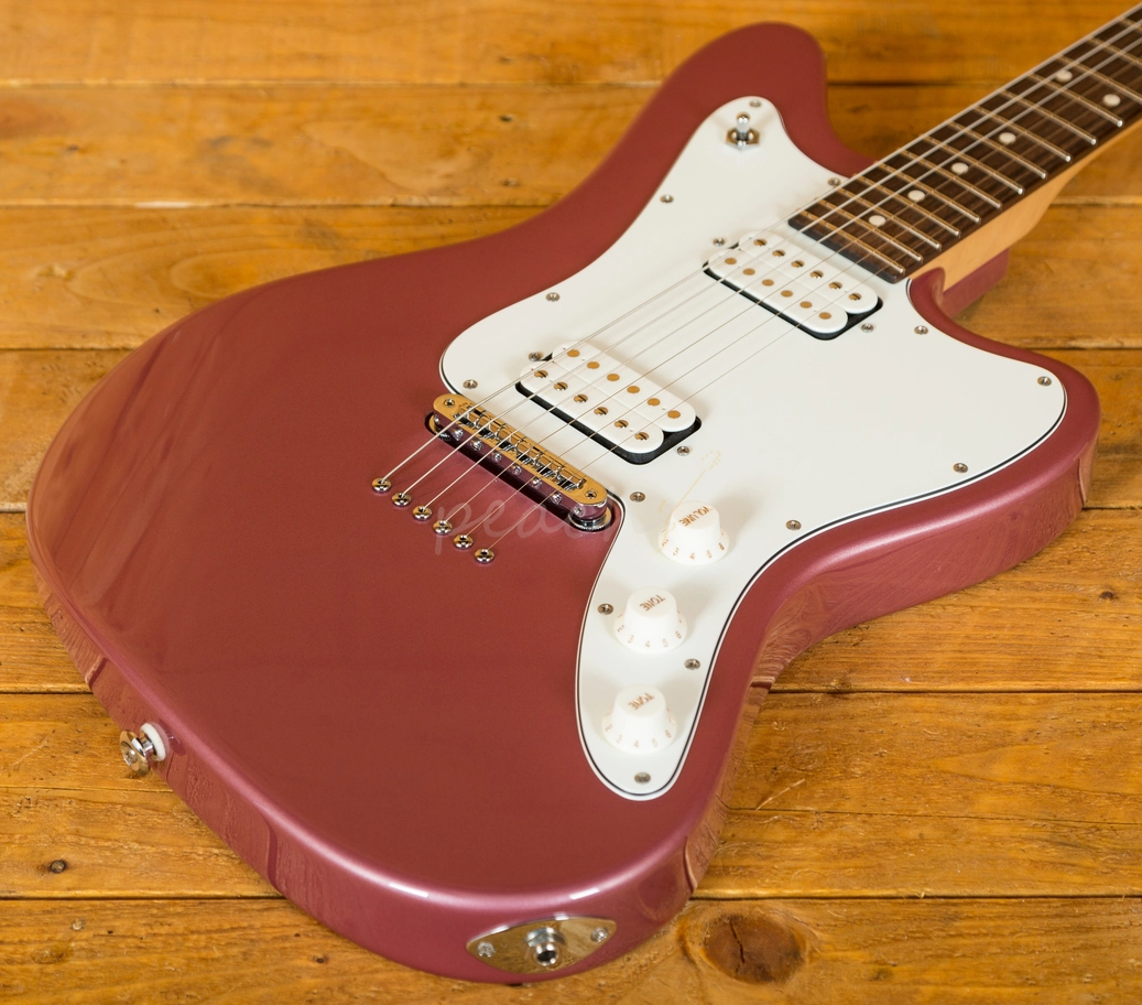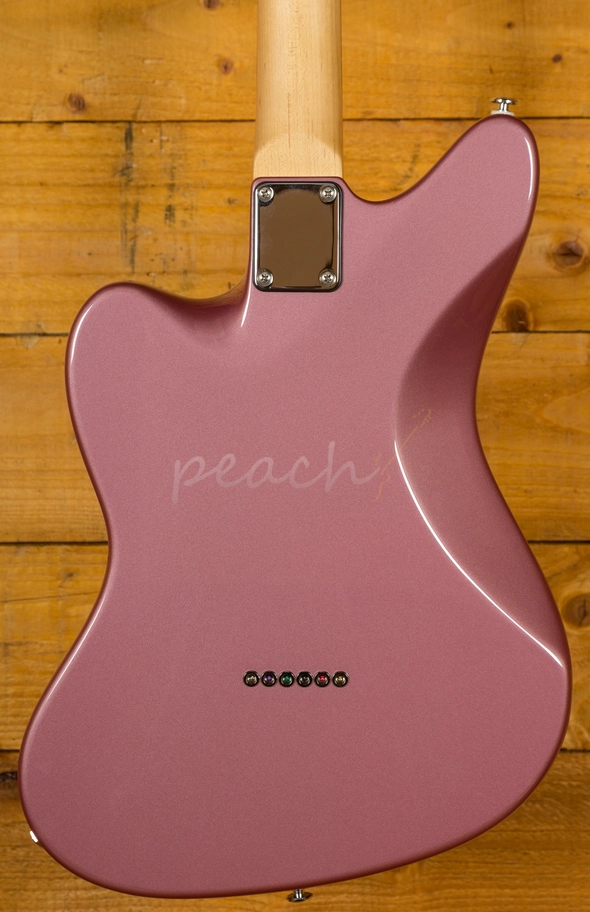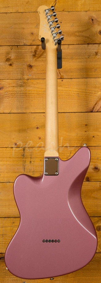 This one has a custom 'burgundy mist" finish, which is metallic and just really pops when you get it under the light. The hybrid step headstock is matching too.