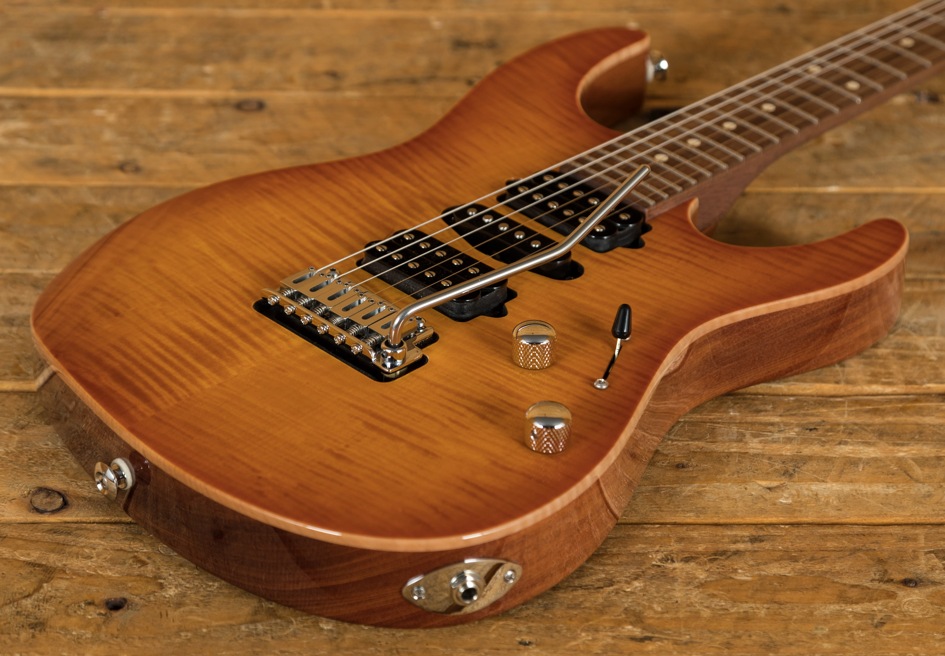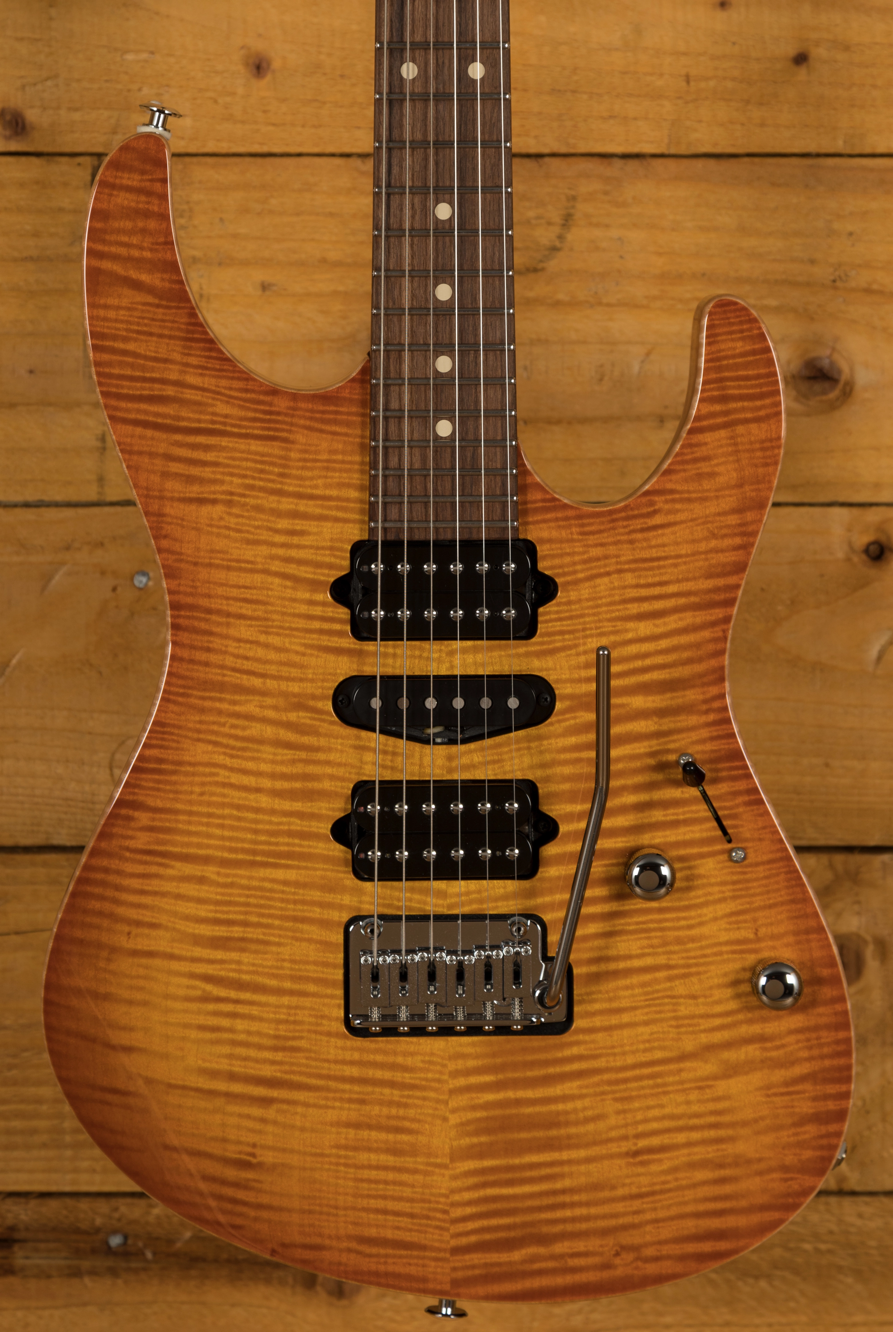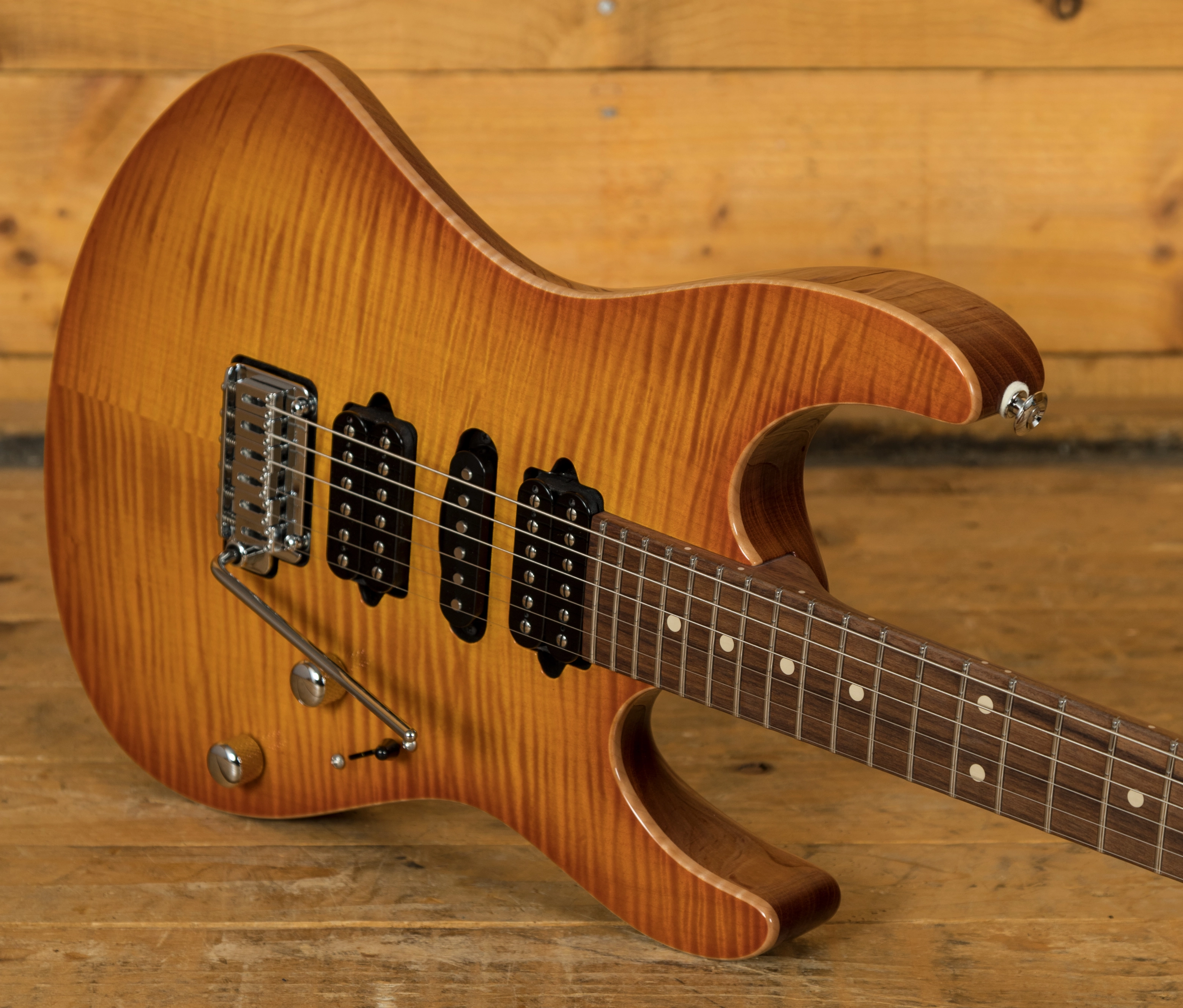 With a Mahogany body and a lush Flame Maple top, its tonally superior, light weight and beautifully poised for action. Suhr have finished it in Trans Amber Burst and utilised arm, hand and tummy contours for a really comfortable playing experience.