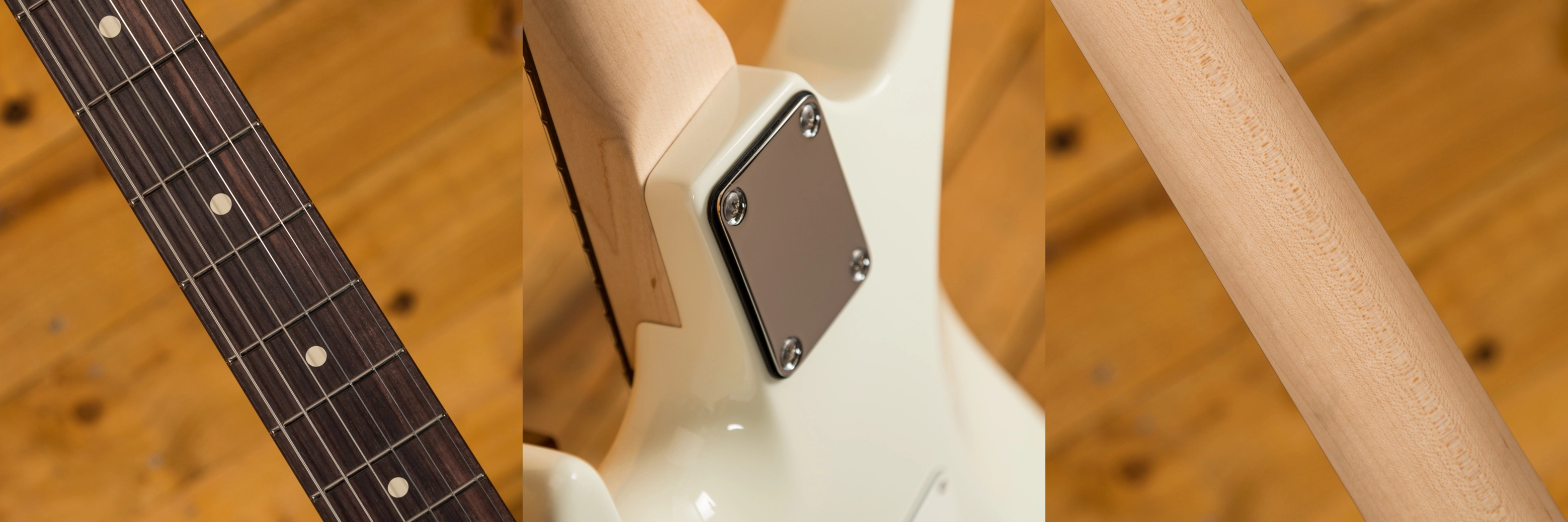 The classic Alder body is finished in a gloss which offers an unparalleled level of protection and tone. It's really resonant and looks great in Olympic White. With arm, hand and tummy contours it retains that classic vibe while being supremely comfortable.
