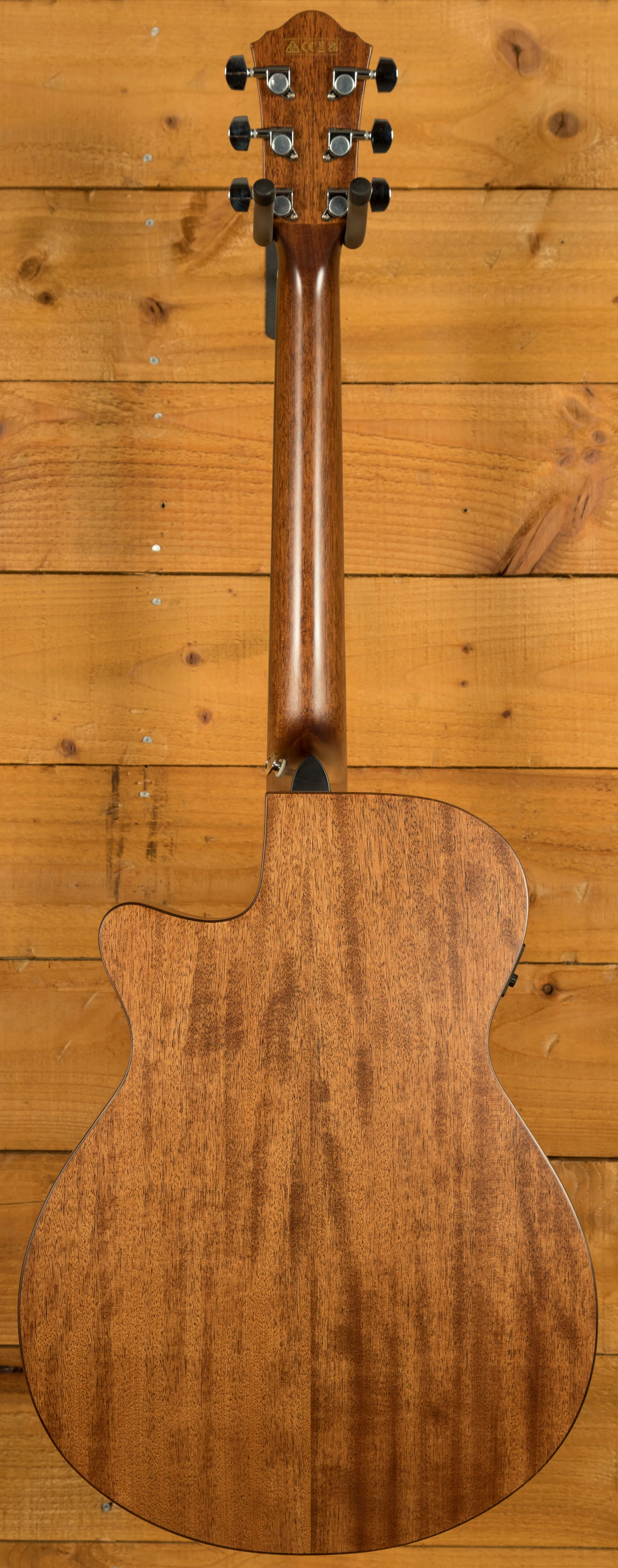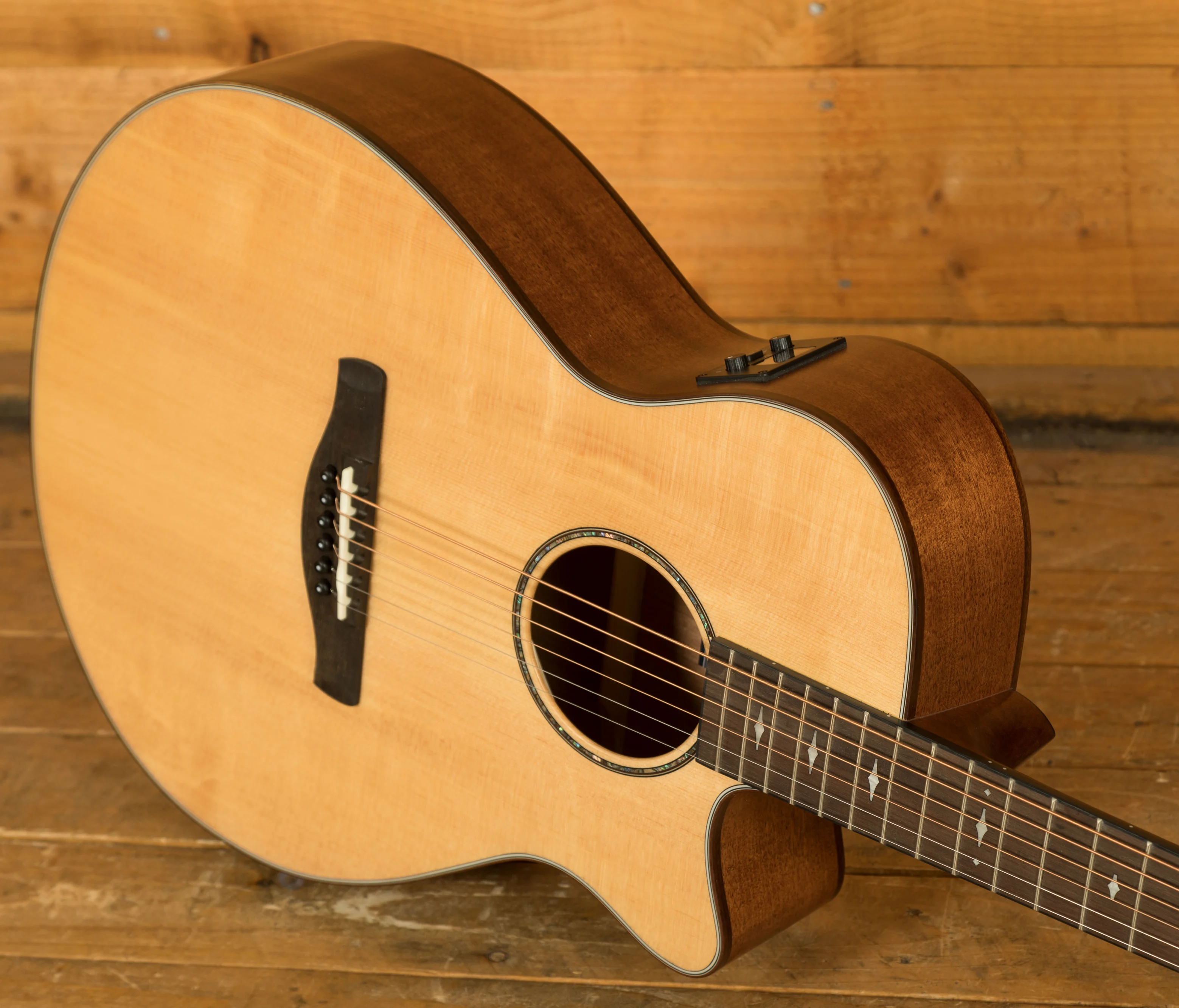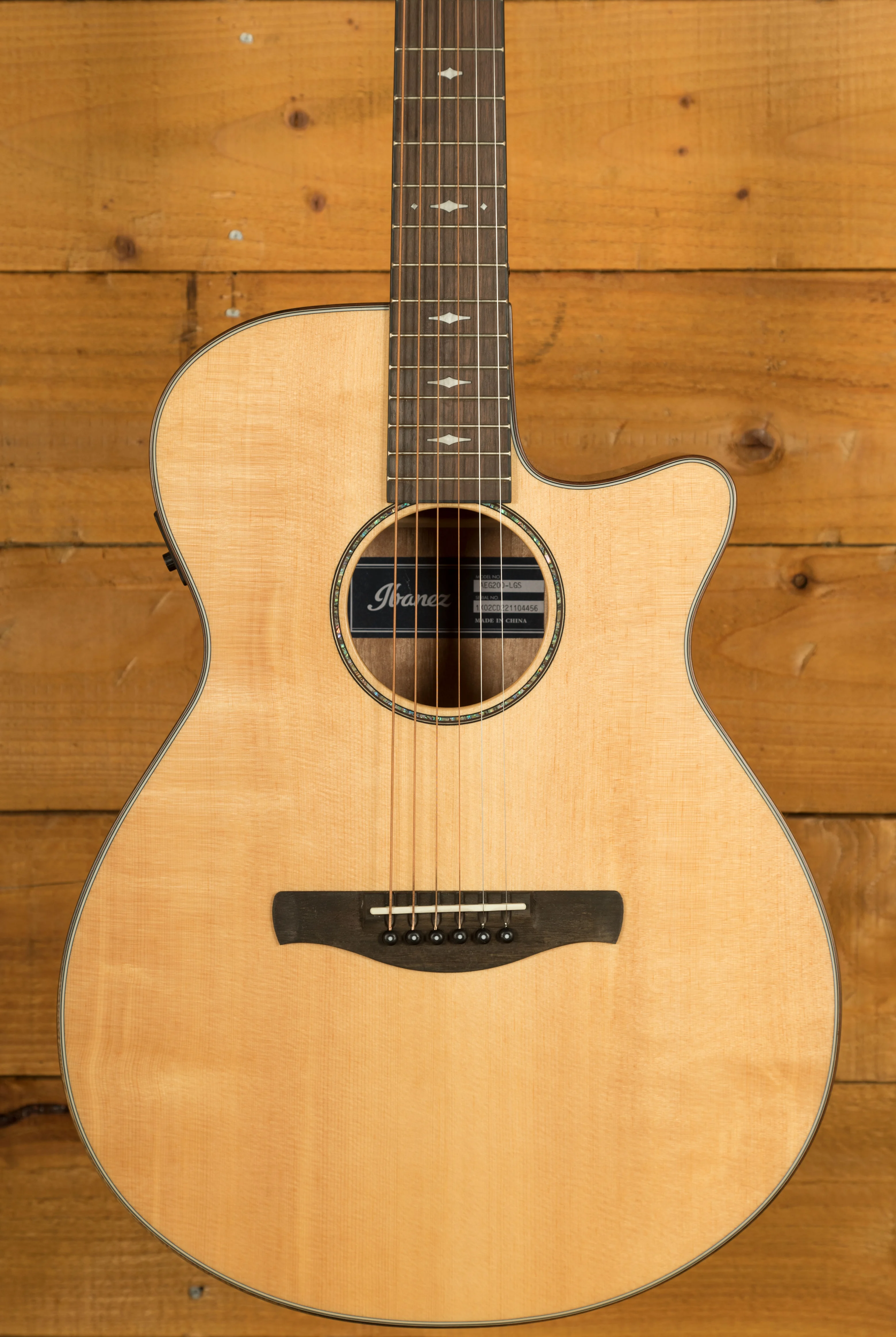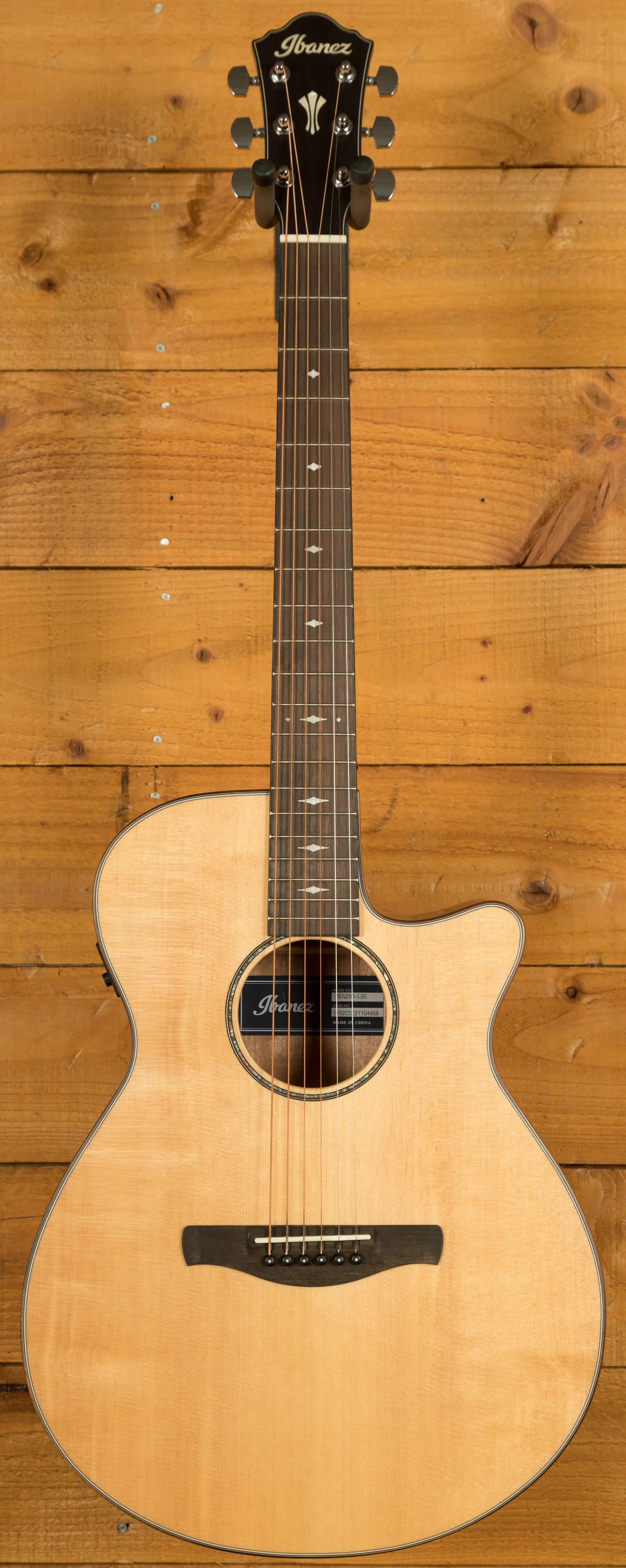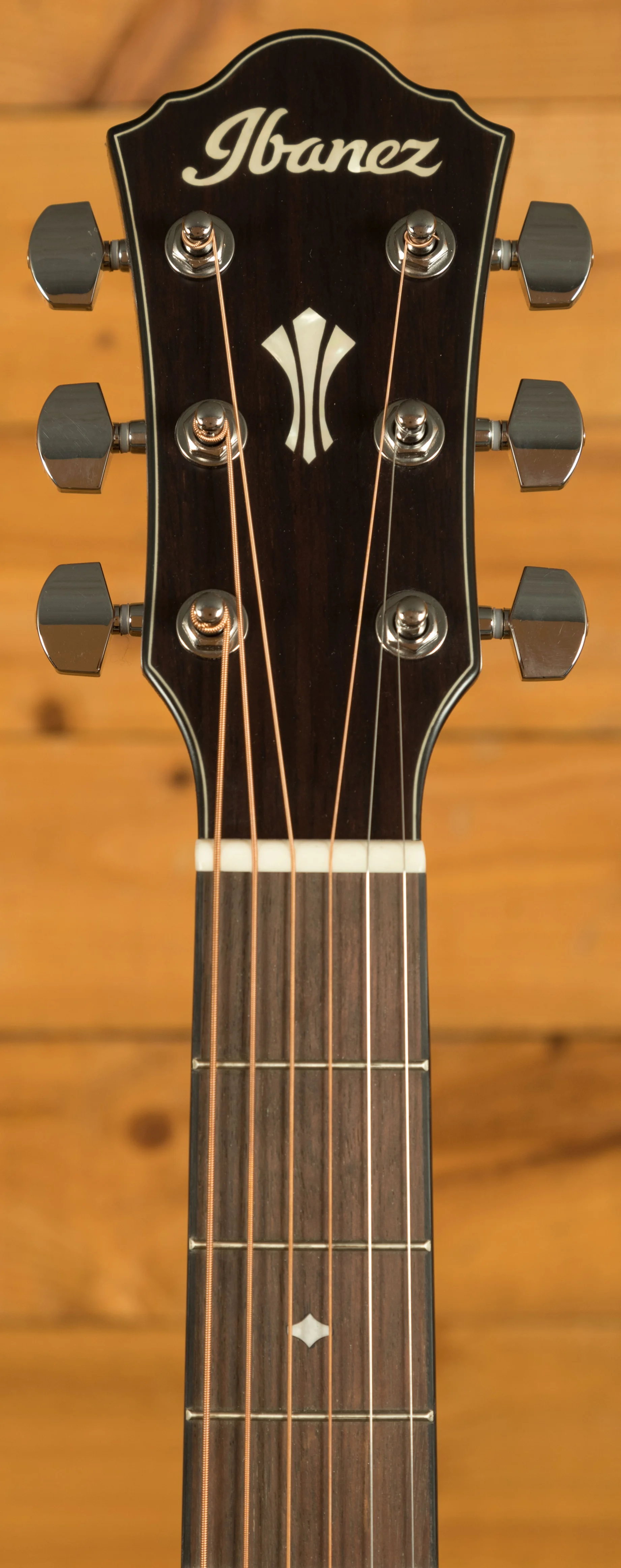 Electronics include the Ibanez T-Bar II undersaddle pickup and AEQ-TTS preamp with onboard tuner and LCD display. A single ¼" stereo output jack and 9V battery power keep things simple and reliable. Additional appointments include a bone nut and compensated saddle, ovangkol bridge, Ibanez Advantage bridge pins, and chrome die-cast tuners.