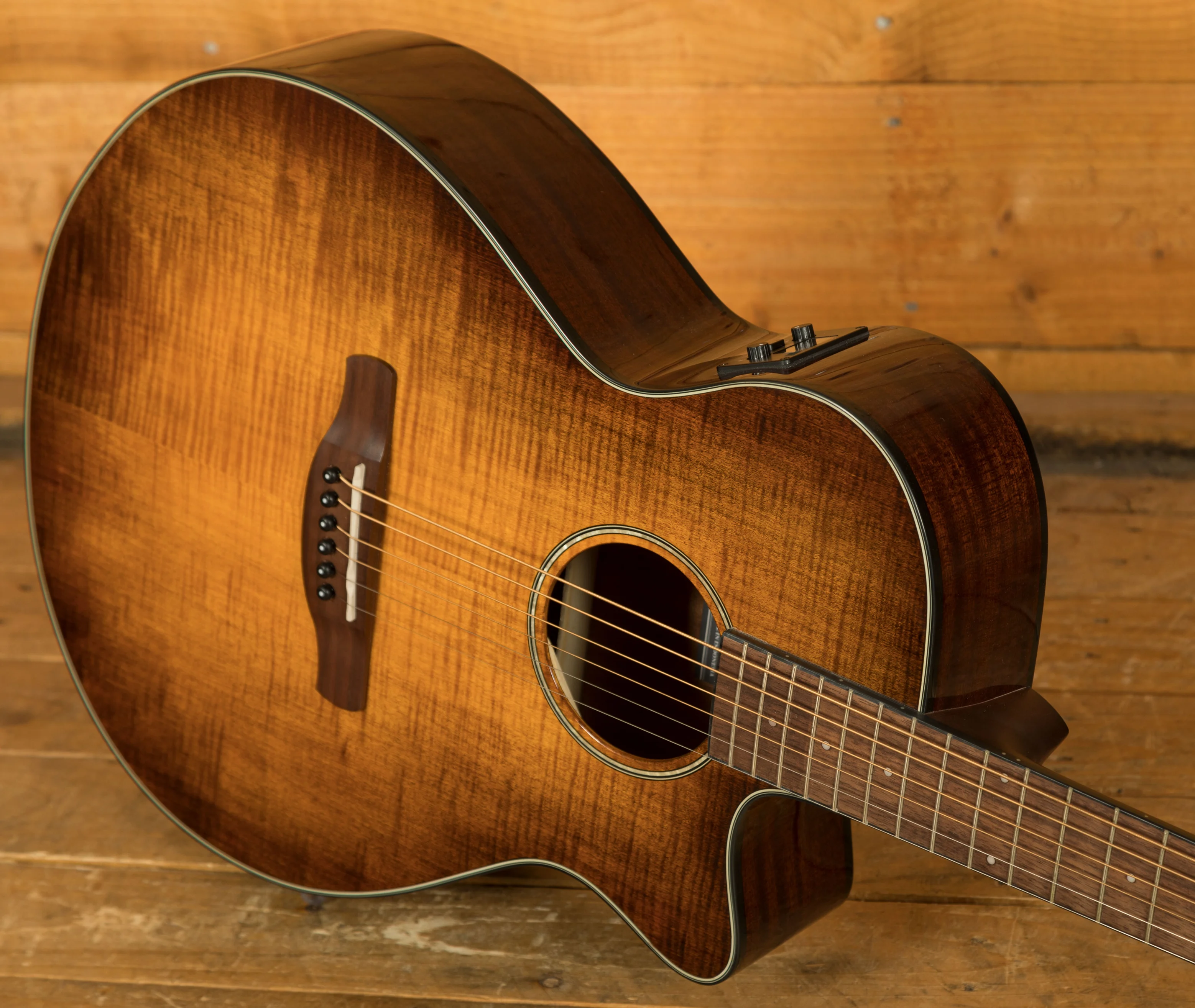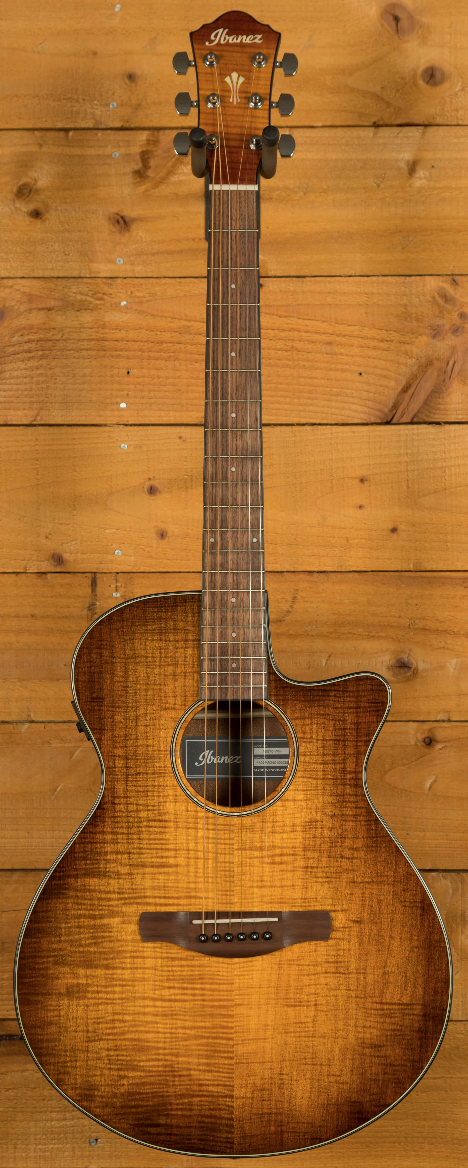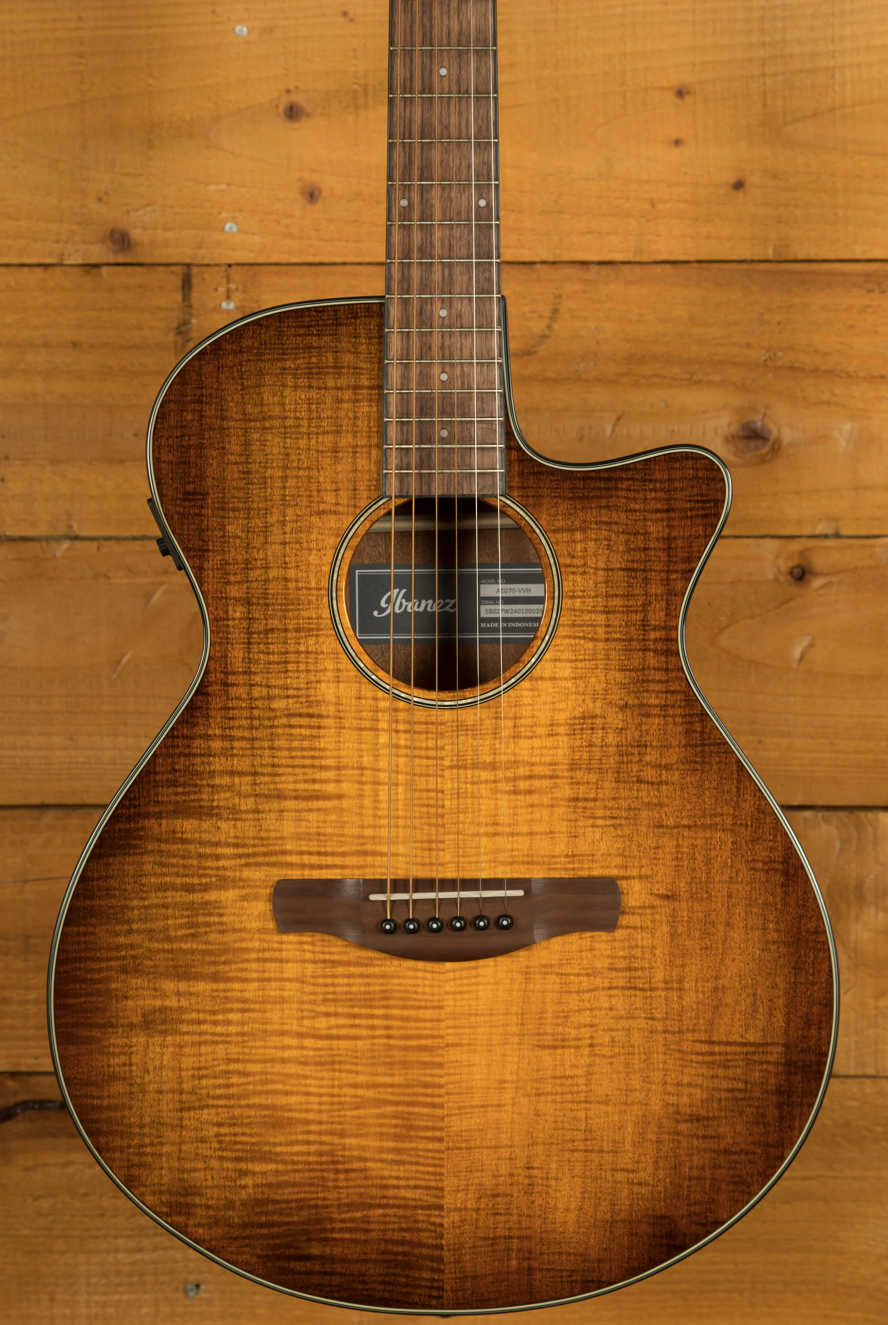 The Ibanez AEG70 in Vintage Violin High Gloss blends classic acoustic tone with modern playability and stage-ready electronics. Its flamed maple top and sapele back and sides deliver a bright, balanced sound with warm mids and crisp highs. The gloss finish highlights the figuring beautifully, framed by black and white binding.