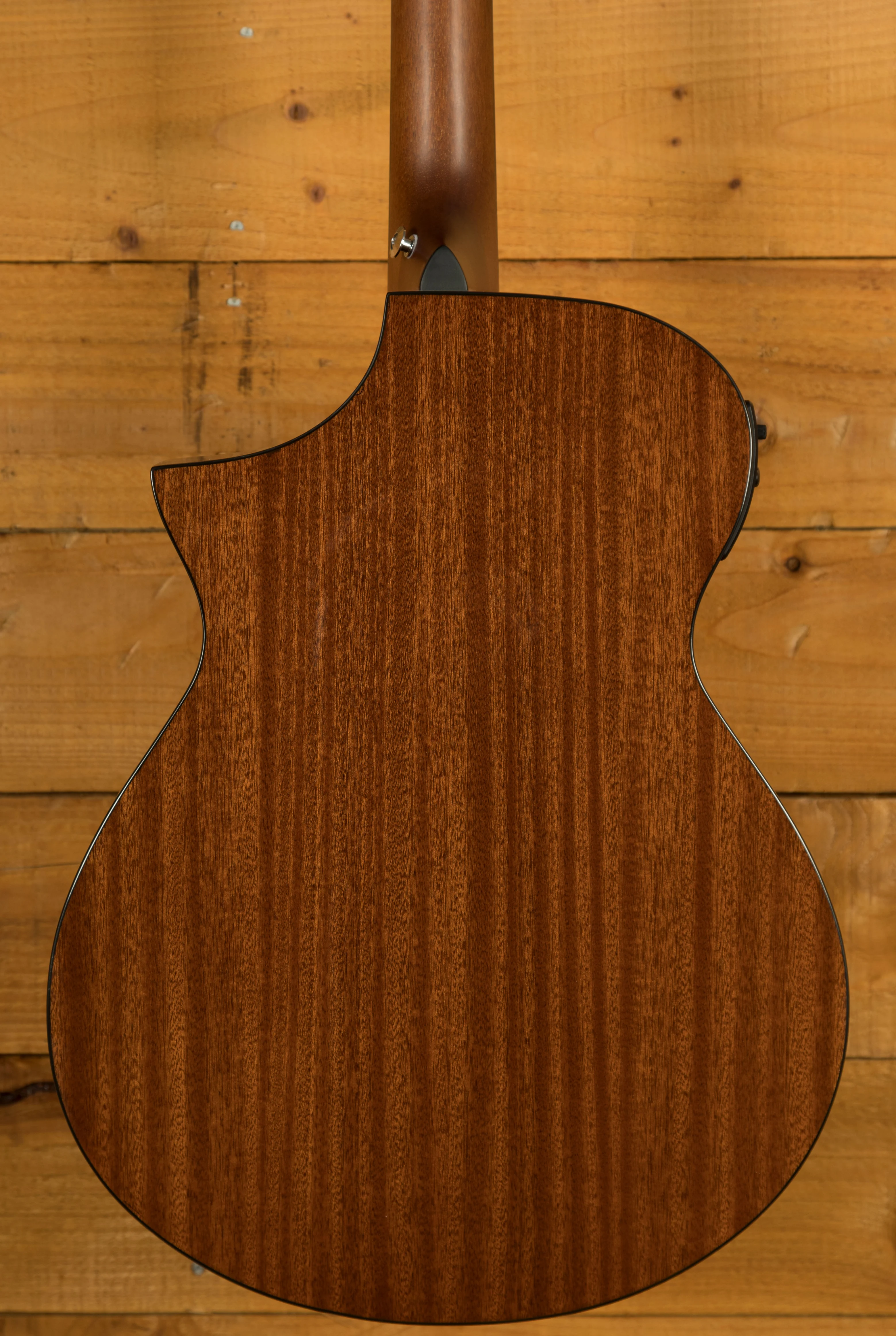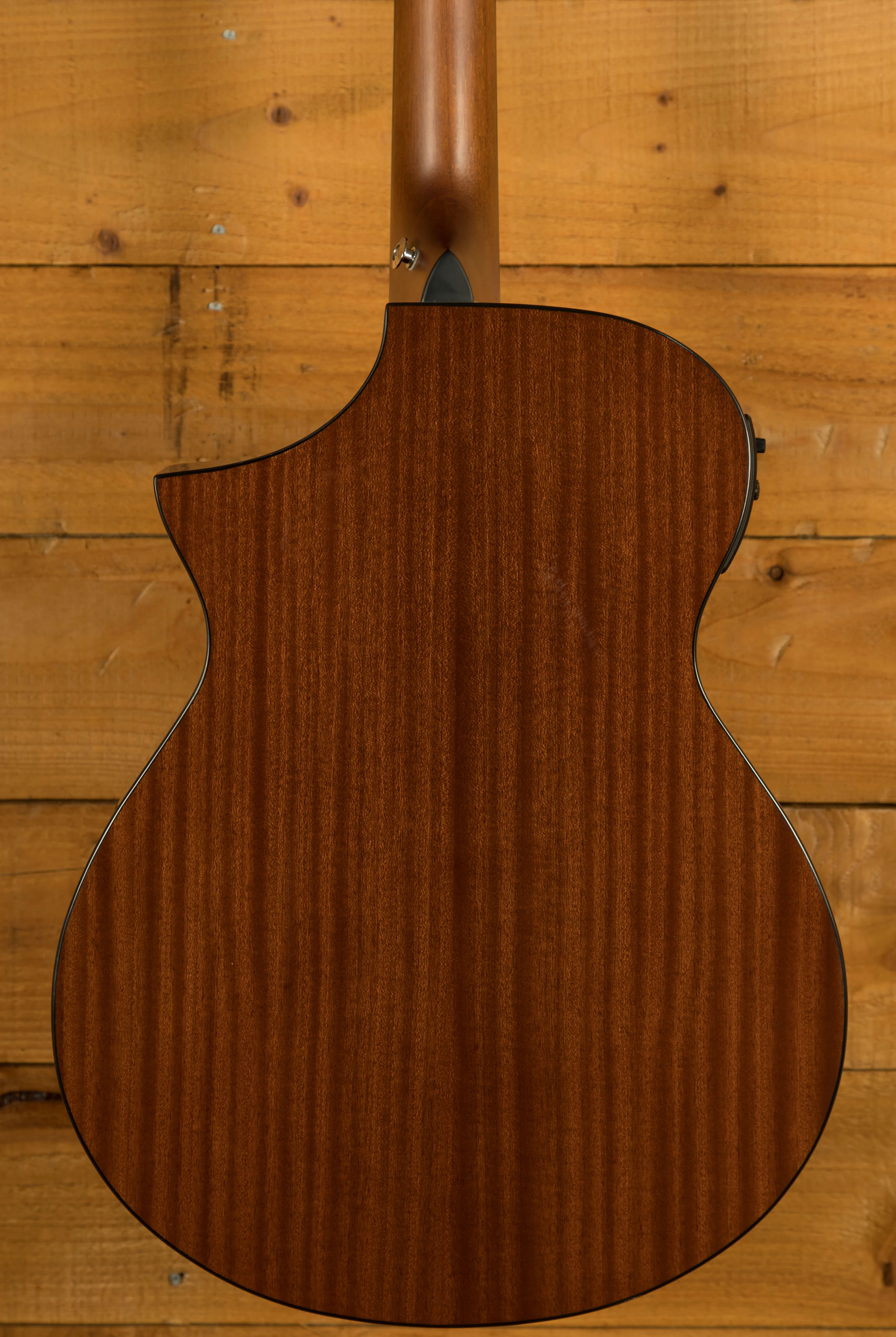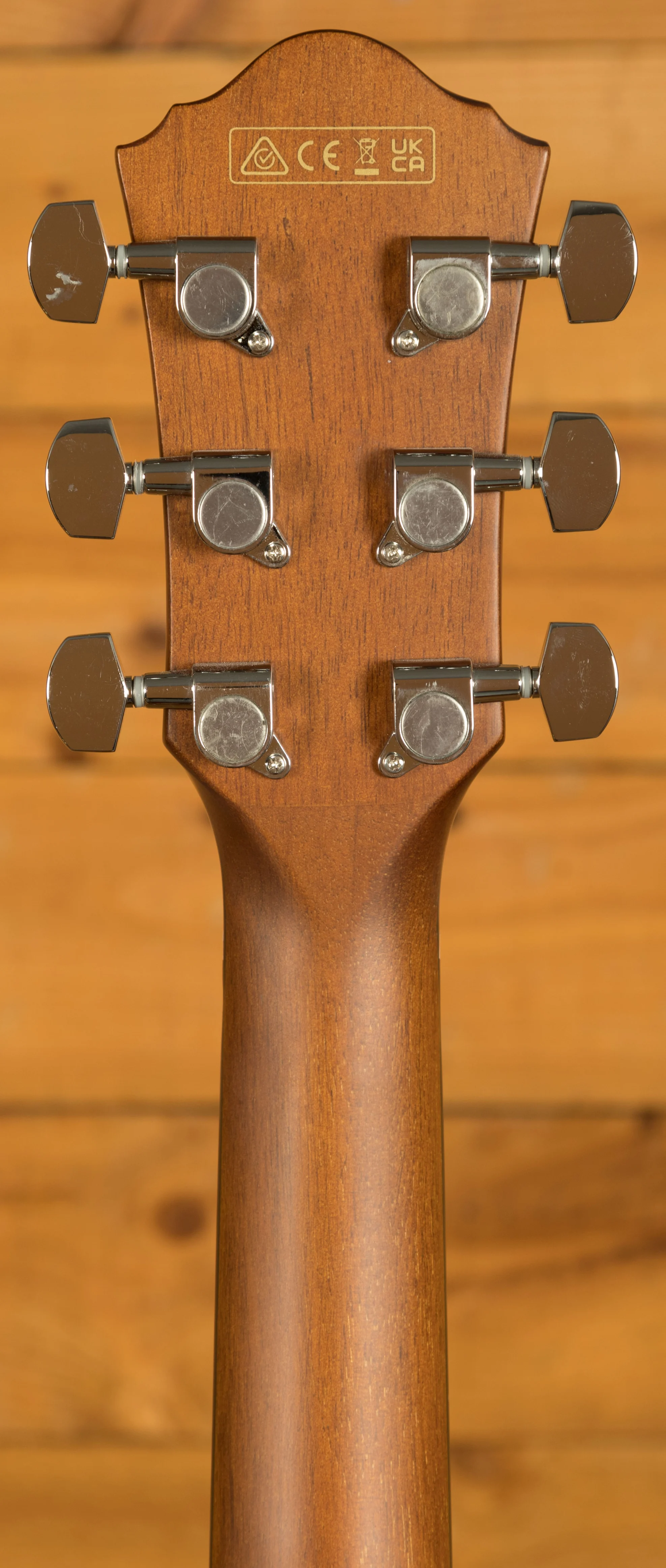 The spruce top delivers crisp articulation and tonal clarity, while sapele back and sides add warmth and midrange depth. The gloss finish highlights the burst beautifully, framed by black and white binding.