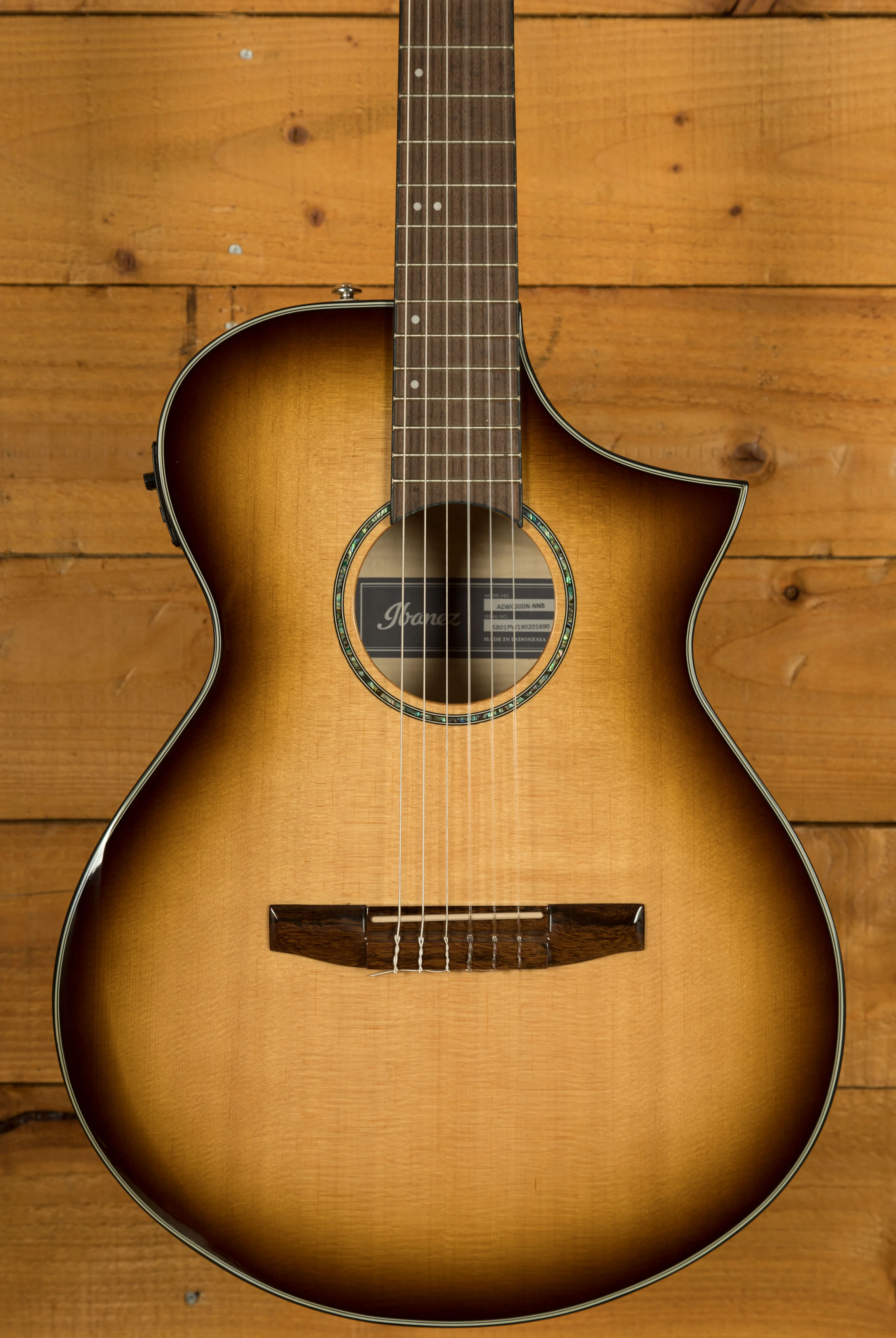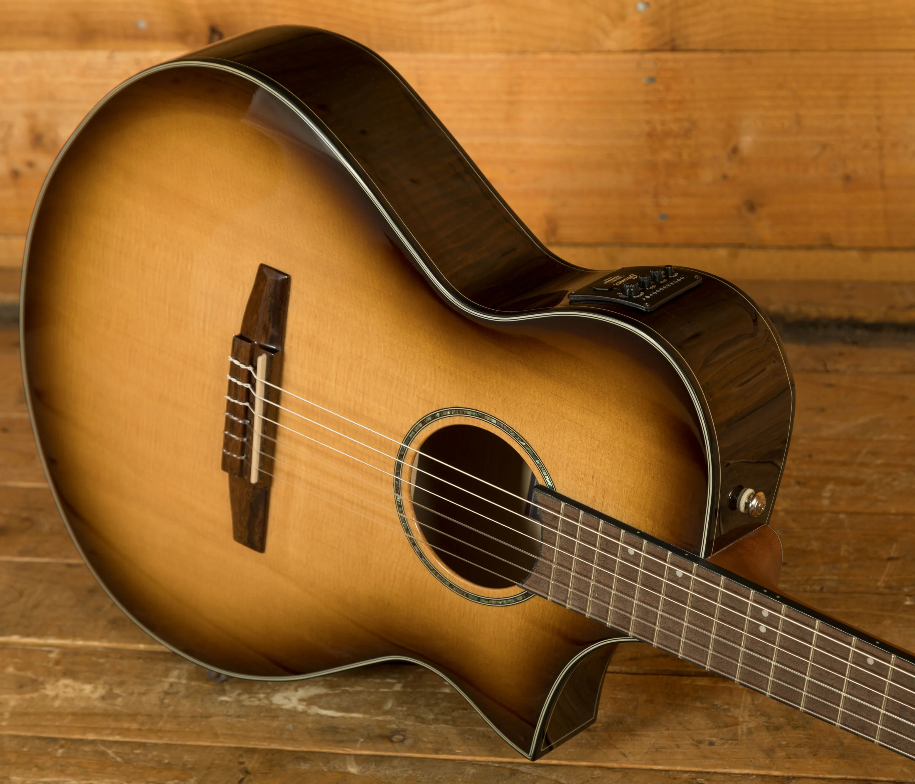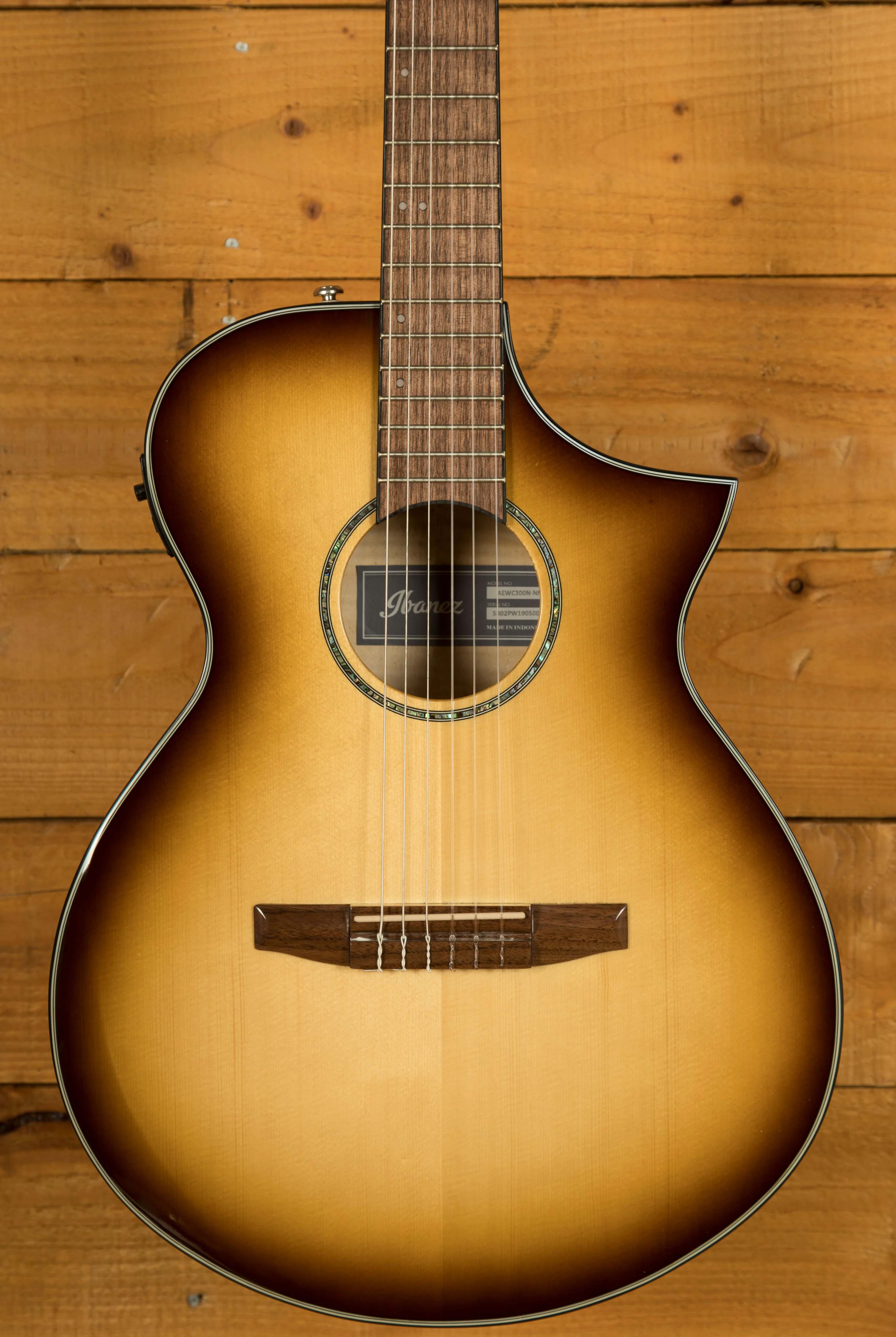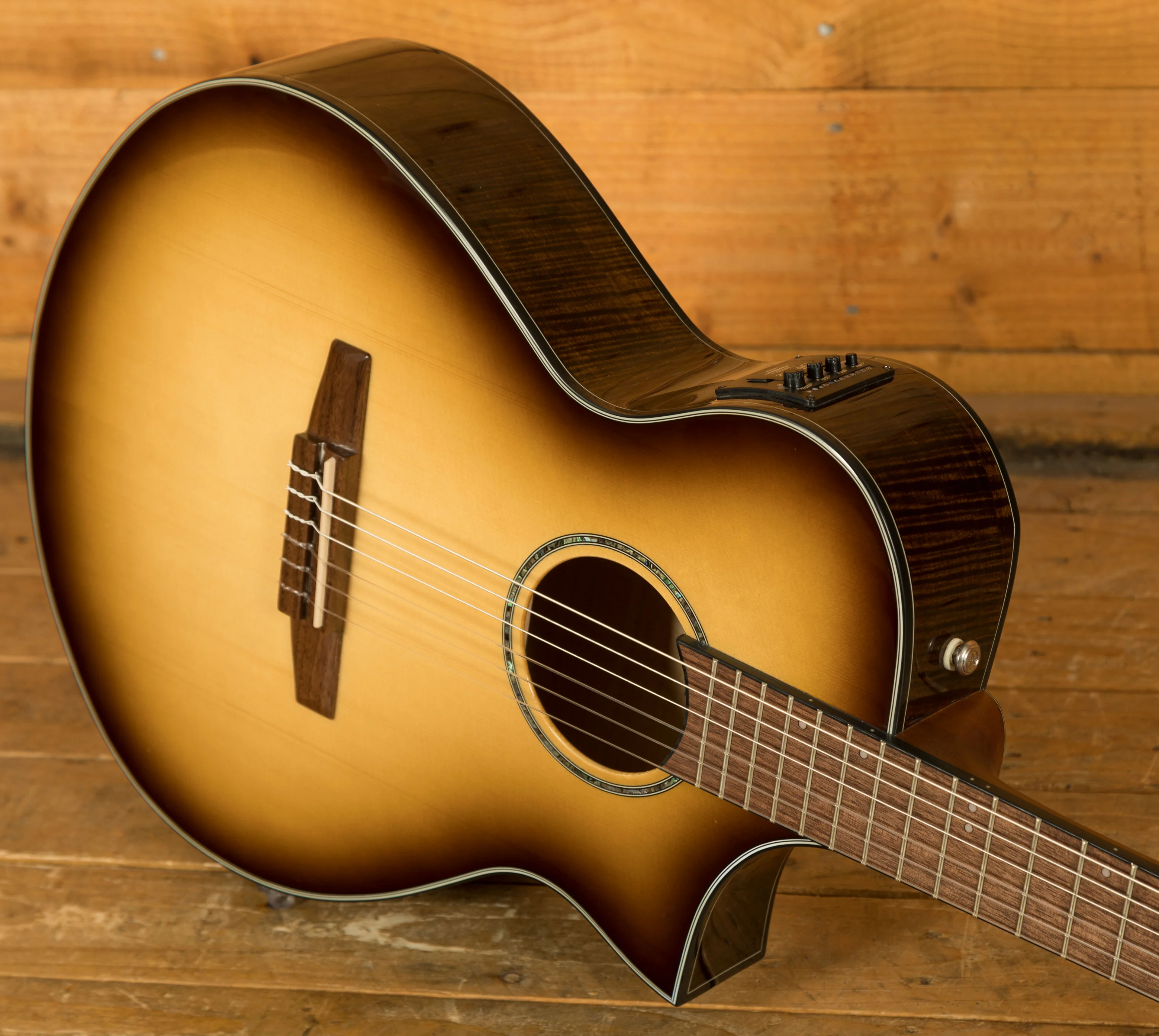 The AEWC300N is a modern nylon-string electro-acoustic designed for comfort, clarity, and stage-ready performance. Finished in Natural Browned Burst High Gloss, it features a solid Sitka spruce top paired with flamed maple back and sides for a rich, balanced tone and striking visual appeal.