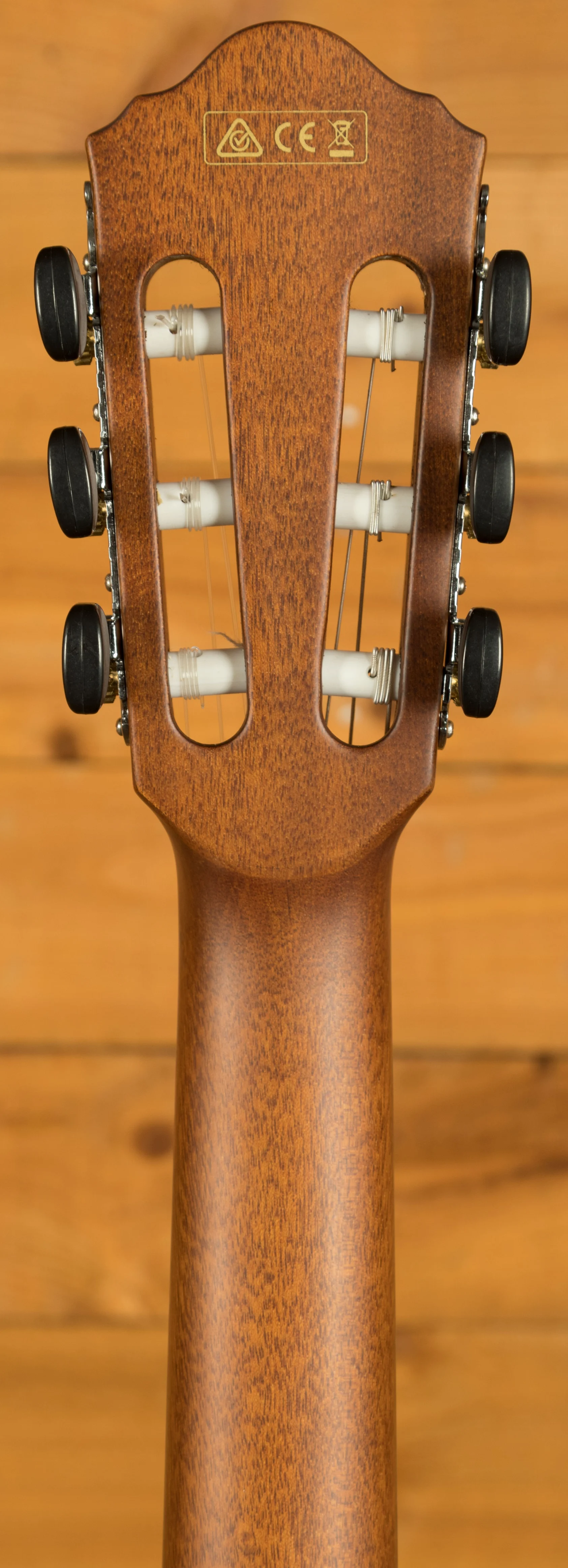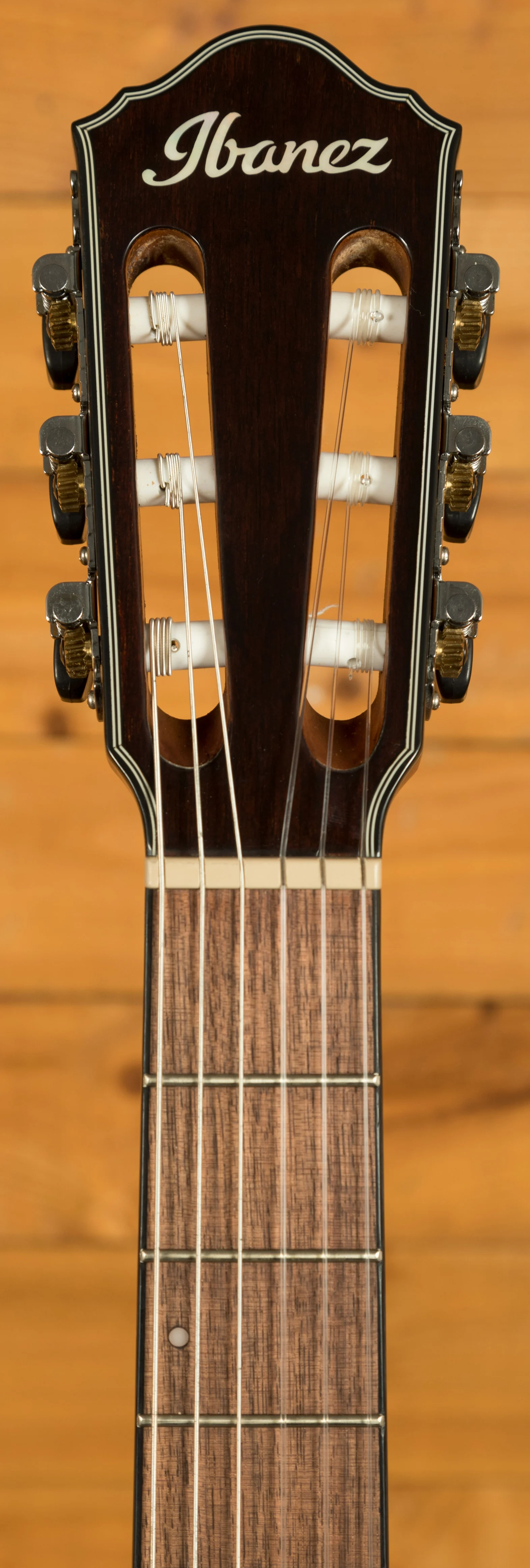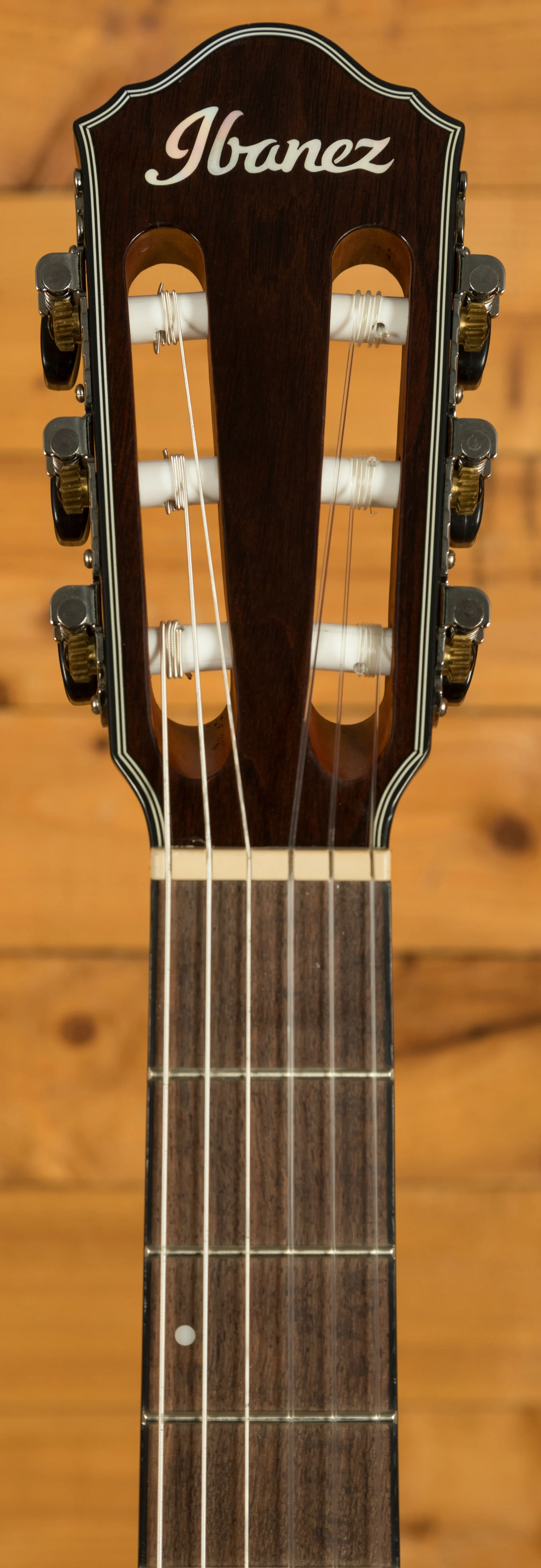 Electronics include a Fishman Sonicore undersaddle pickup and Ibanez AEQ-SP2 preamp with onboard tuner. Dual outputs (¼" and balanced XLR) provide flexible connectivity for live and studio use. Additional features include a top-loading walnut bridge with compensated plastic saddle, chrome classical tuners, and Ibanez ICLS6NT nylon strings.