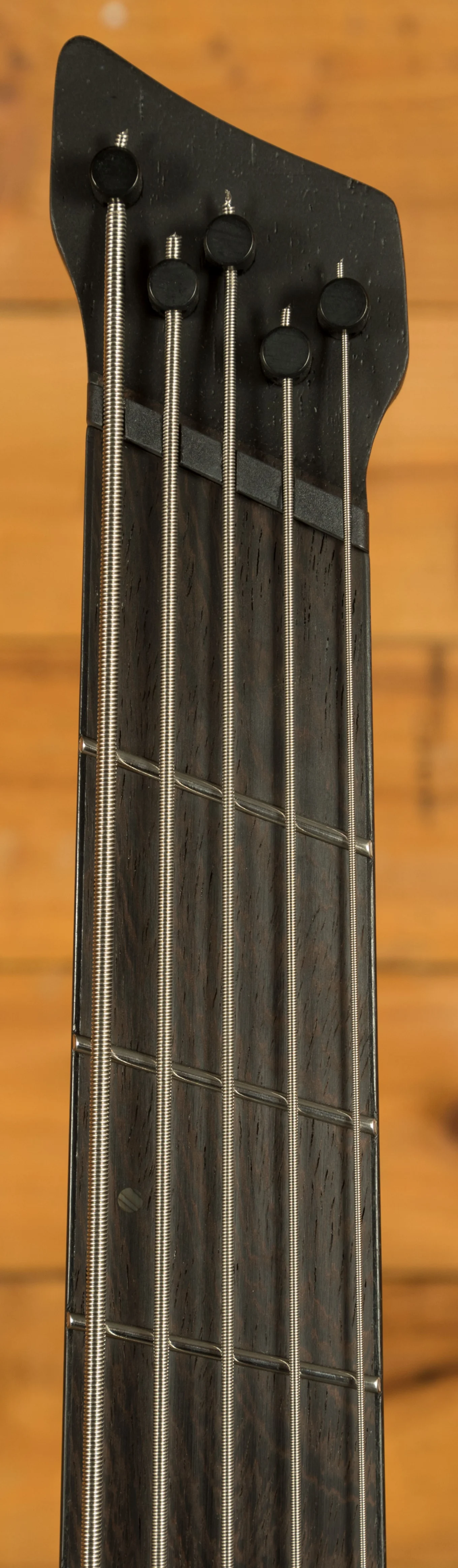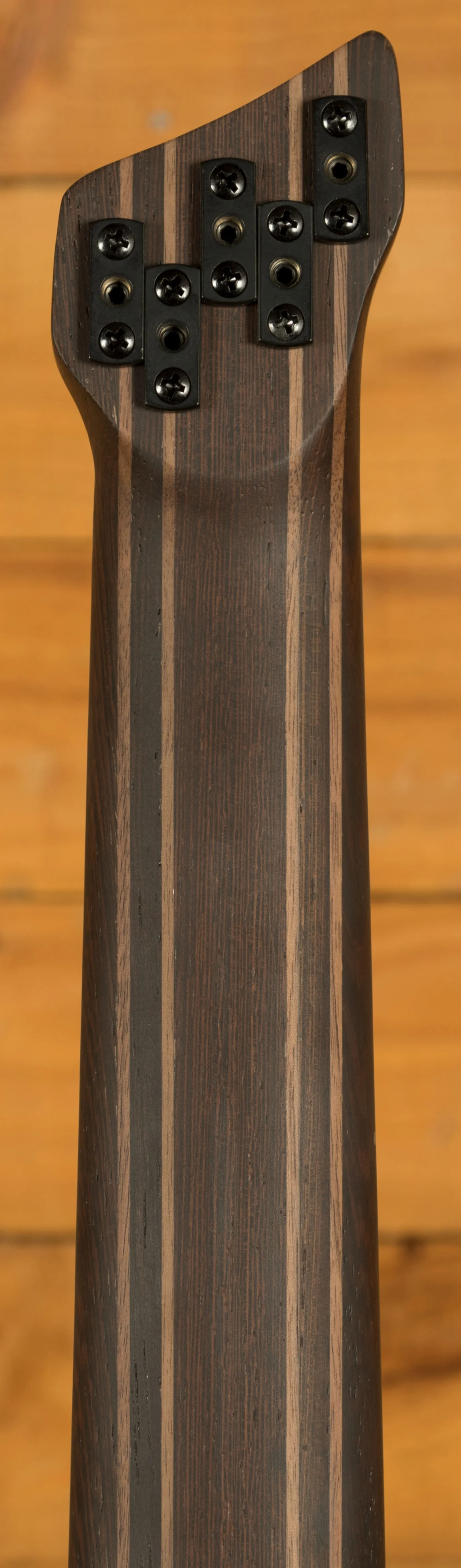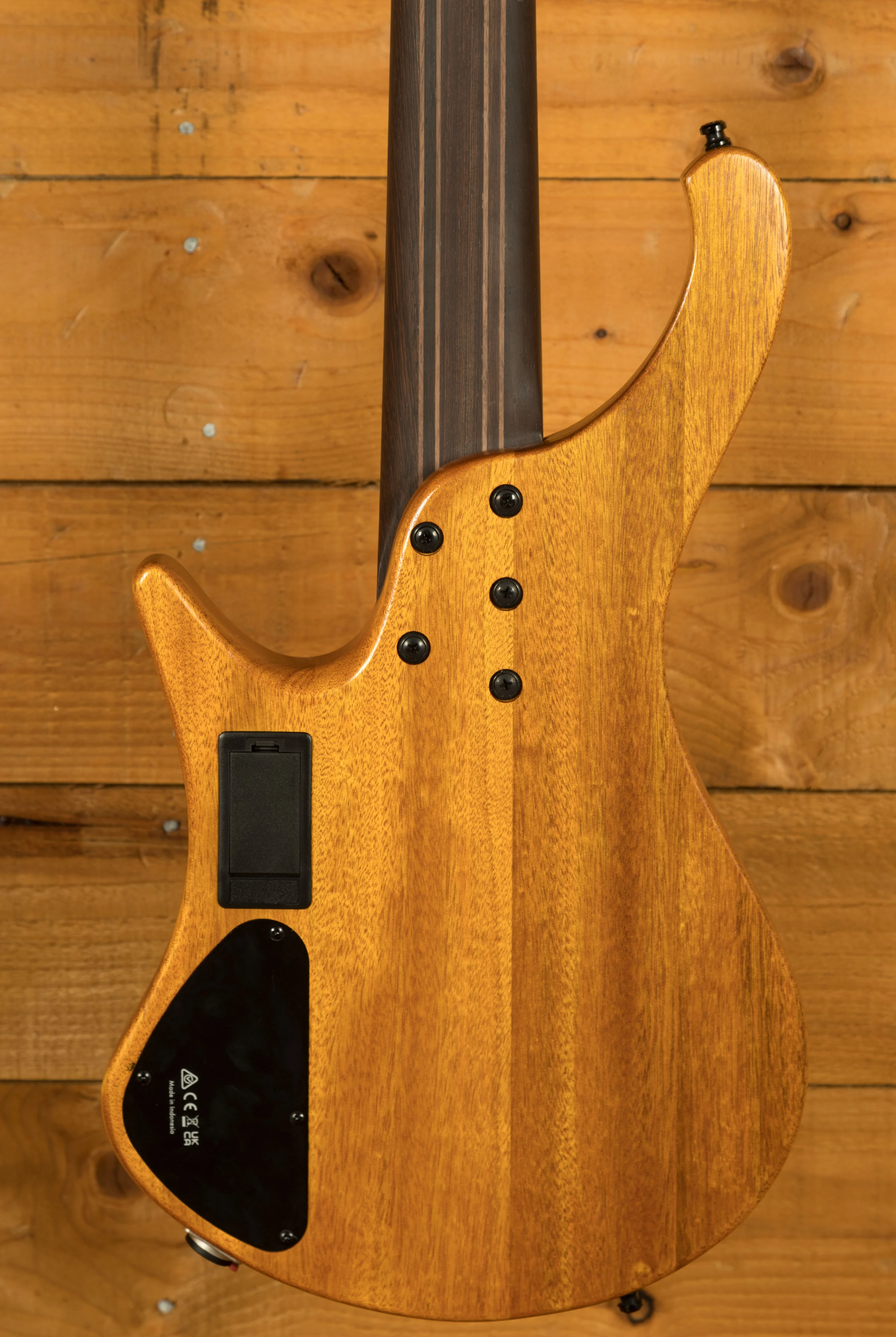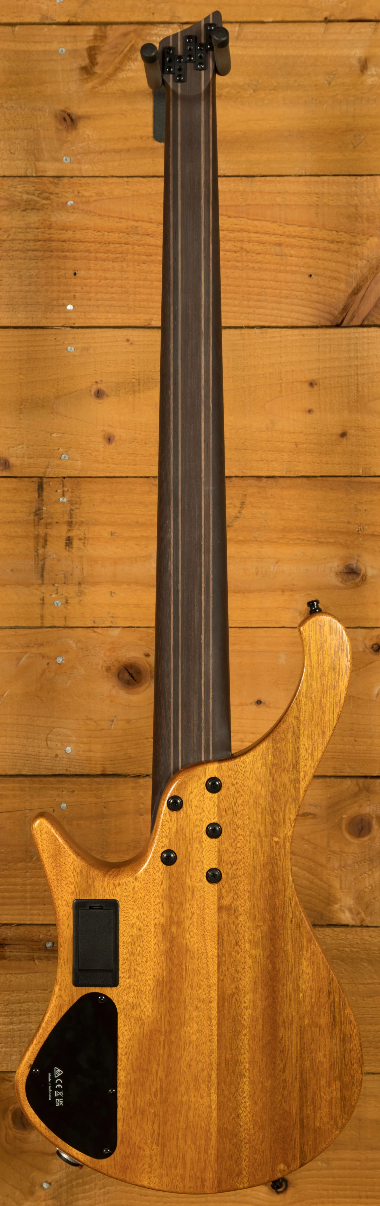 The chambered okoume body with ash top keeps weight down while enhancing resonance. The 9-piece panga panga/walnut neck features graphite reinforcement rods for added stability, paired with a bound panga panga fretboard and offset abalone dot inlays. The headless design and contoured body offer unmatched ergonomics whether seated or standing.