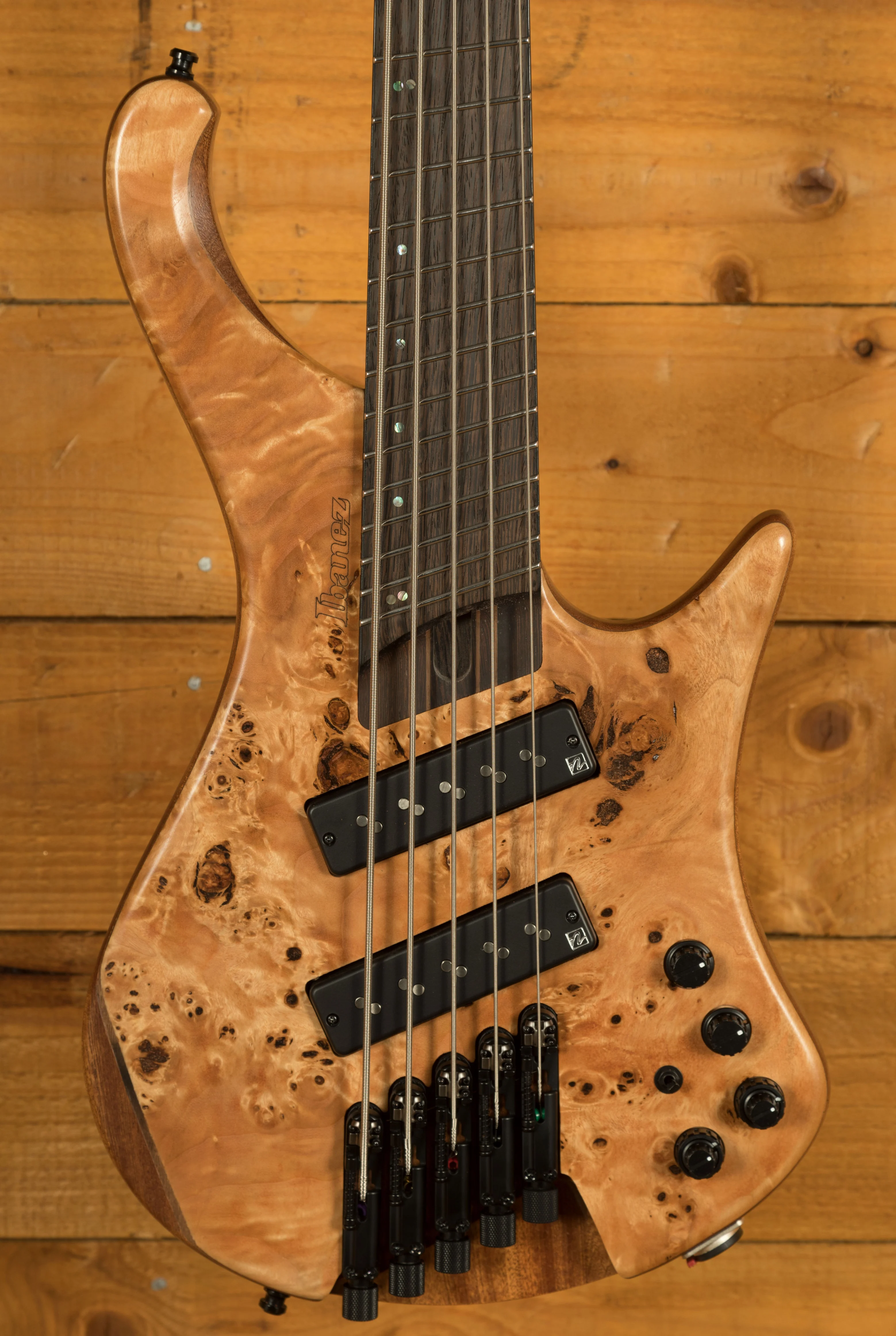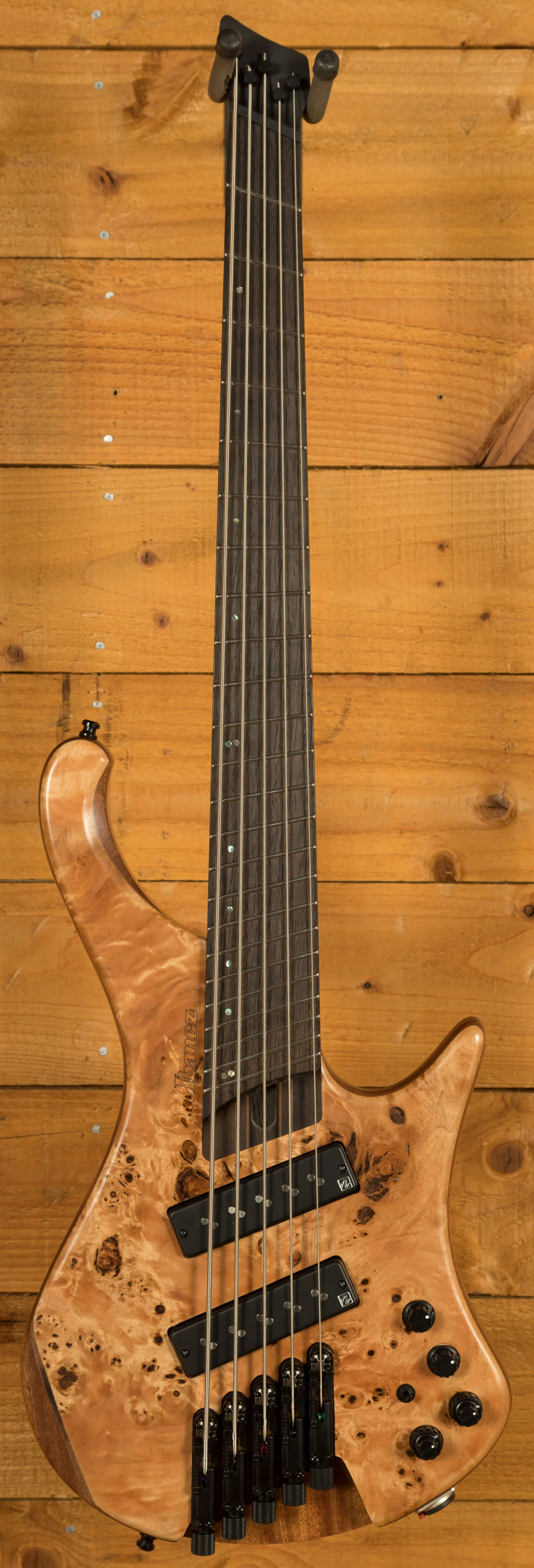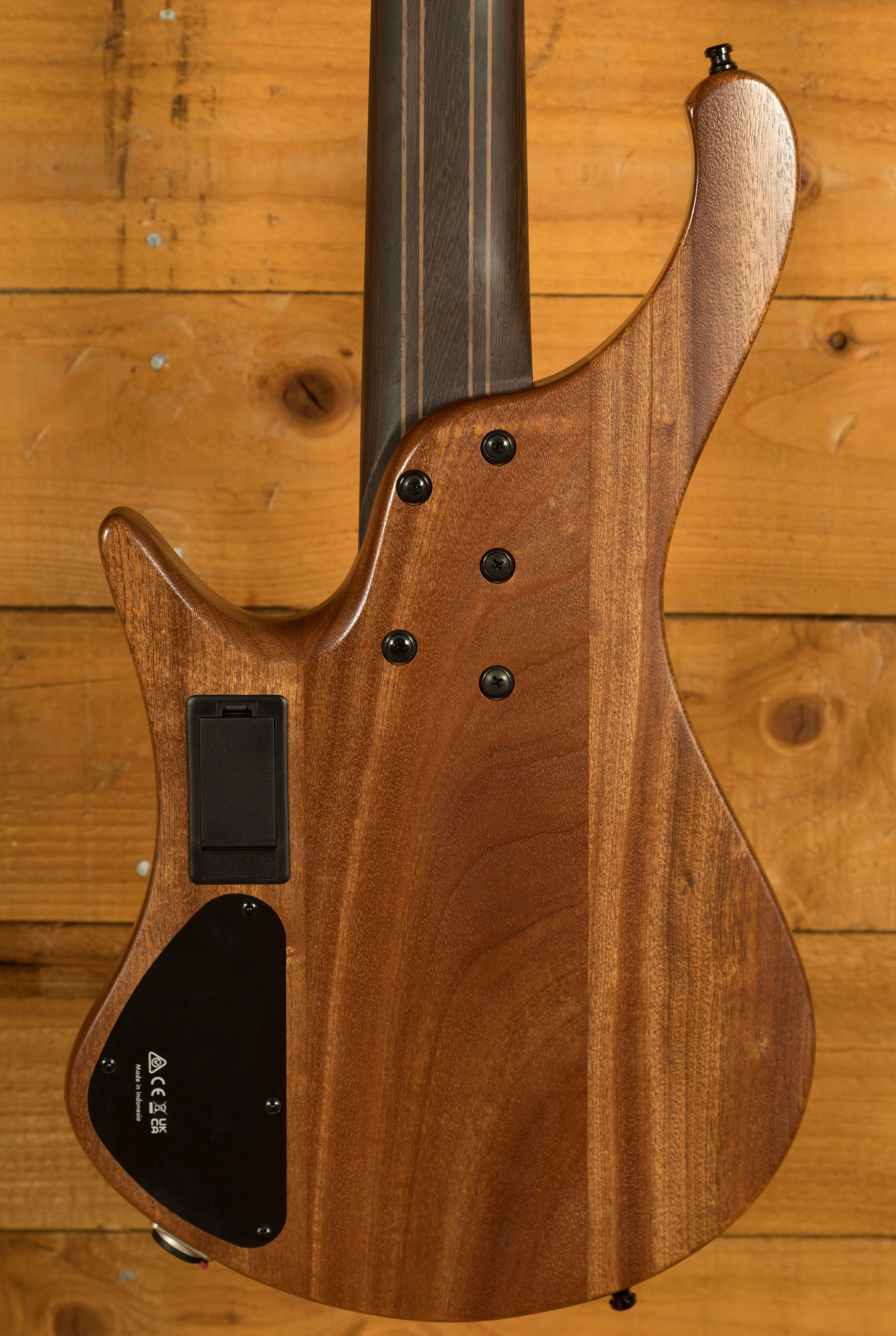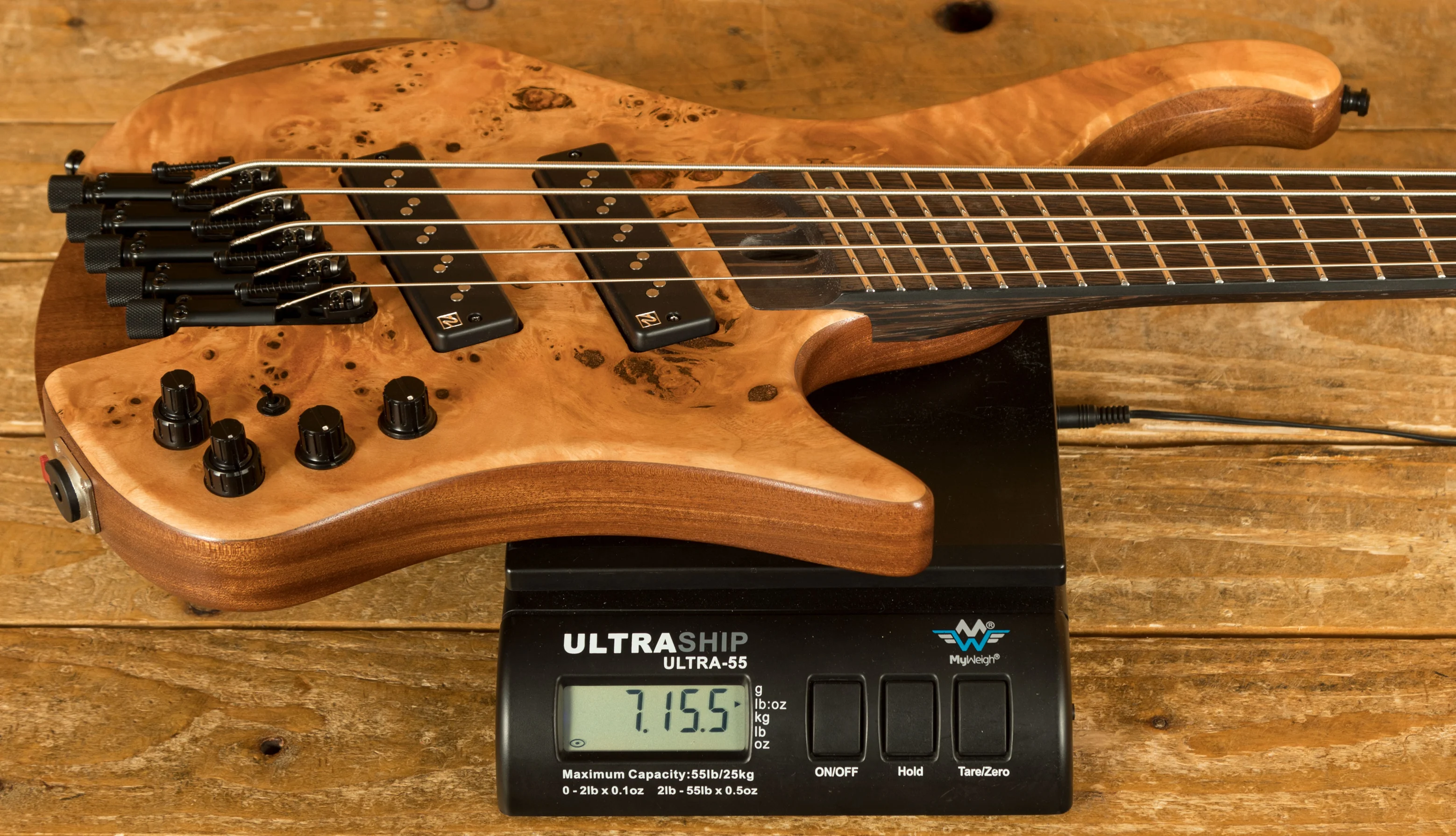 Crafted with precision, the Poplar Burl top and selected lightweight African Mahogany body contribute to a warm tone with rich resonance. The 9-piece Panga Panga/Walnut neck, reinforced with graphite rods, enhances note attack, provides tight lows, and increases sustain, complemented by the Panga Panga fretboard with its beautiful wood grain. The Nordstrand Big Split custom pickups, featuring hum-cancelling construction, offer a hybrid P/J style tone characterised by richness and balance, fitting well with various playing styles. The bass also features a Vari-Mid 3-Band EQ with an EQ bypass switch, providing a wide range of tonal options. The MR5HS mono rail bridge, designed for EHB basses, ensures wide intonation range, with adjustable saddles catering to individual string spacing preferences. Schaller S-Locks strap pins and a Neutrik locking jack secure the strap and cable, while the detachable Finger ramp adds comfort for fingerpicking.
