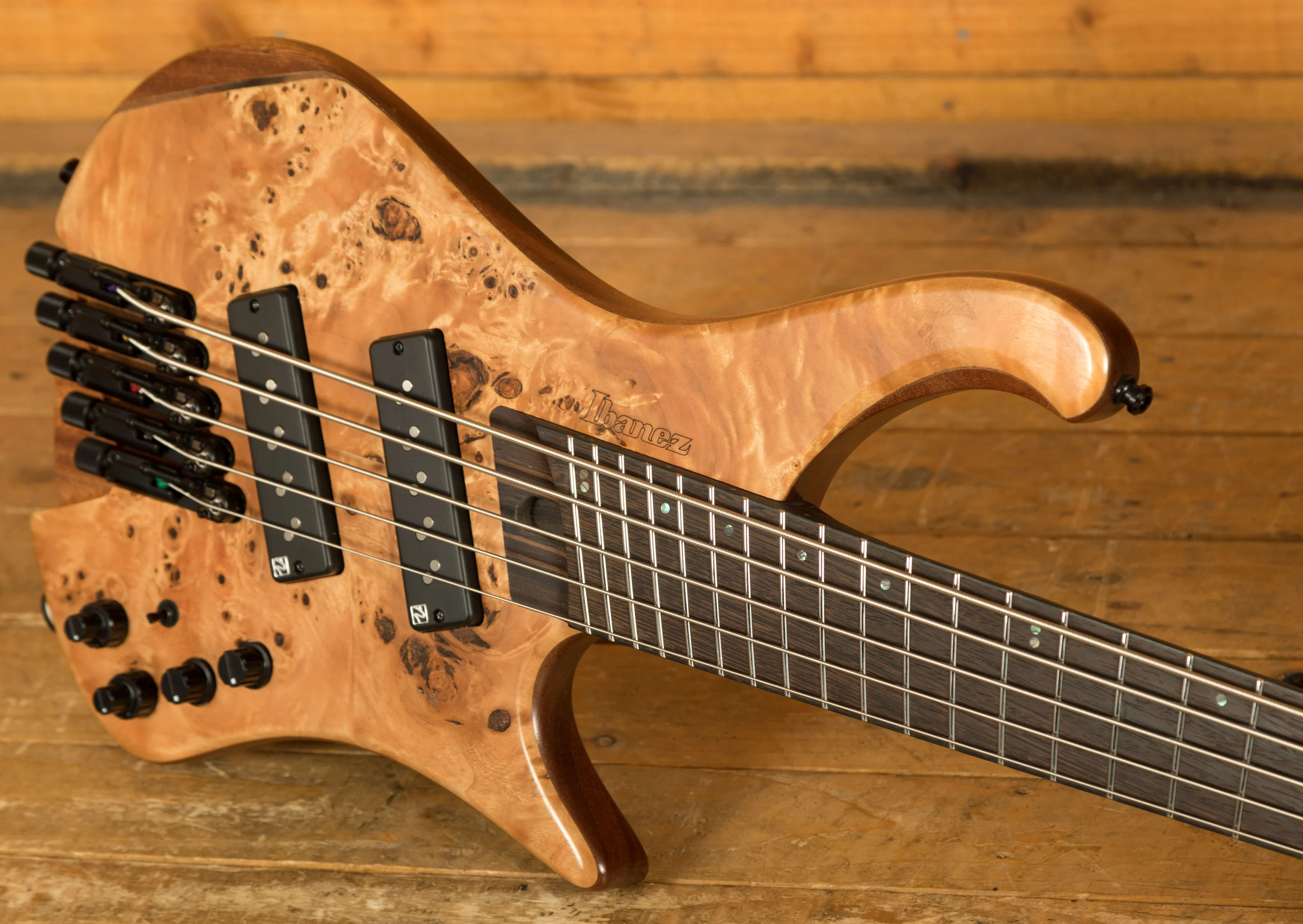 The Ibanez EHB1505SMS stands out as a pinnacle of bass innovation, featuring a multi-scale design with a range of 32" to 30", diverging from the standard 35" to 33". This unique size comparison caters to players seeking enhanced playability and comfort. The bass boasts an ergonomic body design with headless construction, allowing players to maintain a consistent playing position whether seated or standing. The slanted body back, coupled with a comfortably rounded edge and chambered body, results in a lightweight, well-balanced instrument perfect for extended playing sessions.