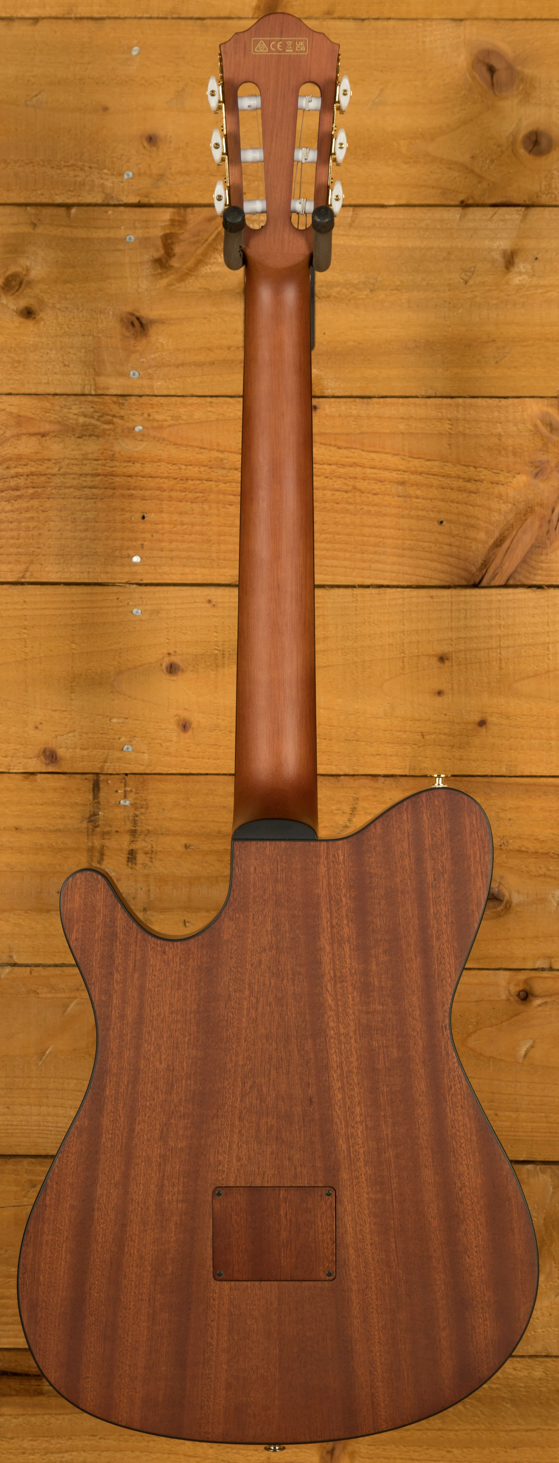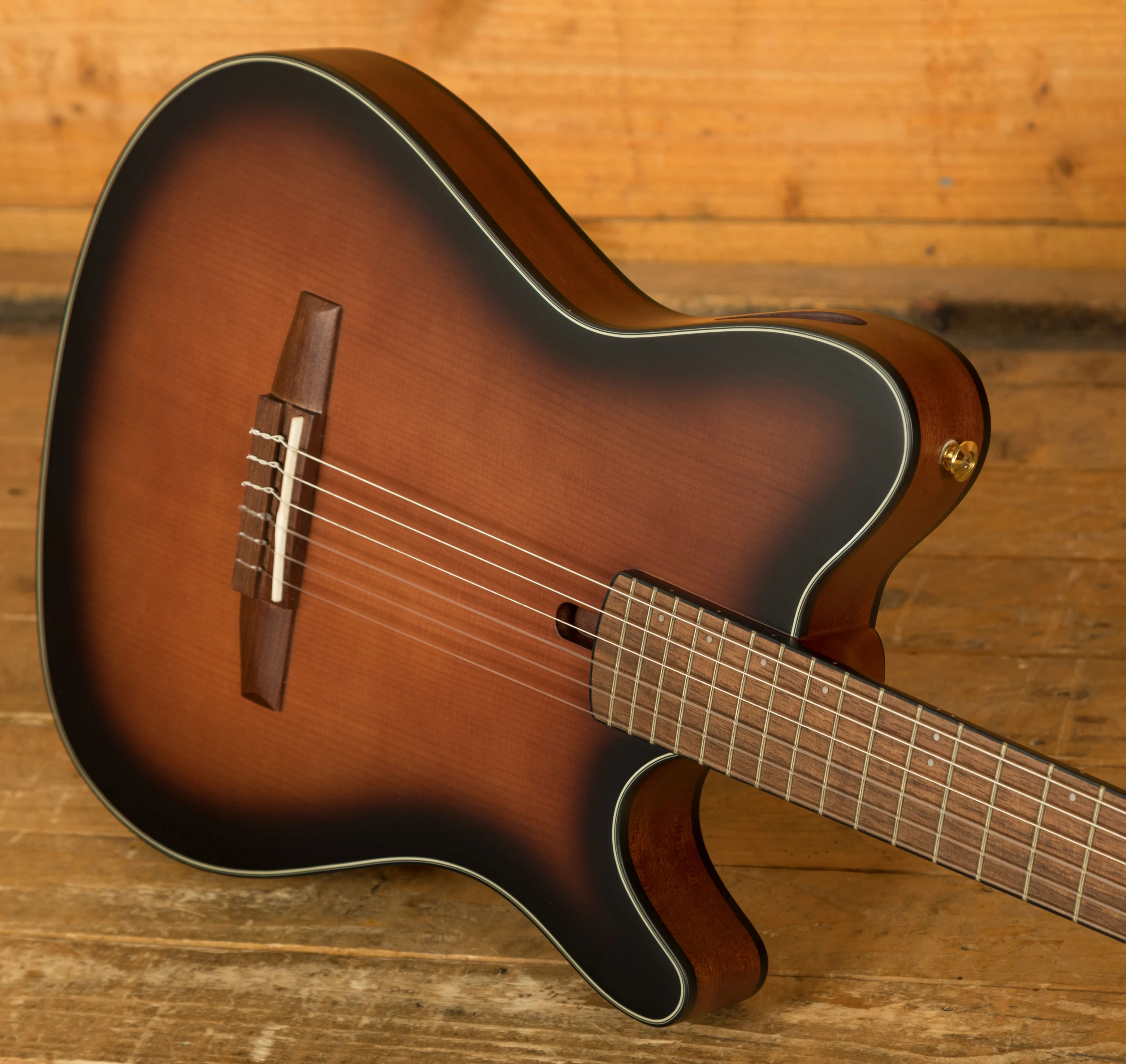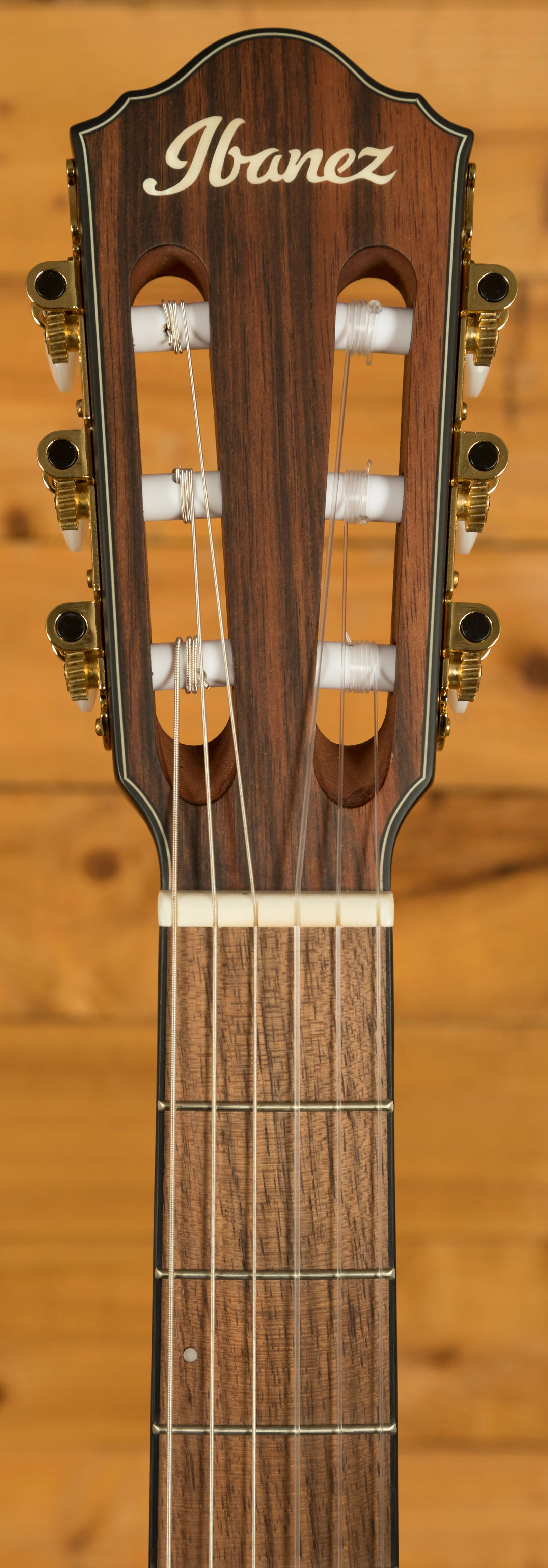 The Walnut bridge transfers its natural and warm tone from the string vibrations directly to the body, which can be authentically felt and heard through the side sound port. The benefits of a side sound port over a front facing sound port is the considerably less feedback whilst using the Ibanez T-bar Undersaddle Pickup. This means that you can even play this nylon-string as if it were a steel-string electric; you can now experience the unique tone of nylon-strings through an overdriven amp right here at Peach Guitars.