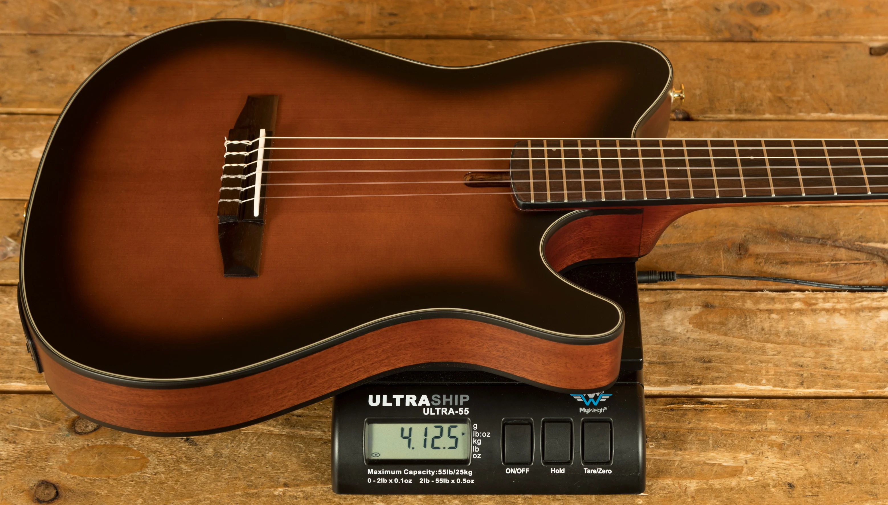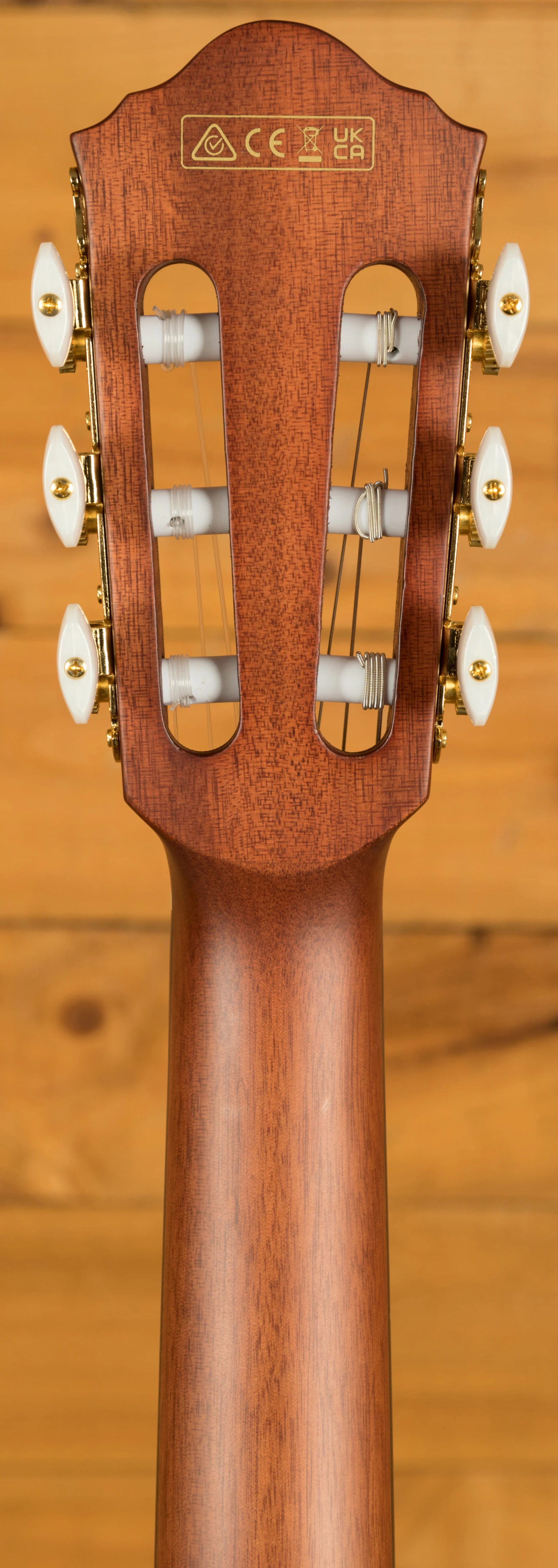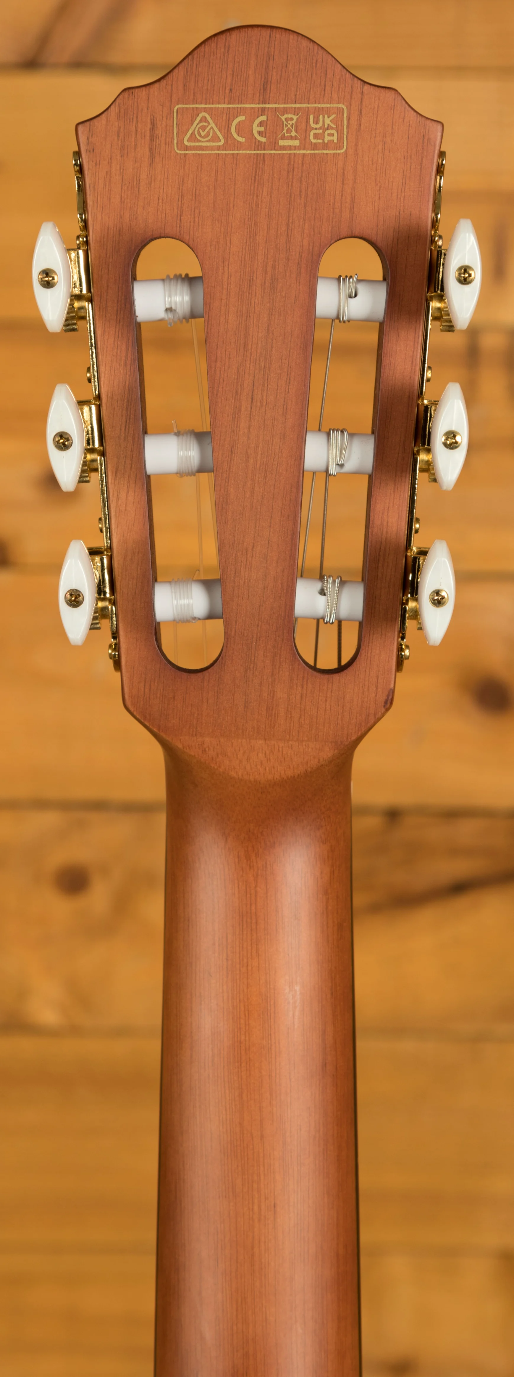The Walnut bridge transfers its natural and warm tone from the string vibrations directly to the body, which can be authentically felt and heard through the side sound port. The benefits of a side sound port over a front facing sound port is the considerably less feedback whilst using the Ibanez T-bar Undersaddle Pickup. This means that you can even play this nylon-string as if it were a steel-string electric; you can now experience the unique tone of nylon-strings through an overdriven amp right here at Peach Guitars.