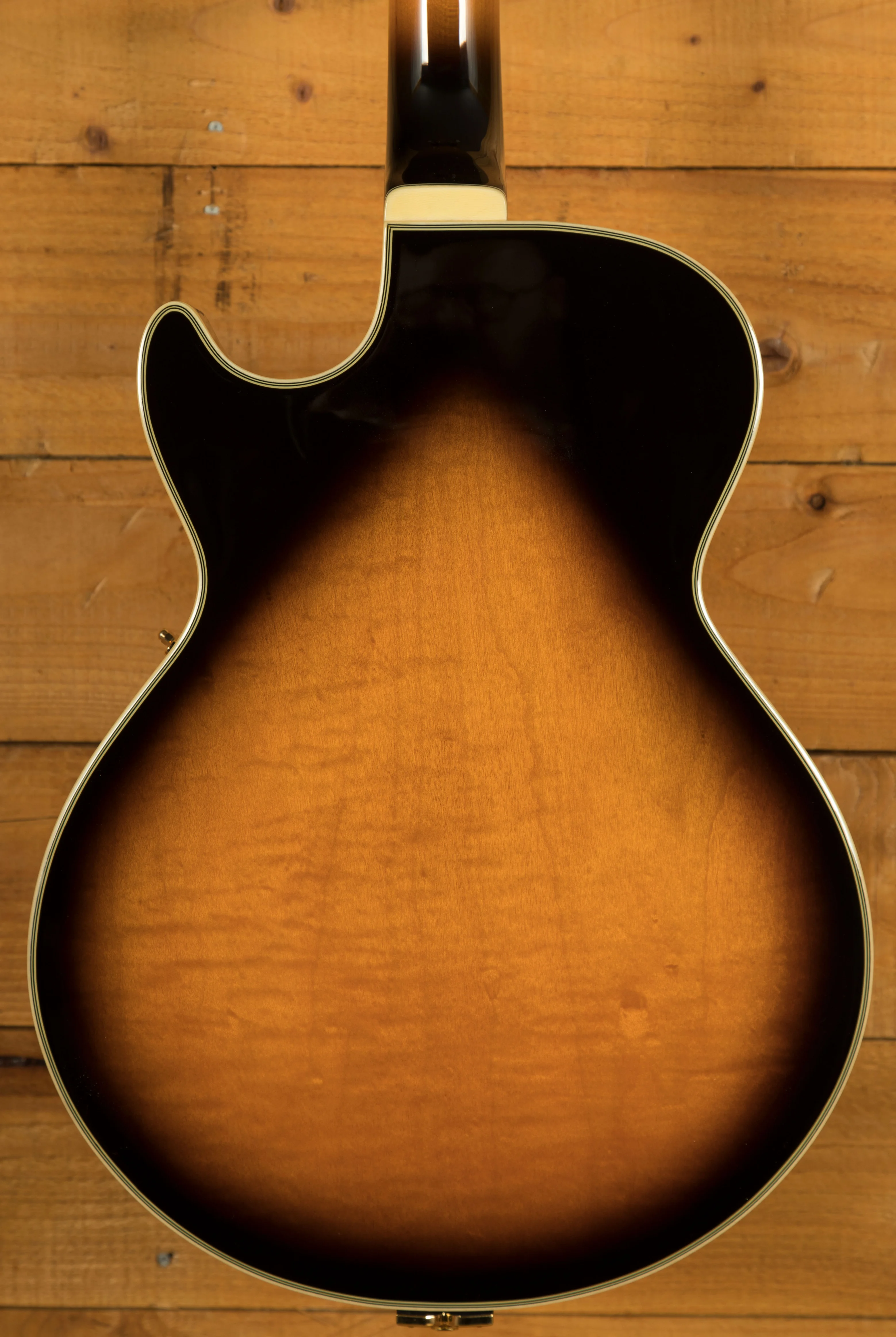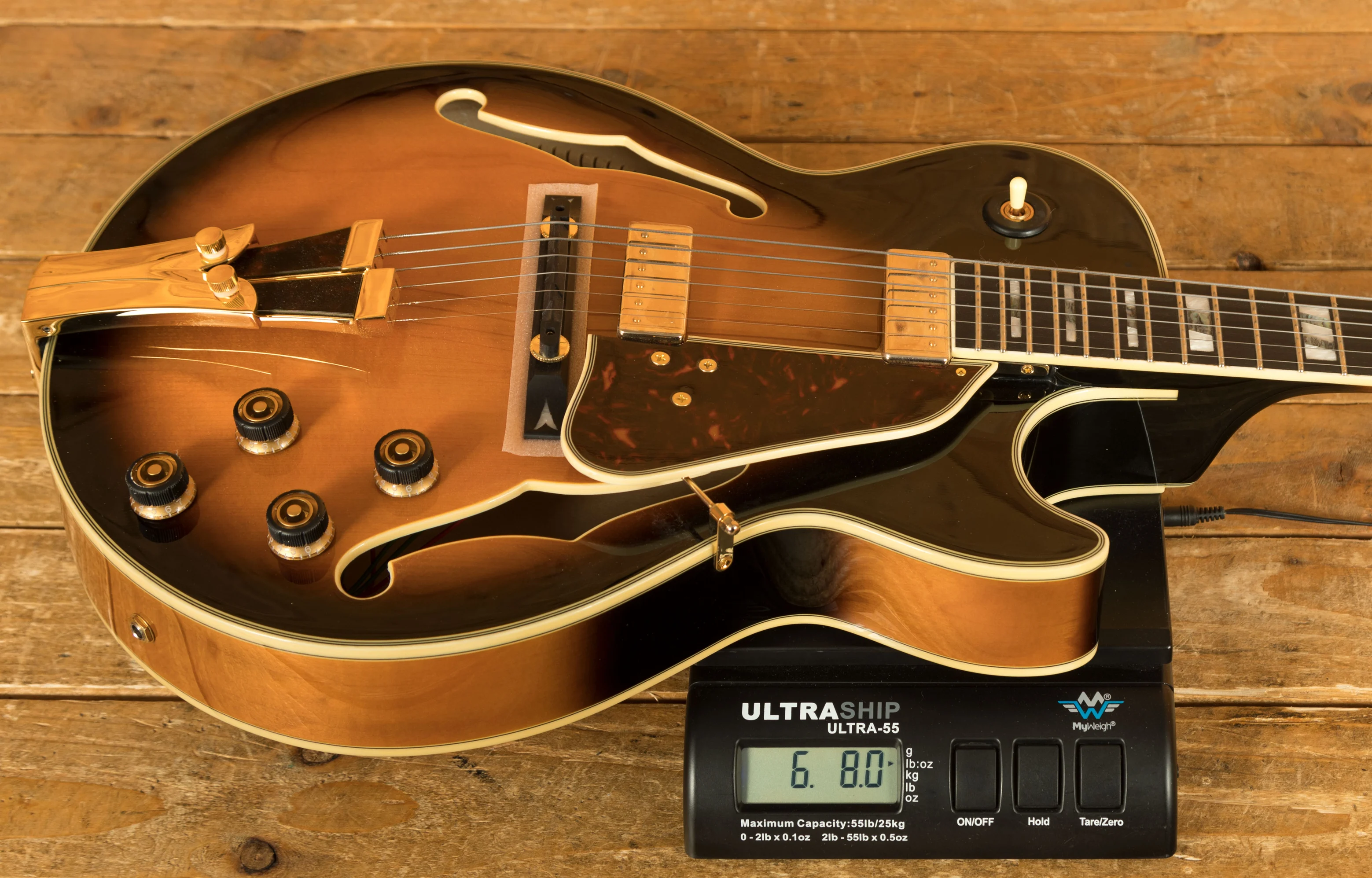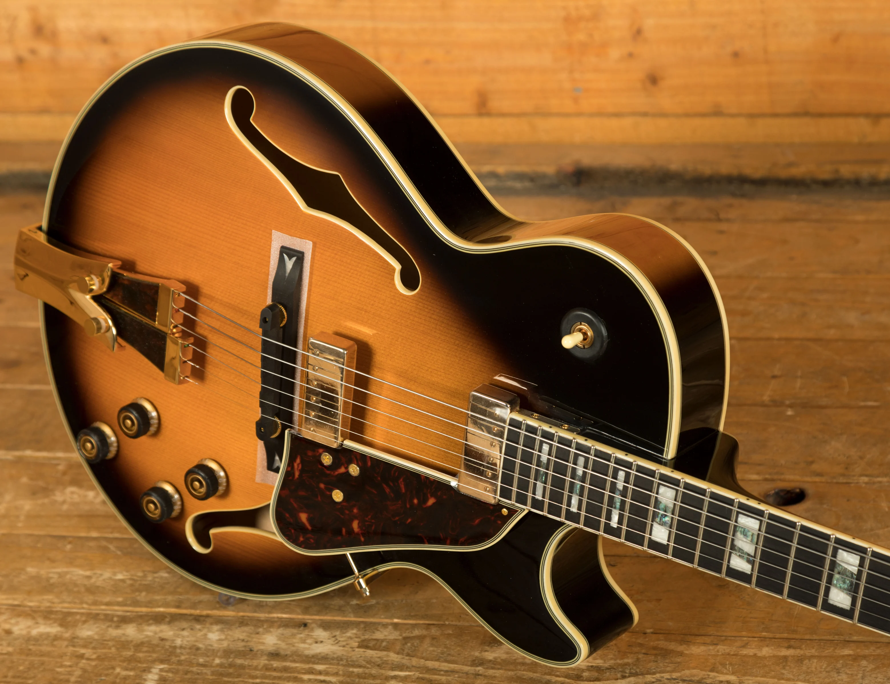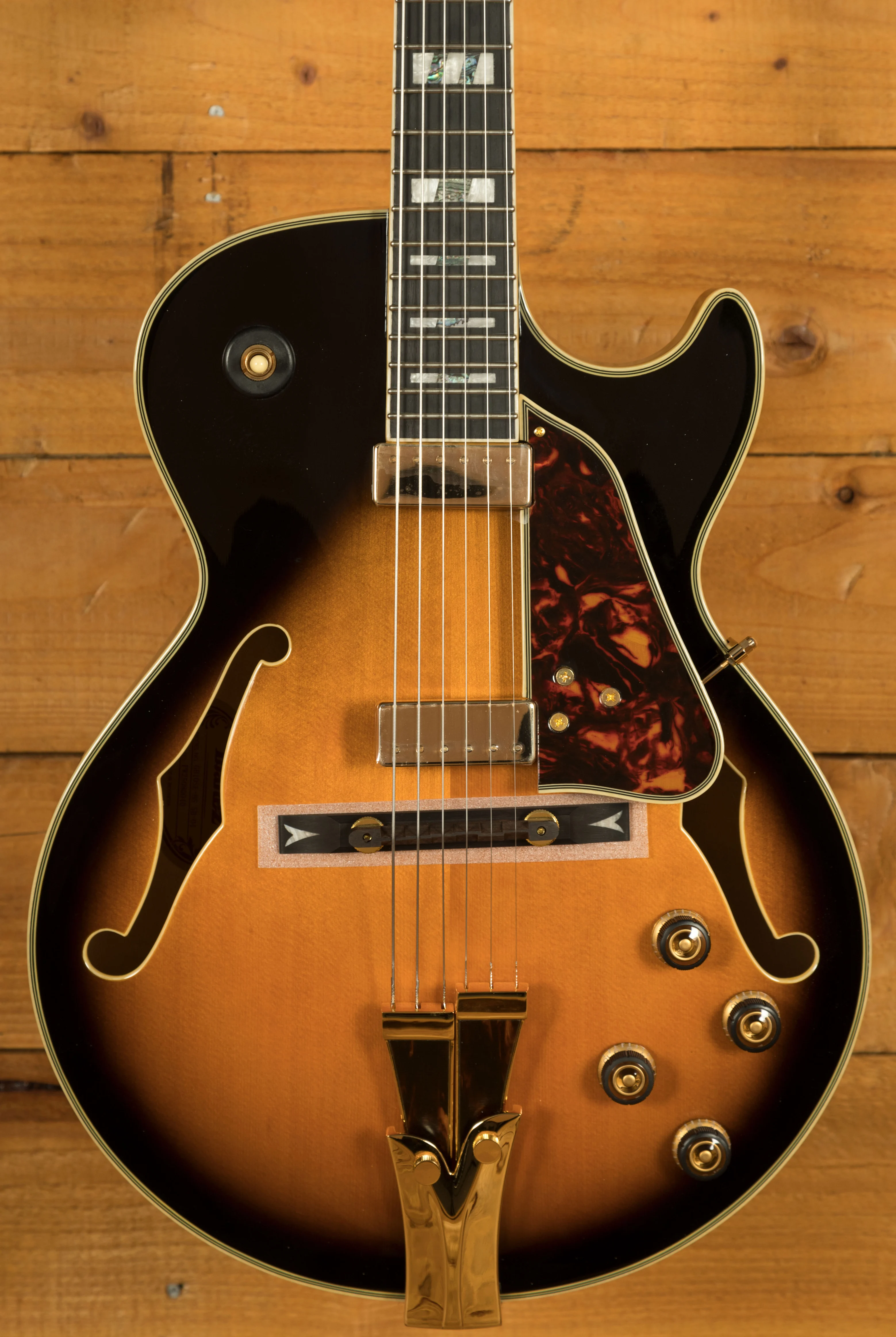 It looks really beautiful with multi-layer binding, plenty of aesthetic inlays, gold hardware and a great looking tortoiseshell pickguard and tailpiece inlays.