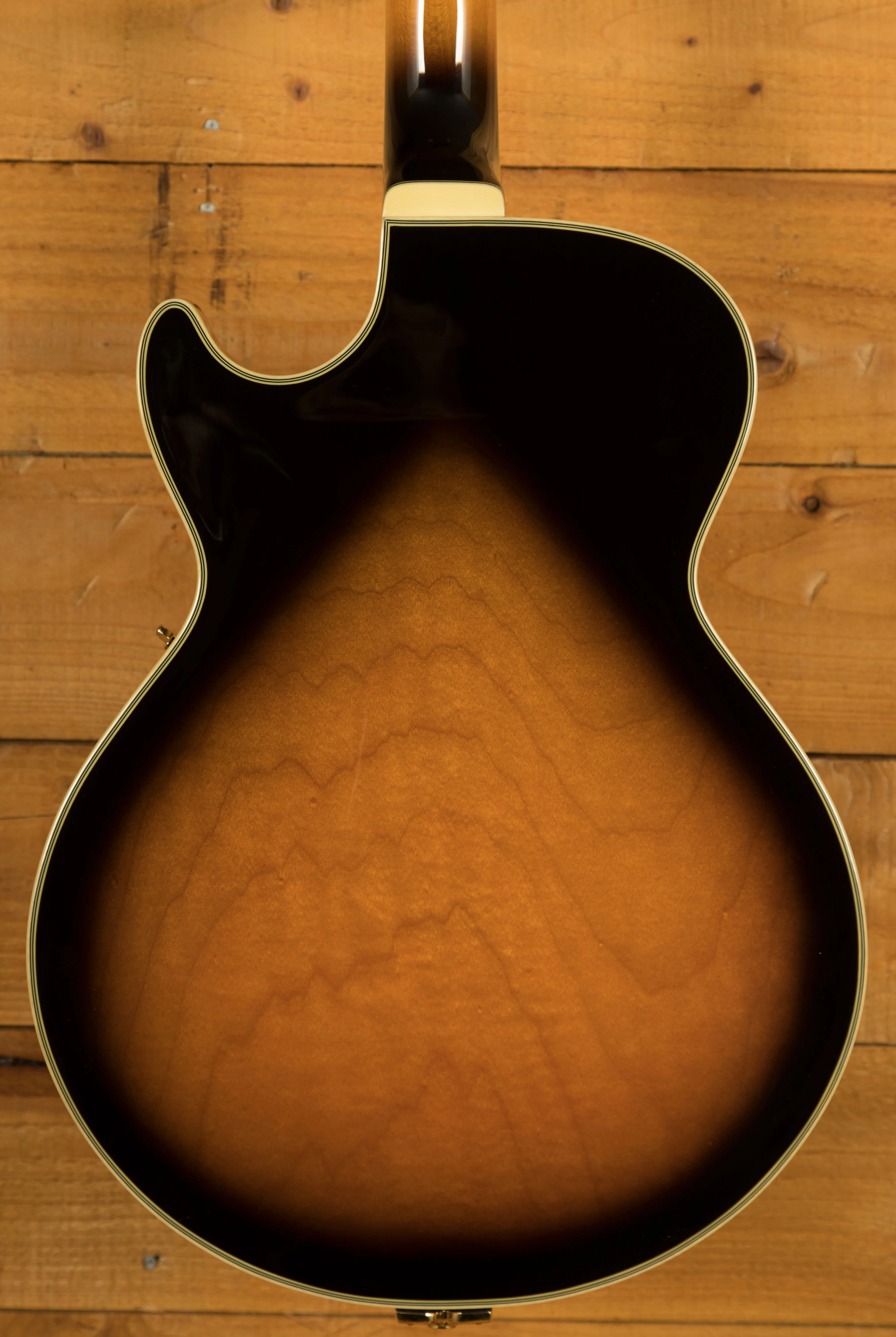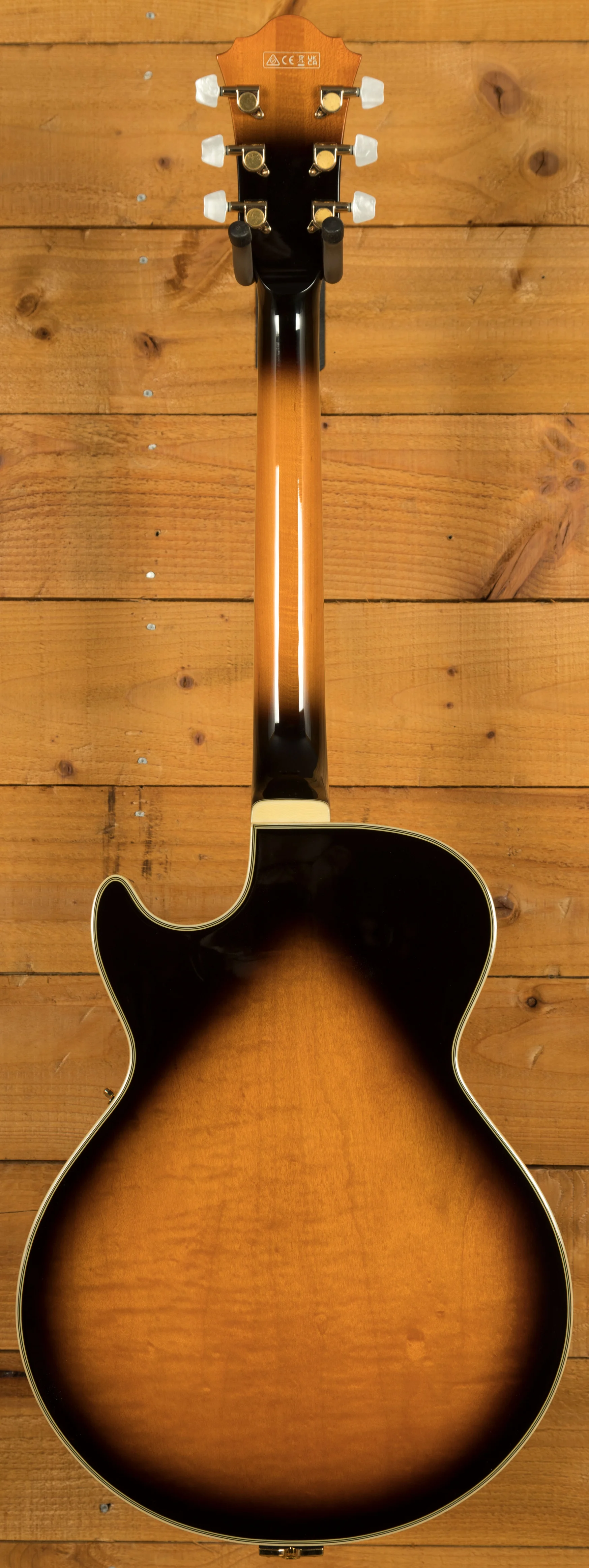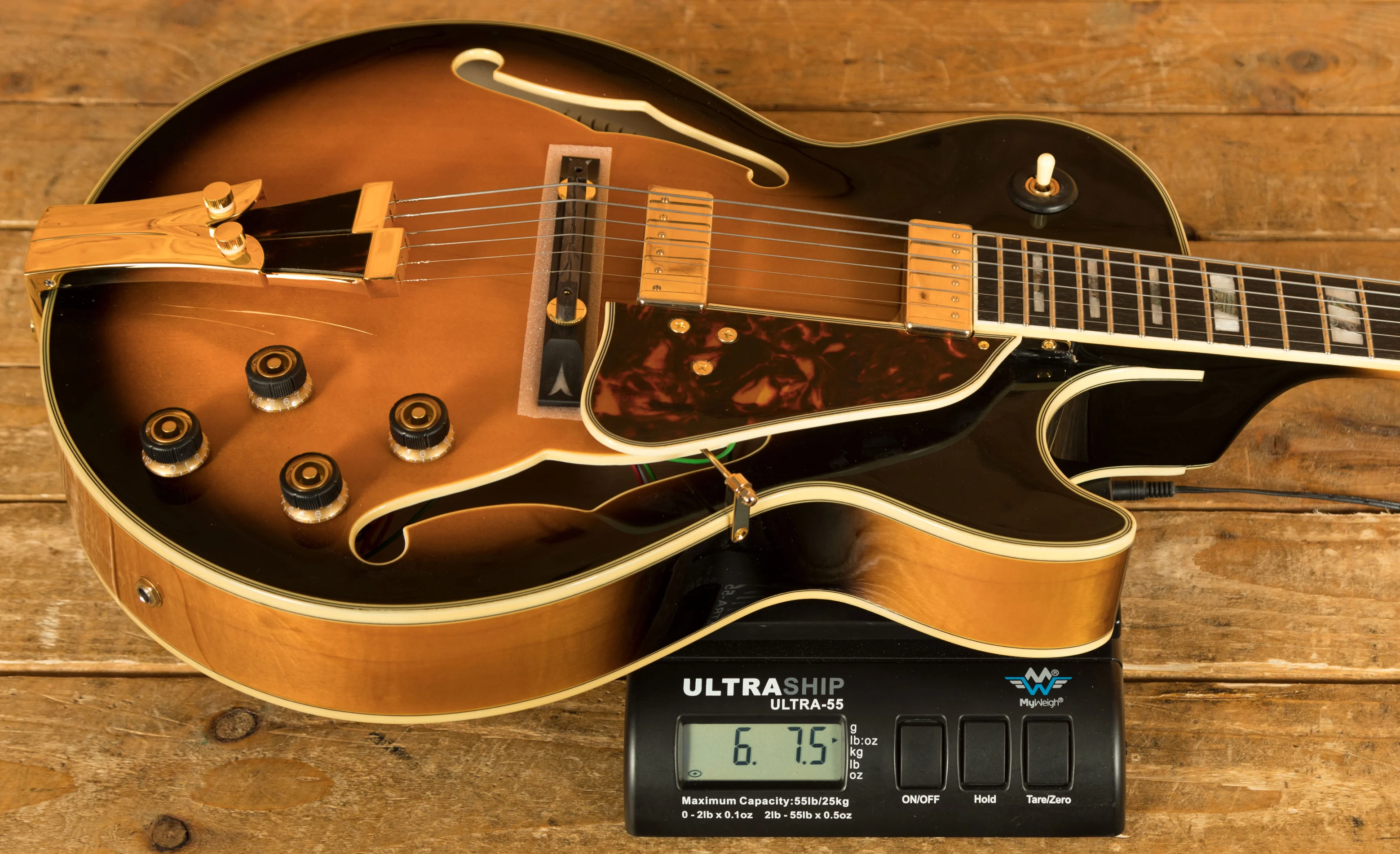 It looks really beautiful with multi-layer binding, plenty of aesthetic inlays, gold hardware and a great looking tortoiseshell pickguard and tailpiece inlays.
