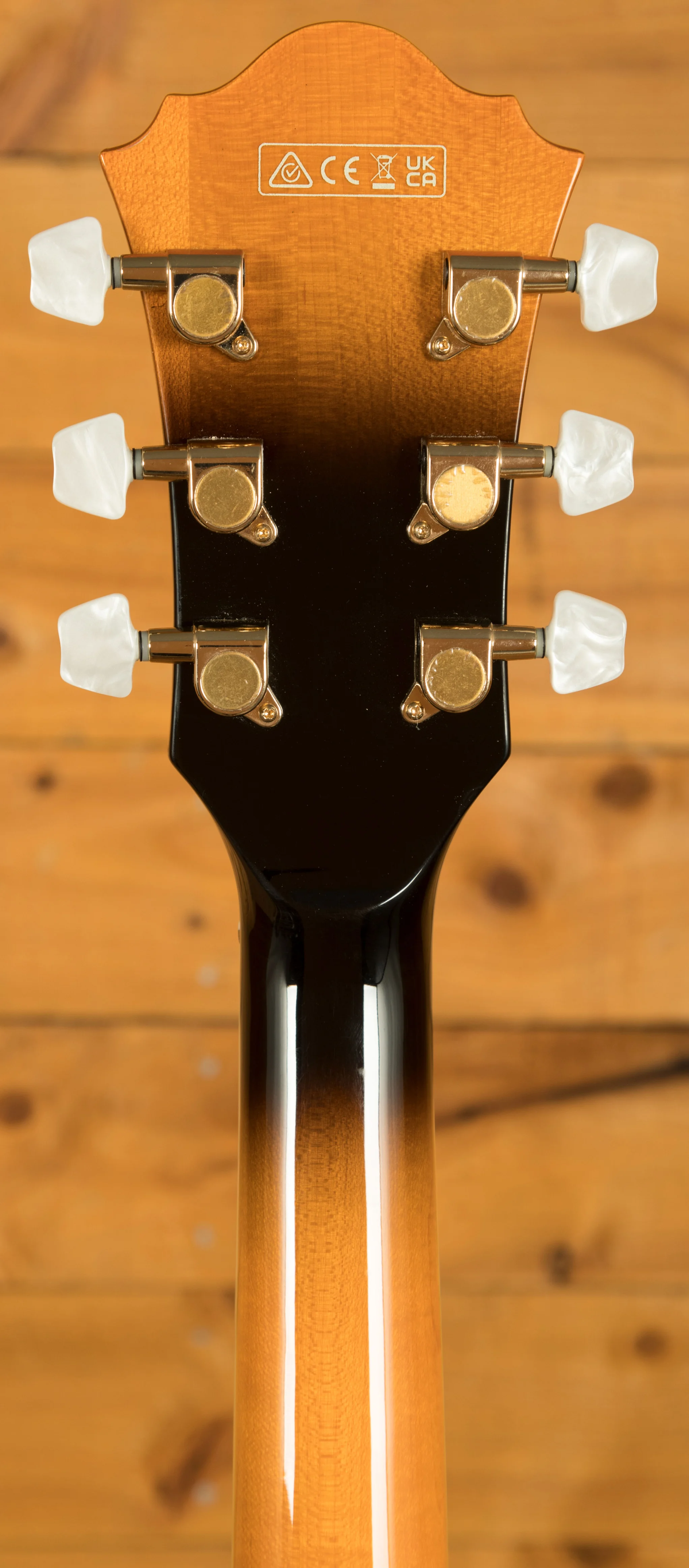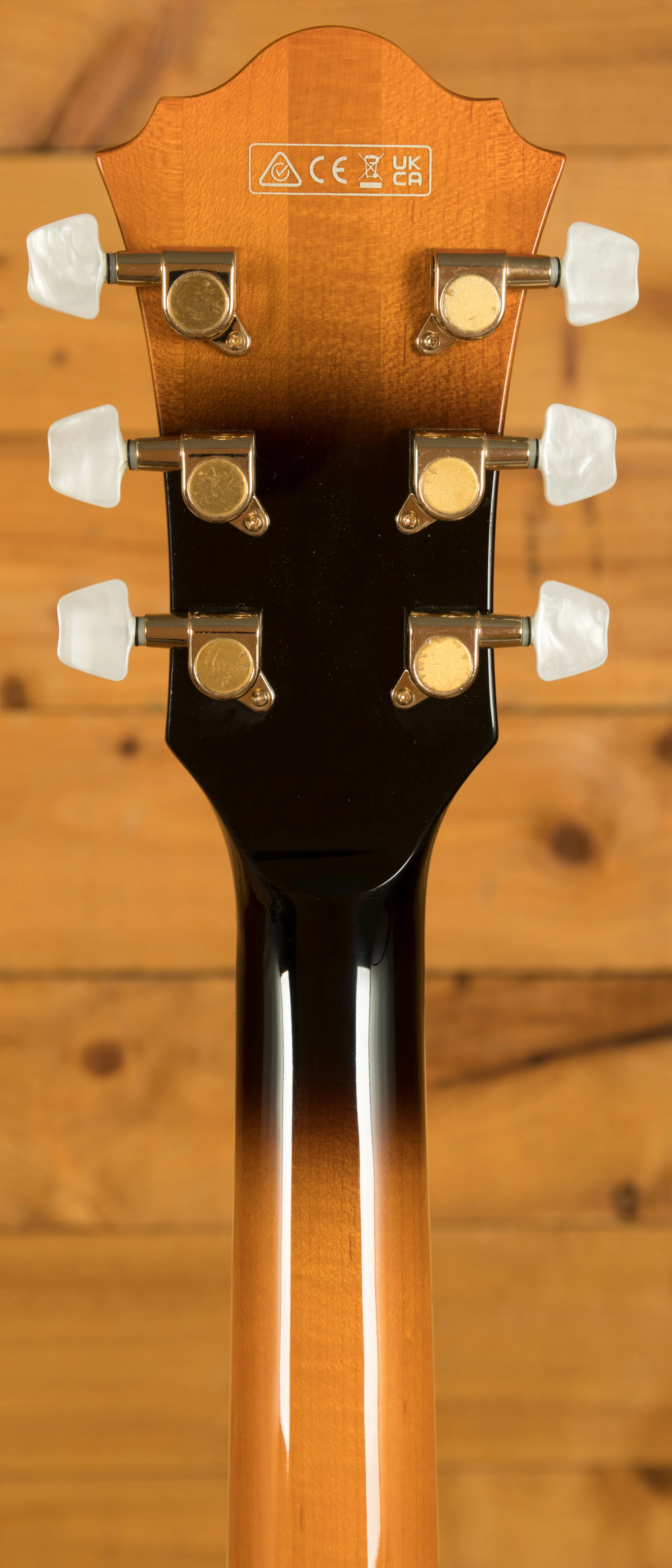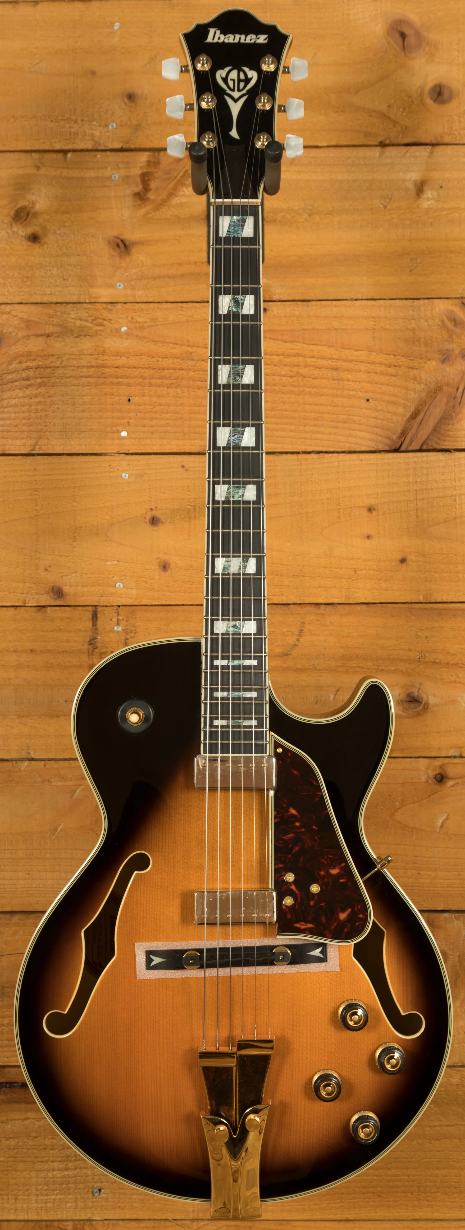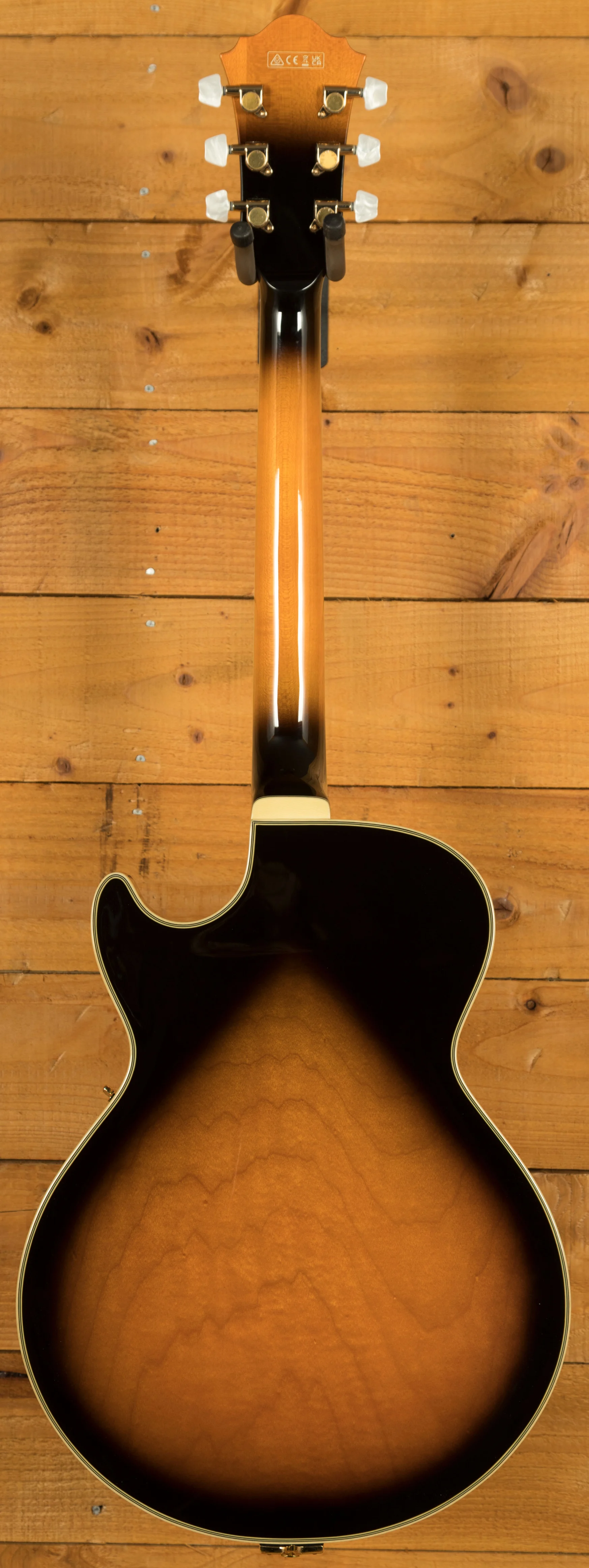 It looks really beautiful with multi-layer binding, plenty of aesthetic inlays, gold hardware and a great looking tortoiseshell pickguard and tailpiece inlays.