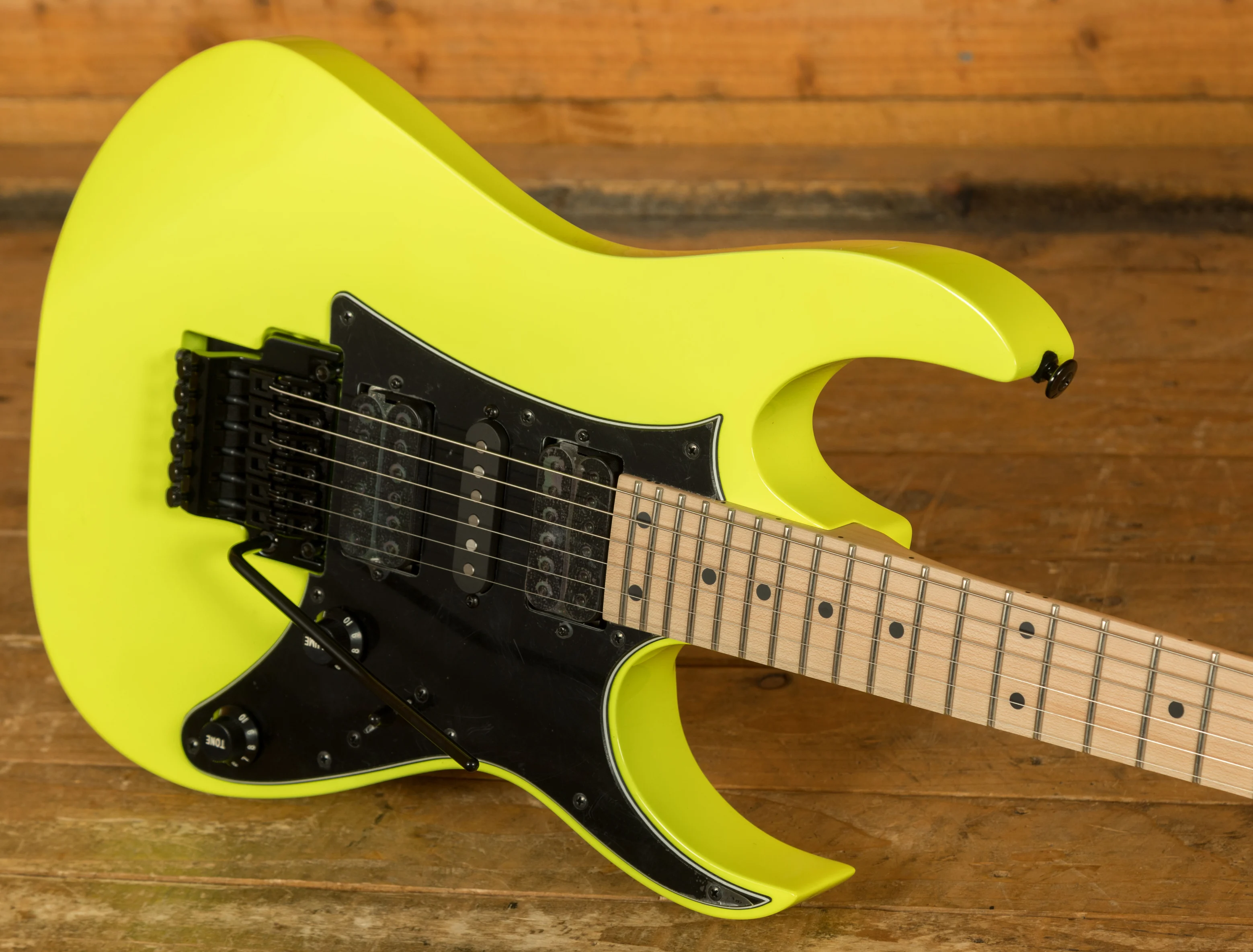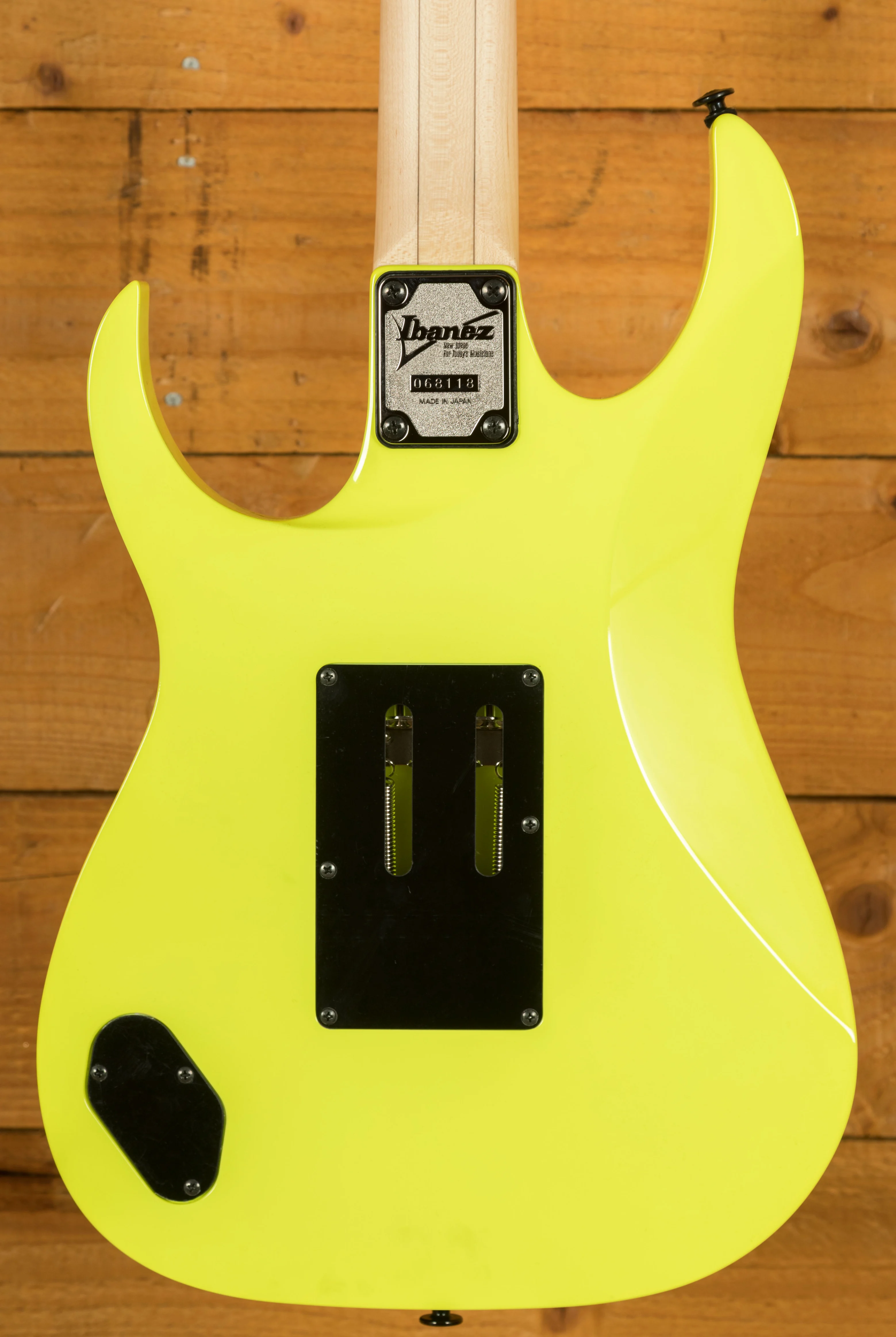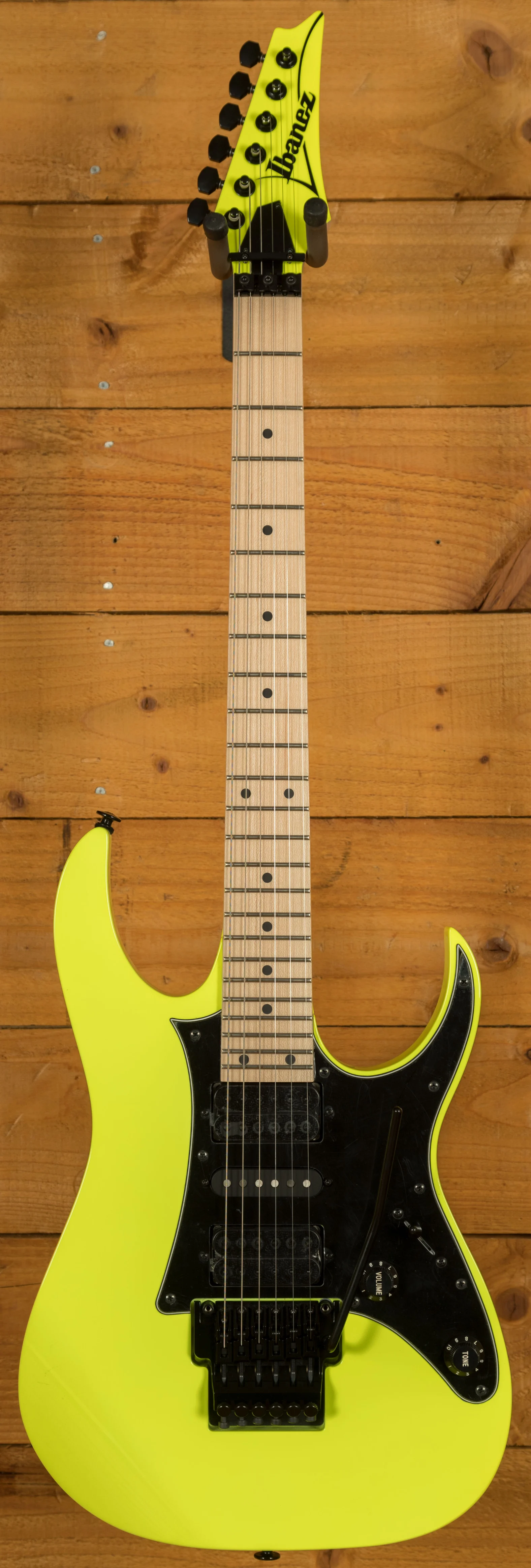 A 5 piece Maple/Walnut Super Wizard neck is adorned with a Maple fingerboard with black dot inlays. It's designed for speed and precision, perfect for today's metal players.