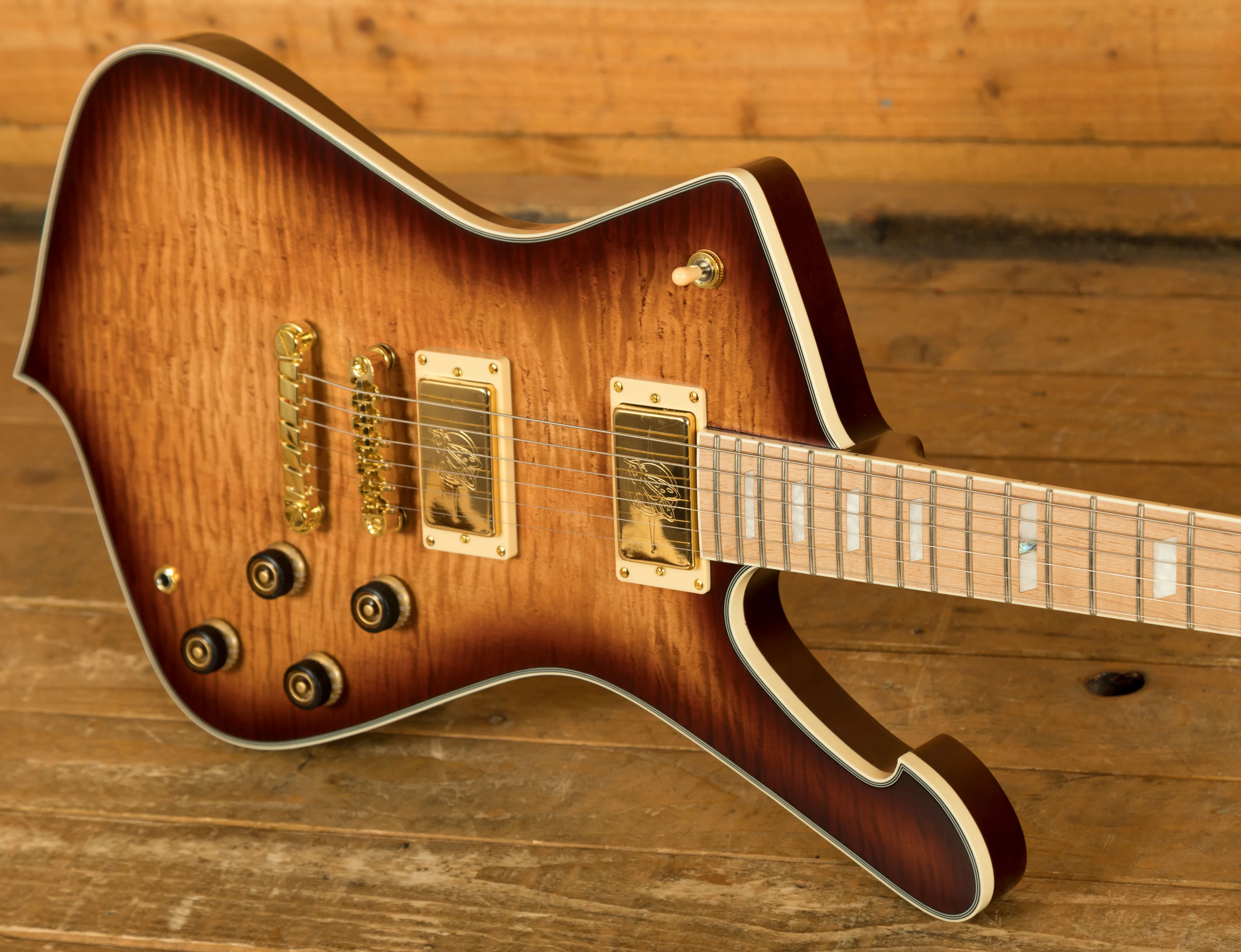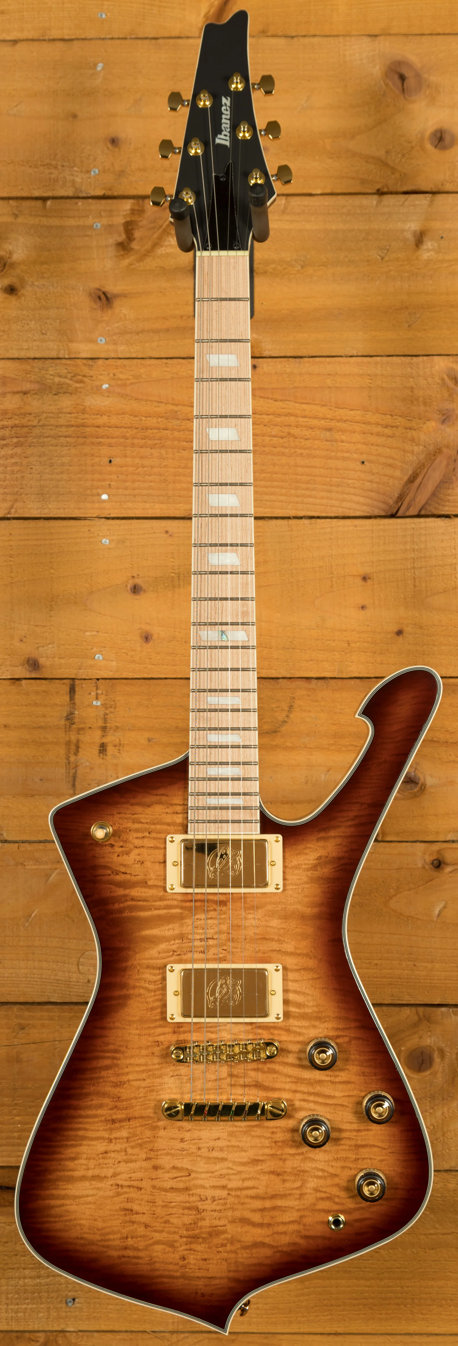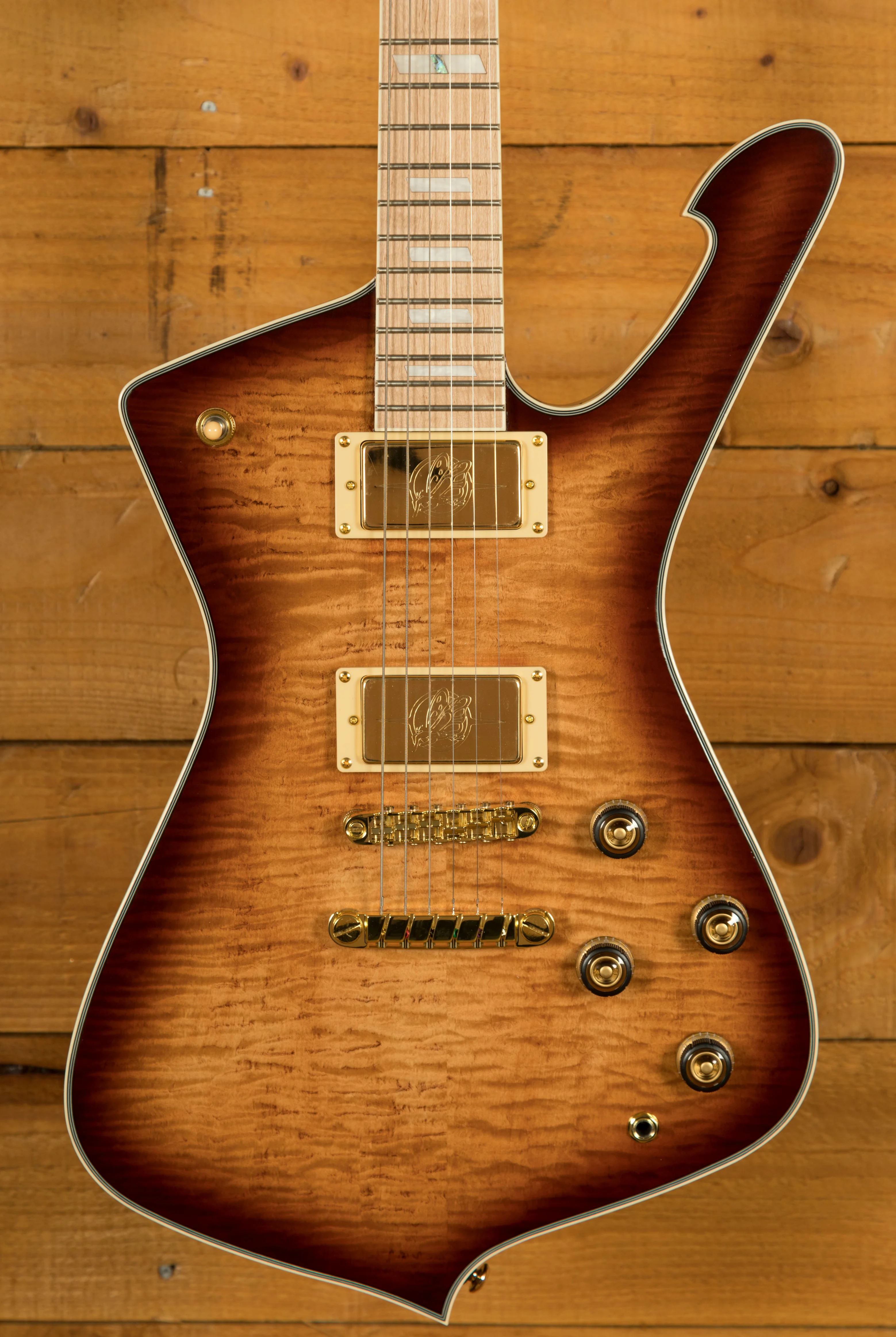 This vibrant and classy guitar is Ibanez's Standard Series Iceman with a maple fingerboard for a unique aesthetic. The gold hardware fits the Caramel Burst finish perfectly and with a Low Gloss, it's really easy to feel the guitar respond to your playing. The Super 80 pickups easily handle anything from jazz and blues to rock and metal - it's super versatile! Paired with multi-ply binding and acrylic and abalone block inlays, it really does look and sound top notch.
