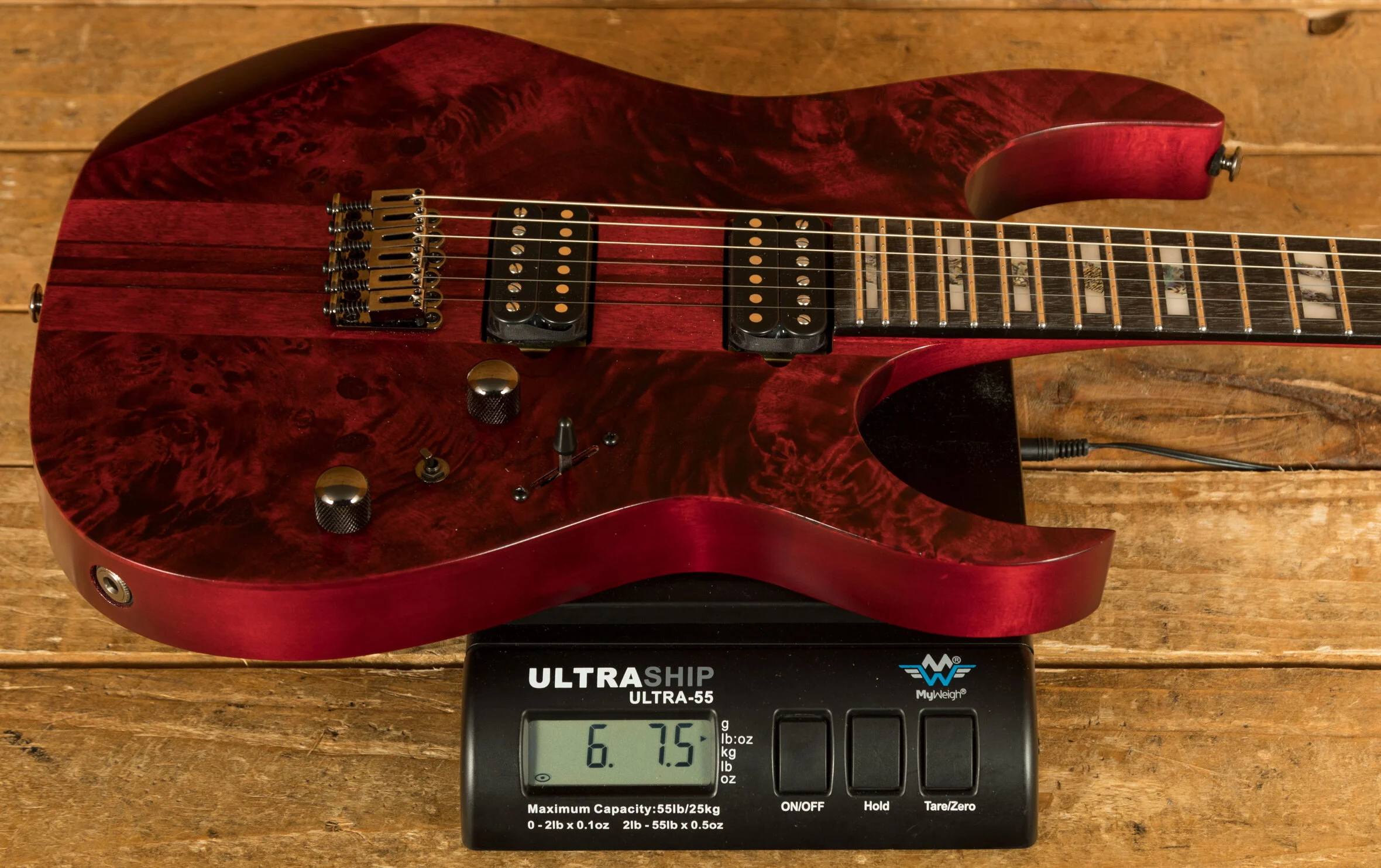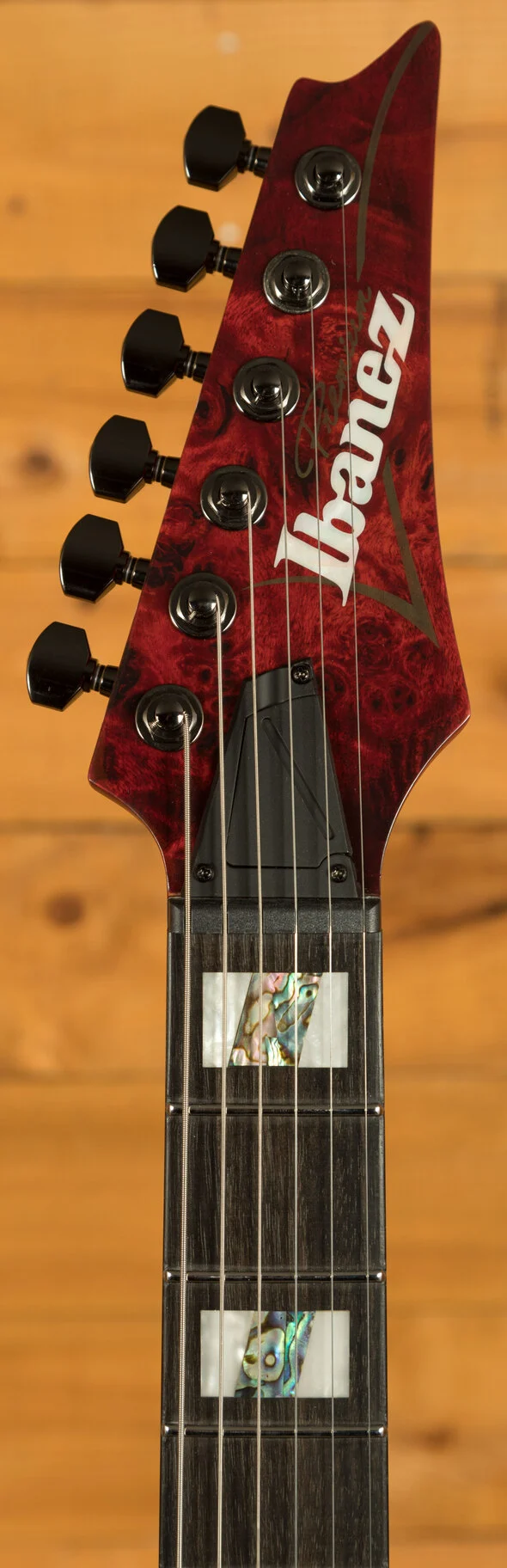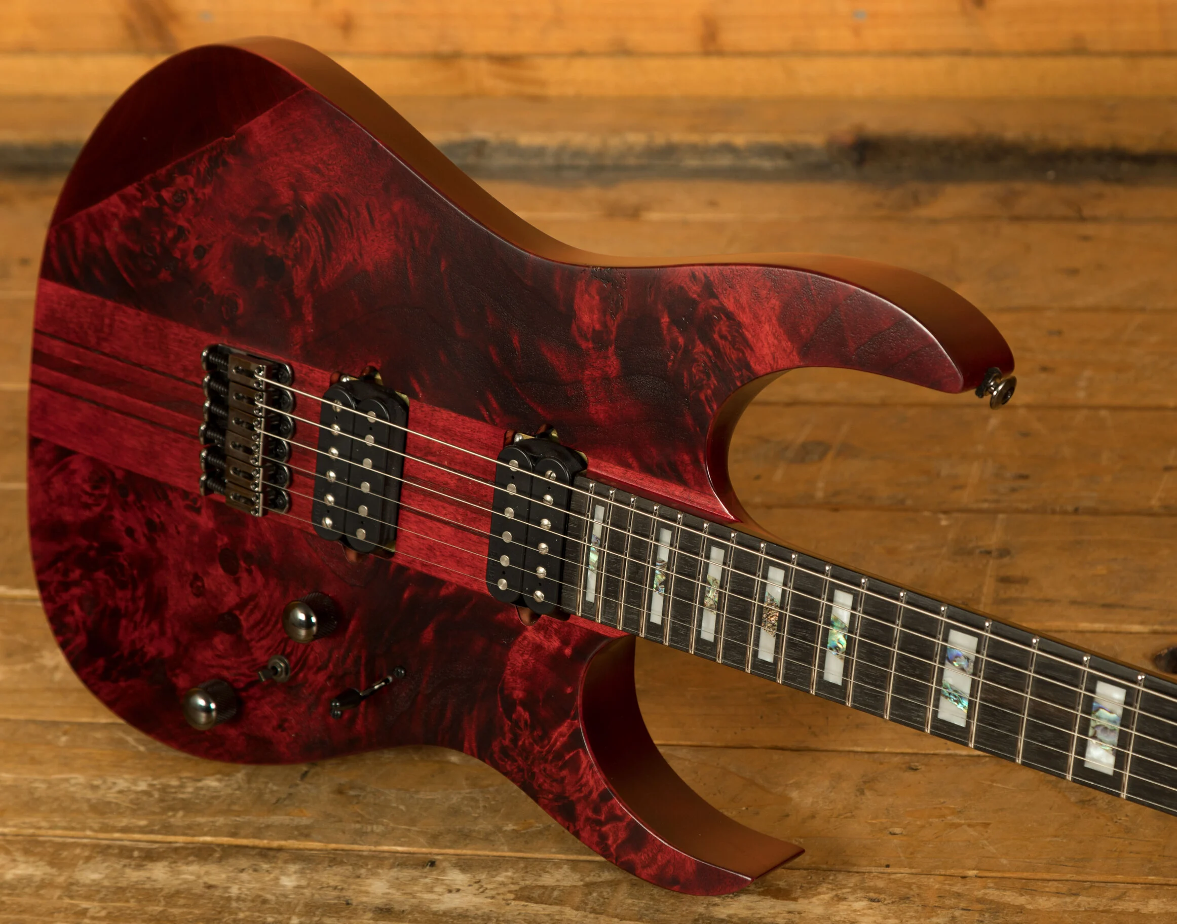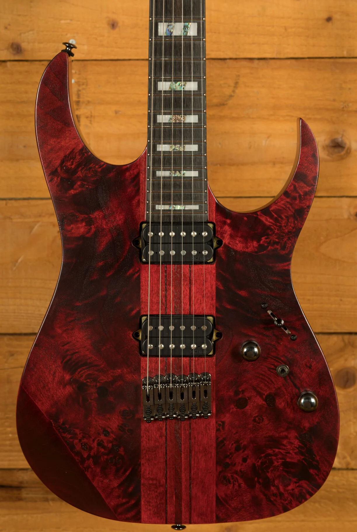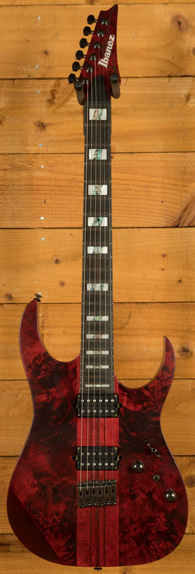 The Ibanez RGT1221PB, a testament to precision and sonic prowess, beckons guitar enthusiasts into a realm of unparalleled performance. At its heart, a pair of high-output DiMarzio Air Norton and The Tone Zone pickups unleash a colossal sound, characterised by a broad dynamic range that captivates both discerning players and eager audiences. The Wizard III 7pc Maple/Walnut neck, an engineering marvel by Ibanez, stands as a testament to innovation. Its thin, flat, and fast profile not only exudes strength and sturdiness but promises unlimited playability. The two-octave 24-fret fretboard enhances tonal possibilities, allowing players to explore an expansive sonic palette. The Jumbo Stainless Steel frets, adorned with Premium fret edge treatment, offer an exquisite playing experience, characterised by quick response, effortless articulation for chords, and clear tones for single notes. The guitar's aesthetic appeal is heightened by the Poplar Burl top with its exotic wood grain, coupled with the American Basswood body, ensuring a natural and flat tone.
