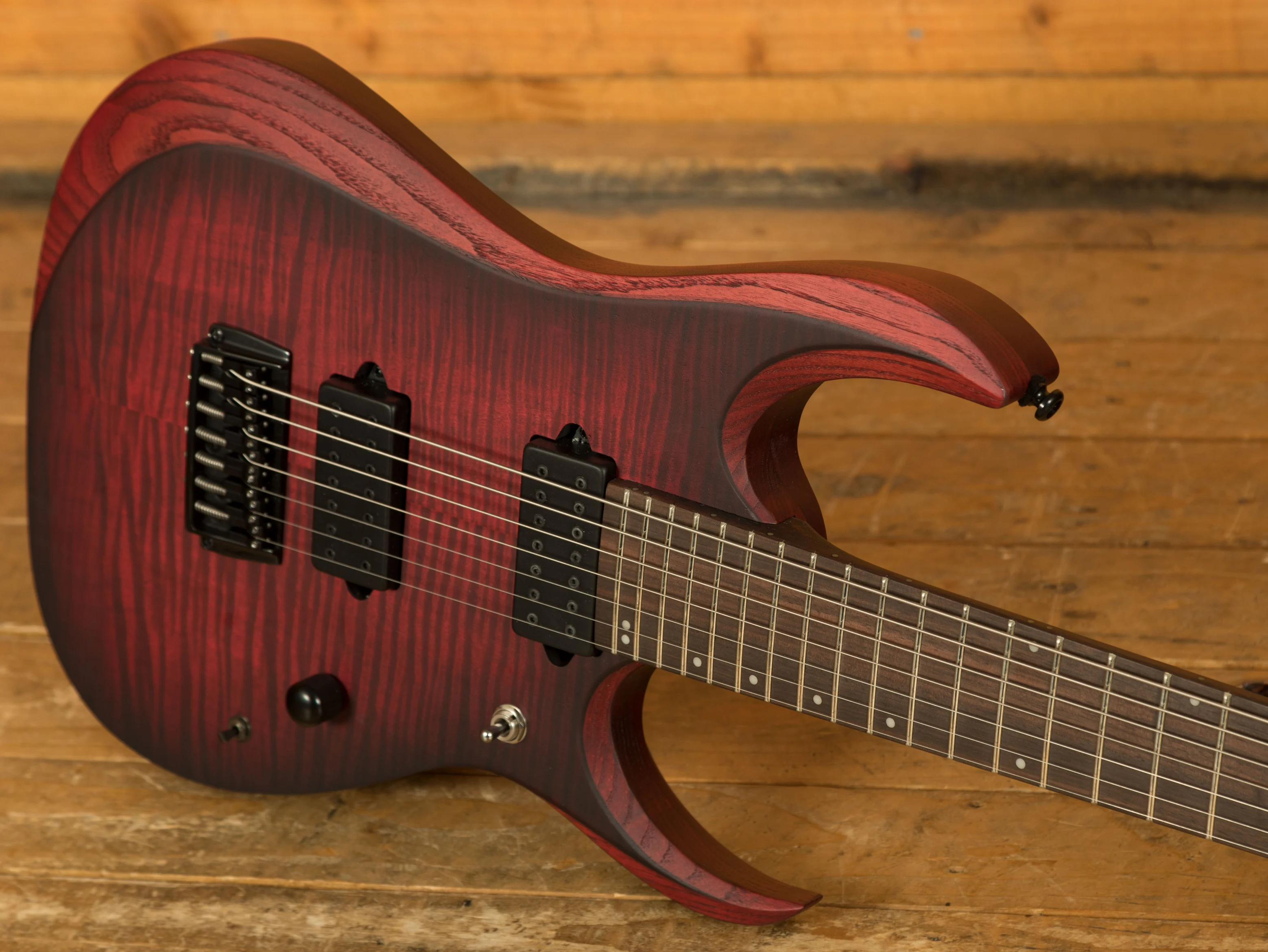 A flamed maple top sits over a layered ash and okoume body, giving the guitar a mix of brightness, midrange presence and low-end warmth. Finished in Stained Wine Red Burst Flat, it has a sleek, modern aesthetic that suits the Axion Label's darker, more aggressive styling.