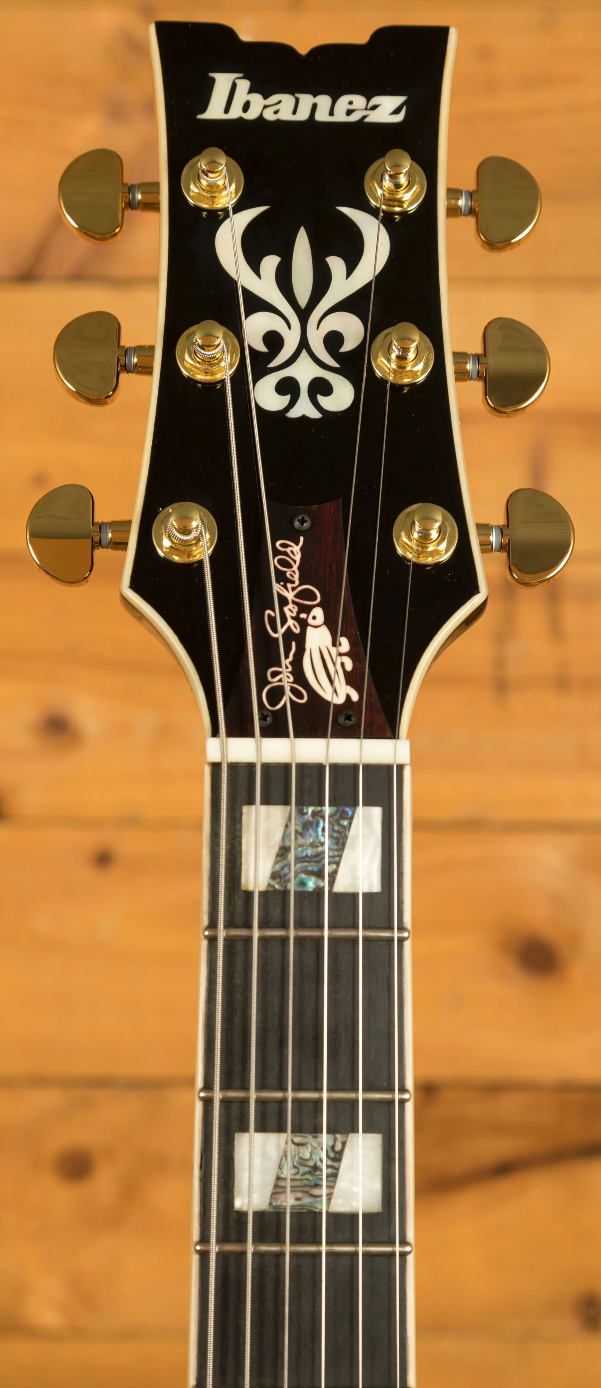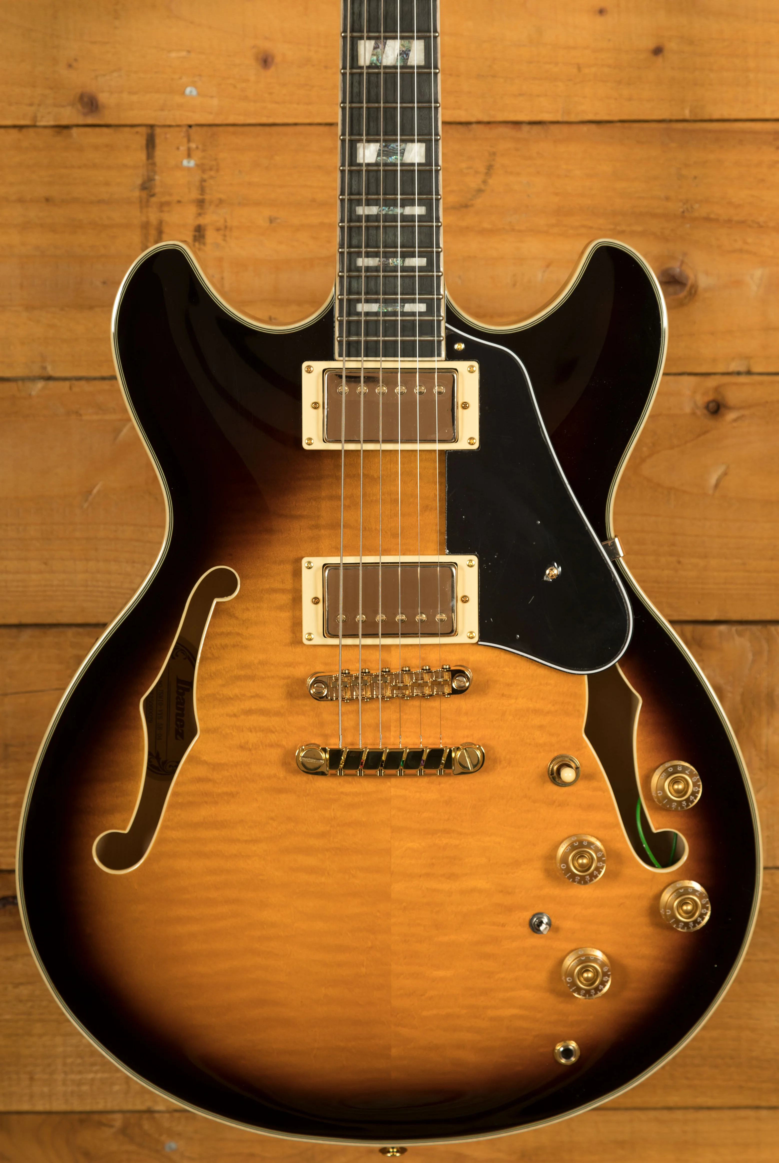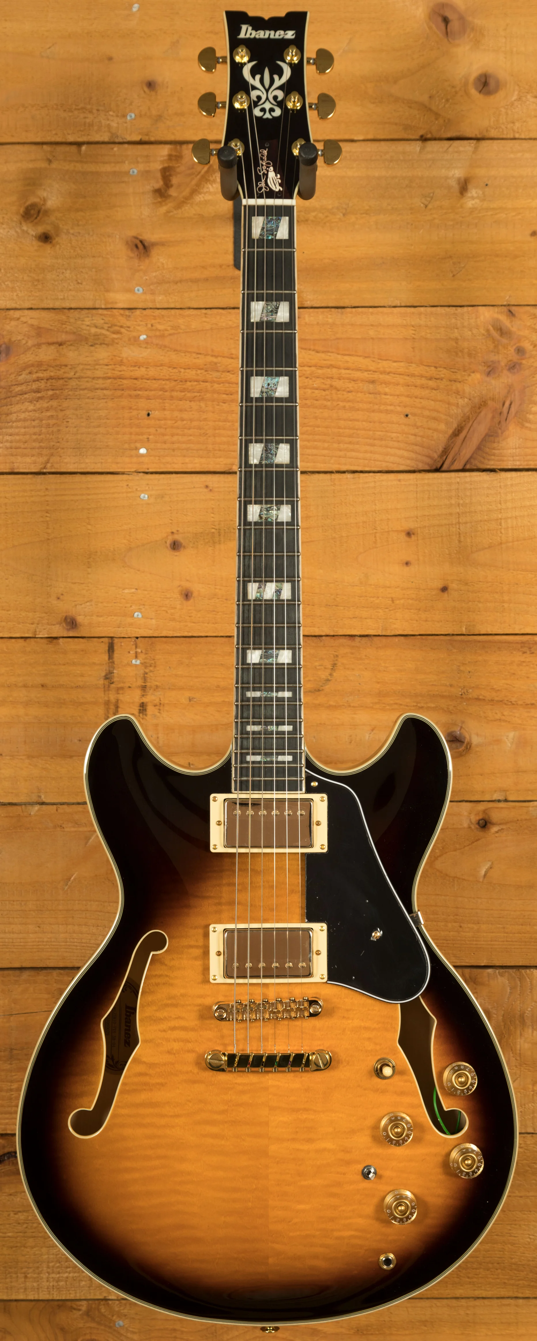 The JSM10 features a thin, double cutaway, semi-hollow body design with a flamed maple top with f holes and multi-layer binding and flamed maple back and sides mated to a set-in 3-piece nyatoh/maple neck with a 22-fret ebony fingerboard with binding and acrylic and abalone split block position markers. Components include dual Ibanez Super 58 humbucking pickups with gold covers and individual volume and tone controls and a tri-sound switch for the neck pickup, a Gibraltar Artist (10.5mm string spacing) bridge with Quik Change III tailpiece, a bone nut and a black pickguard.