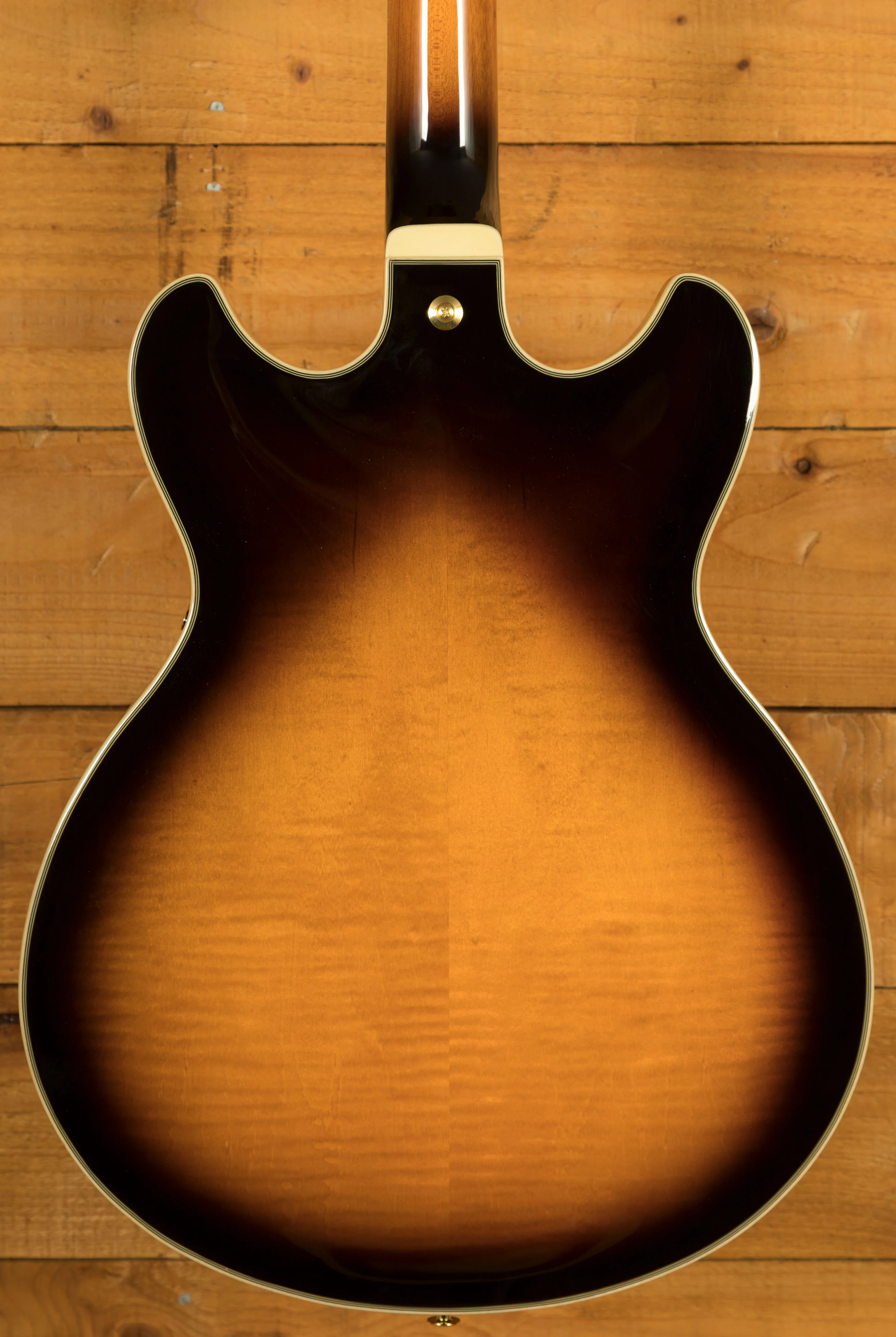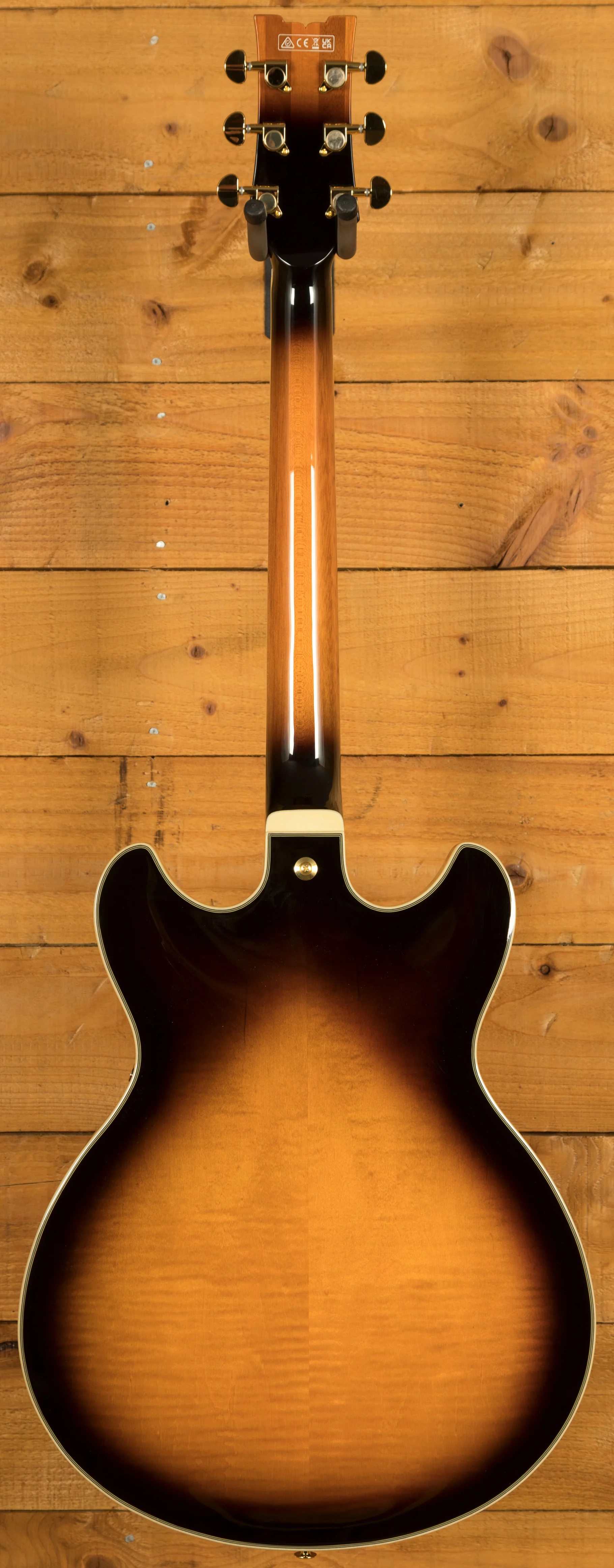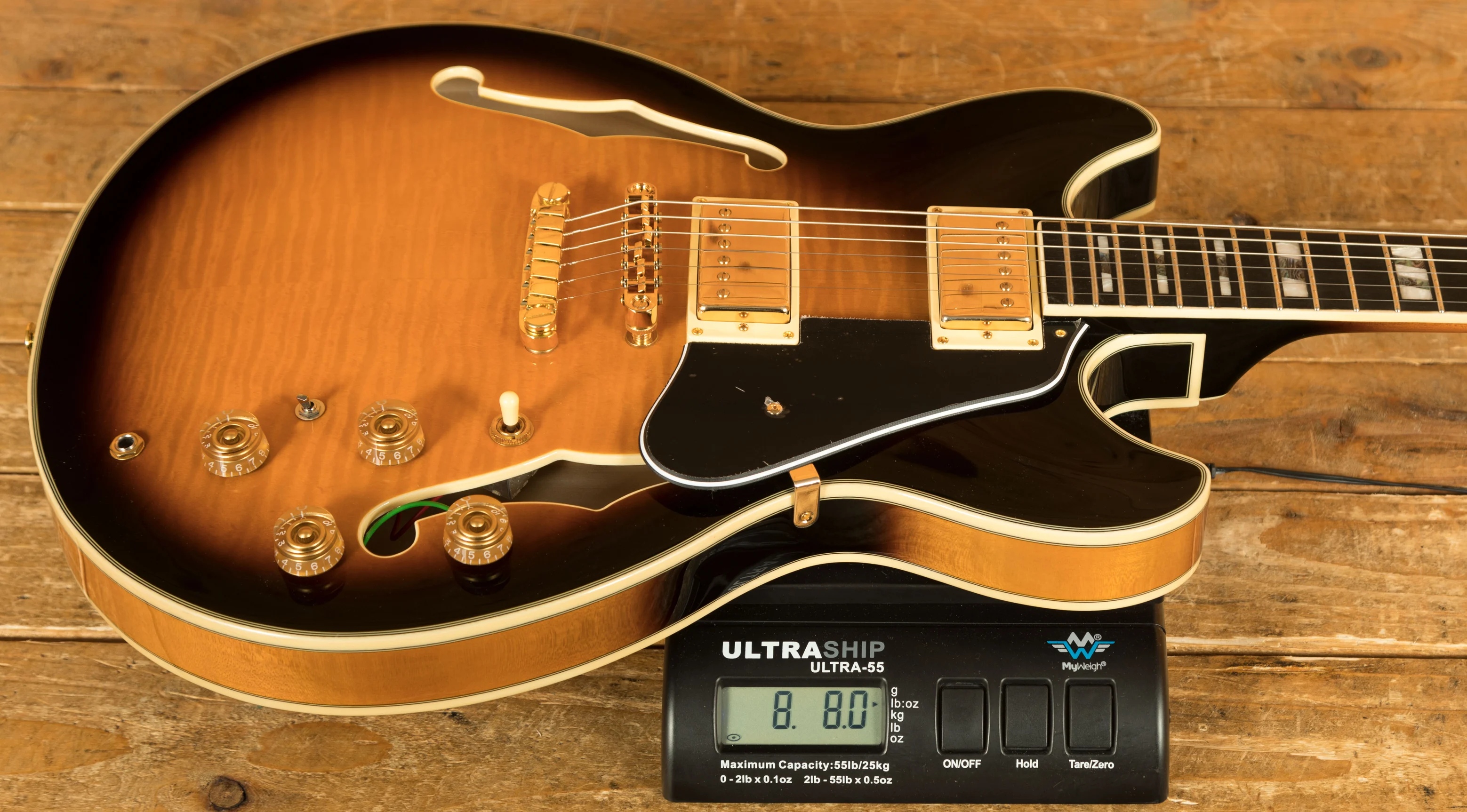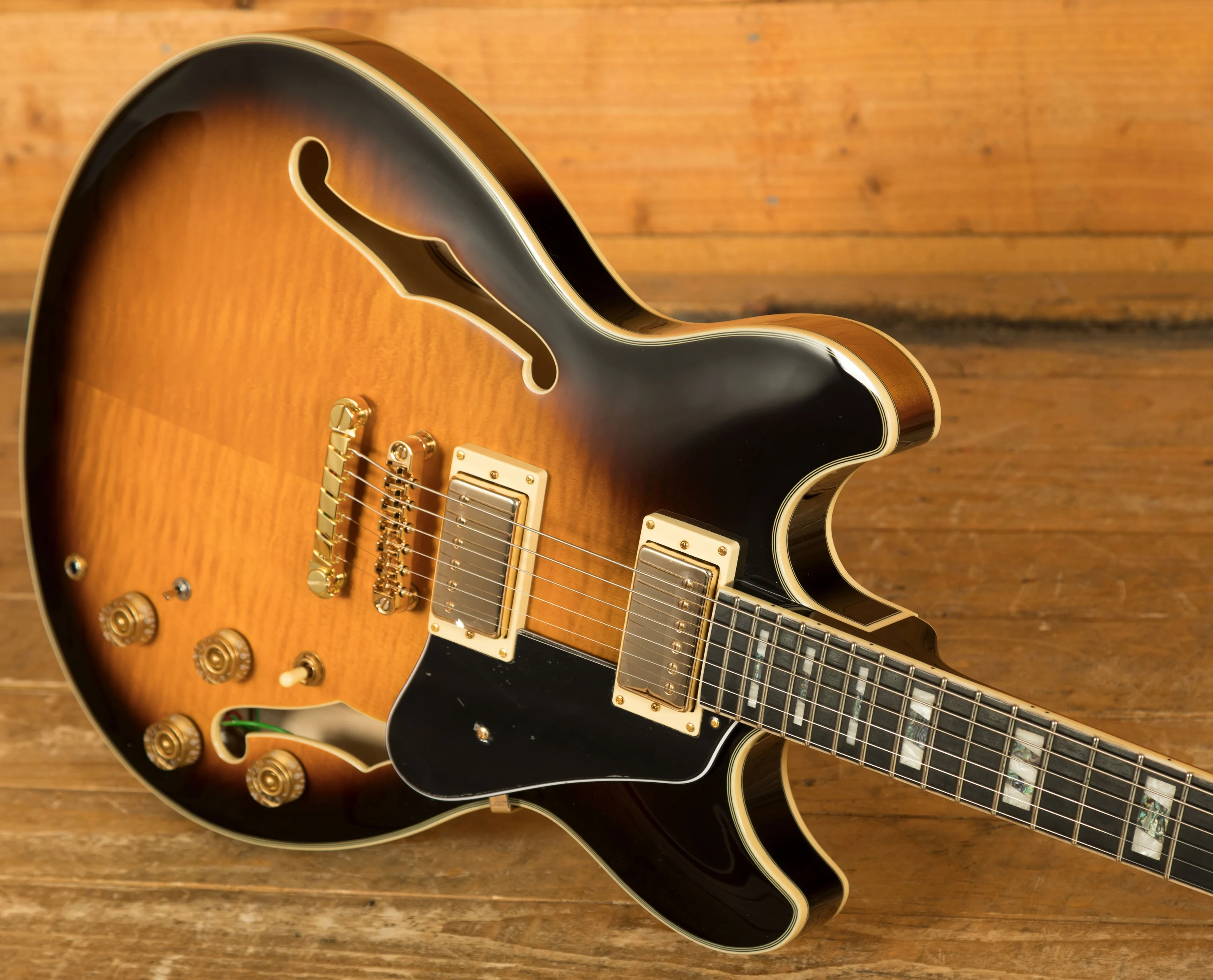 The JSM10 features a thin, double cutaway, semi-hollow body design with a flamed maple top with f holes and multi-layer binding and flamed maple back and sides mated to a set-in 3-piece nyatoh/maple neck with a 22-fret ebony fingerboard with binding and acrylic and abalone split block position markers. Components include dual Ibanez Super 58 humbucking pickups with gold covers and individual volume and tone controls and a tri-sound switch for the neck pickup, a Gibraltar Artist (10.5mm string spacing) bridge with Quik Change III tailpiece, a bone nut and a black pickguard.