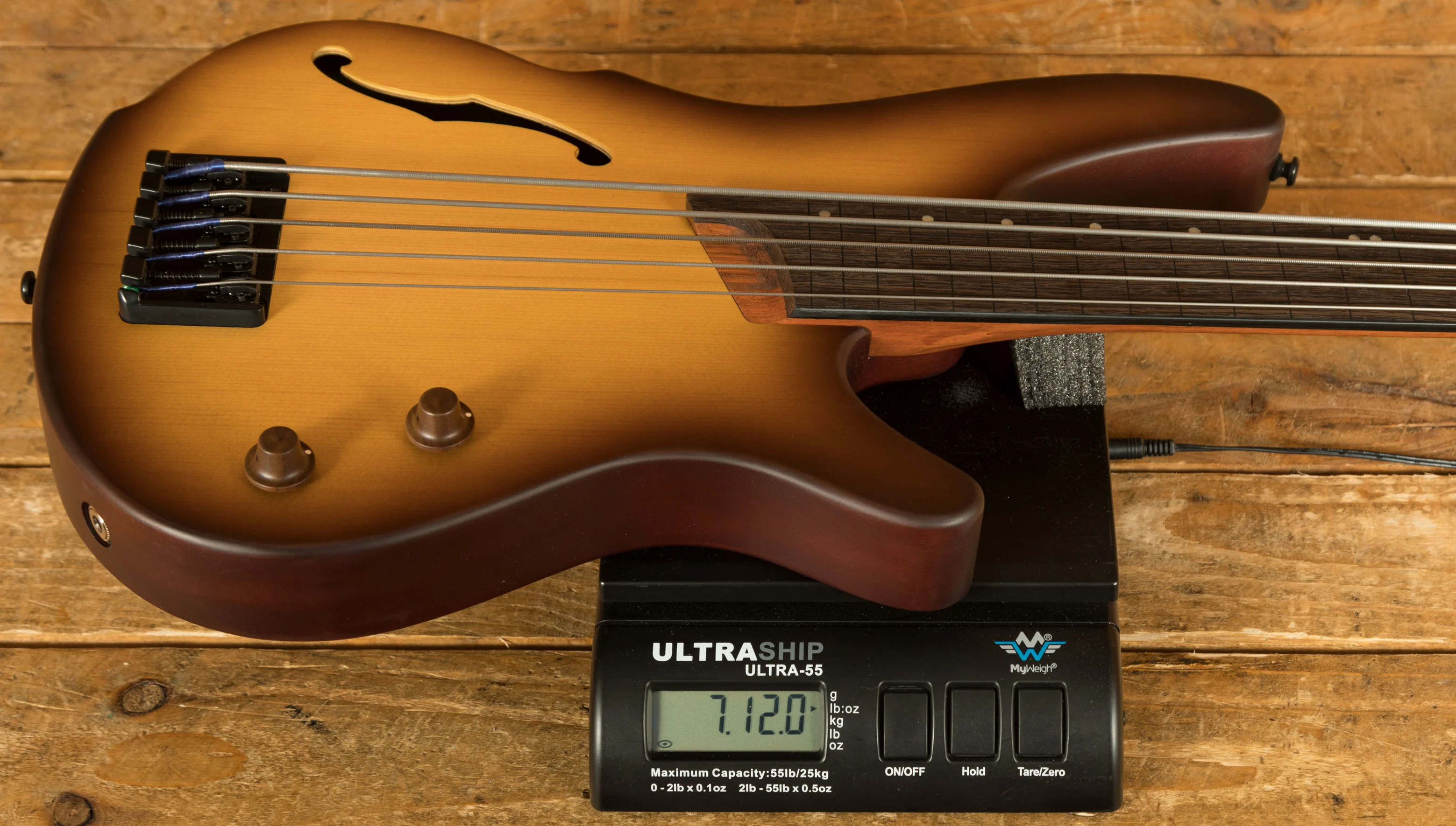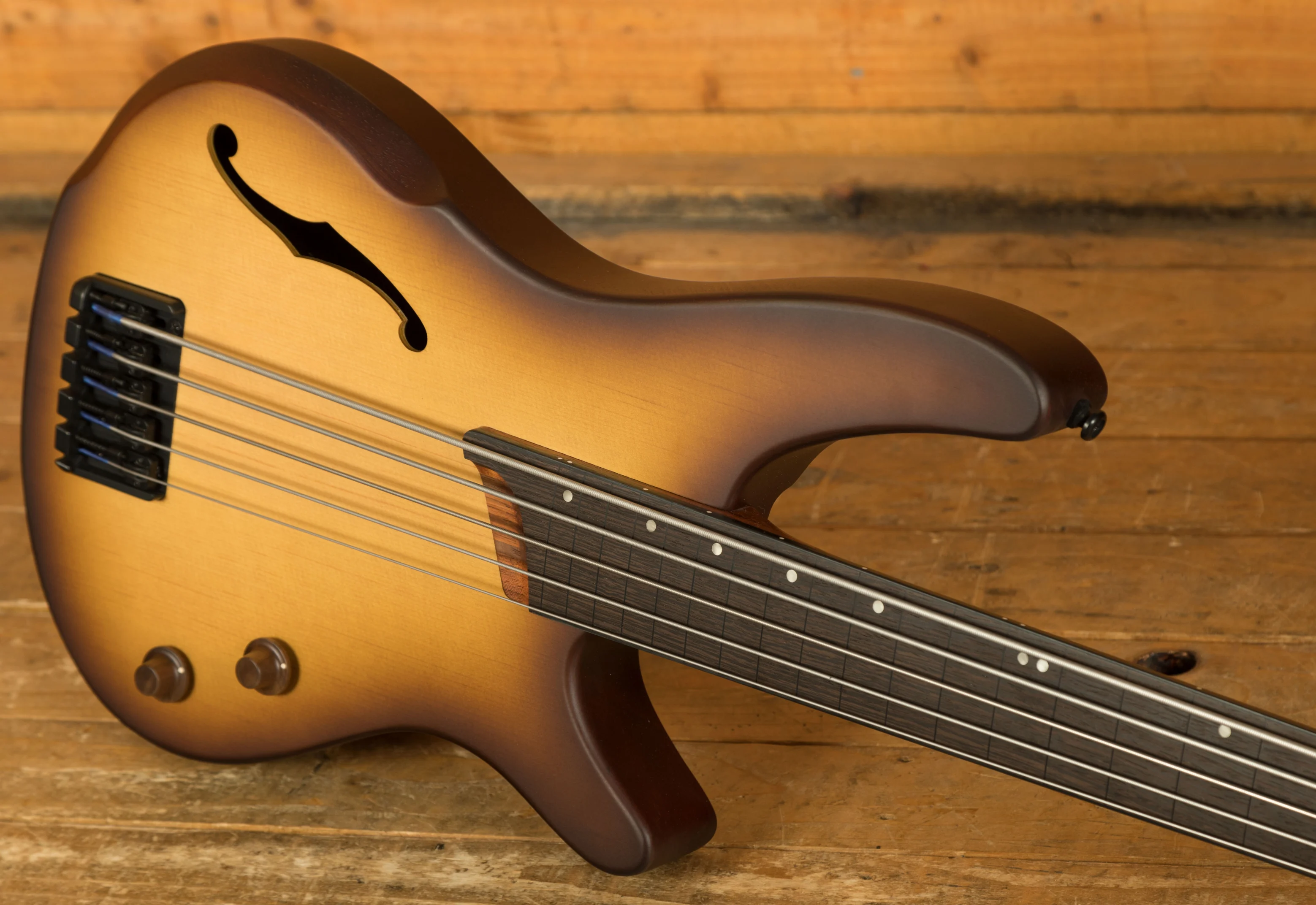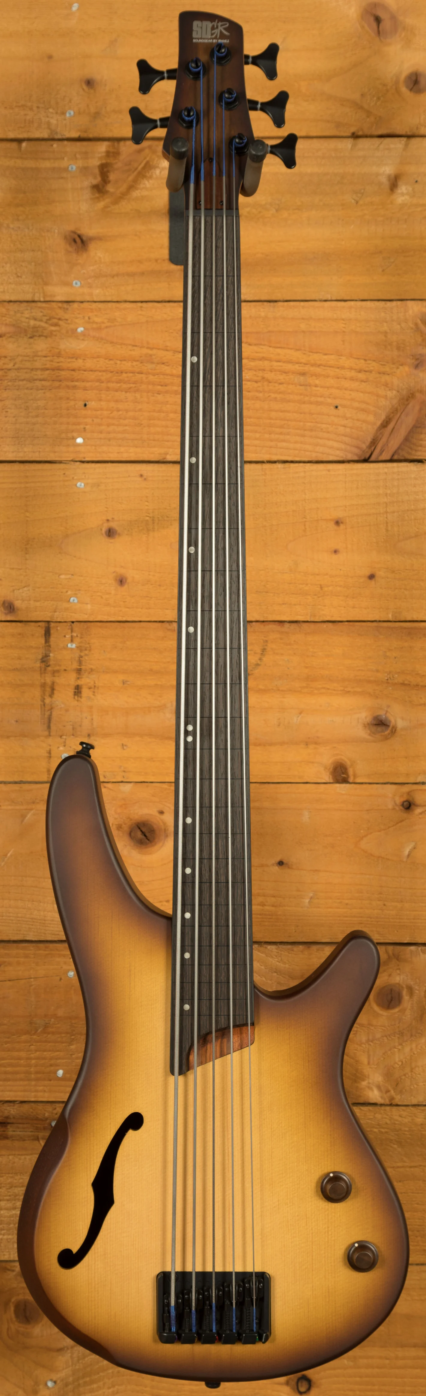 The super resonant, semi hollow Okoume body has slick curves and a sweet Spruce top, the wood can really breathe and in turn produces lush, deep bass tones. The unique sound hole and semi hollow construction give a rich acoustic tone, almost like an electric upright bass. With a forearm contour you get enhanced playability and comfort while also adding a touch of elegance. The SR neck is known for its slim, easy to play profile, with a 5 piece Jatoba/Walnut construction it has enhanced sustain, stability and is just begging to be played. The contoured neck heel allows easier access to the upper frets and has a really unique look.