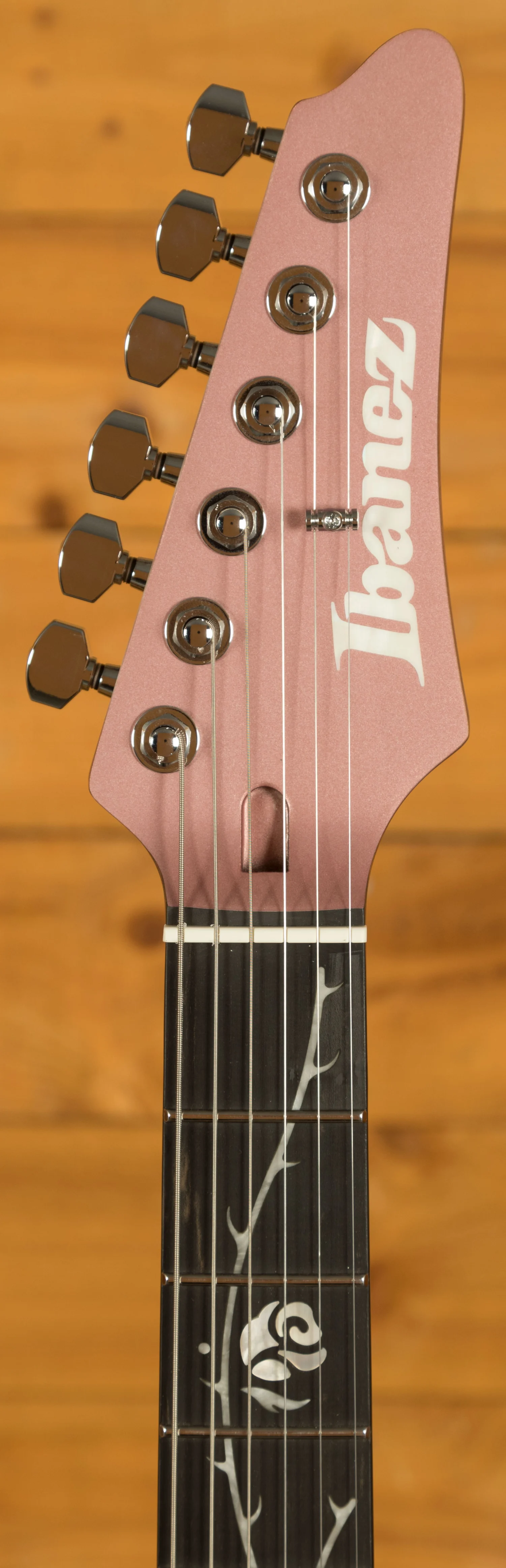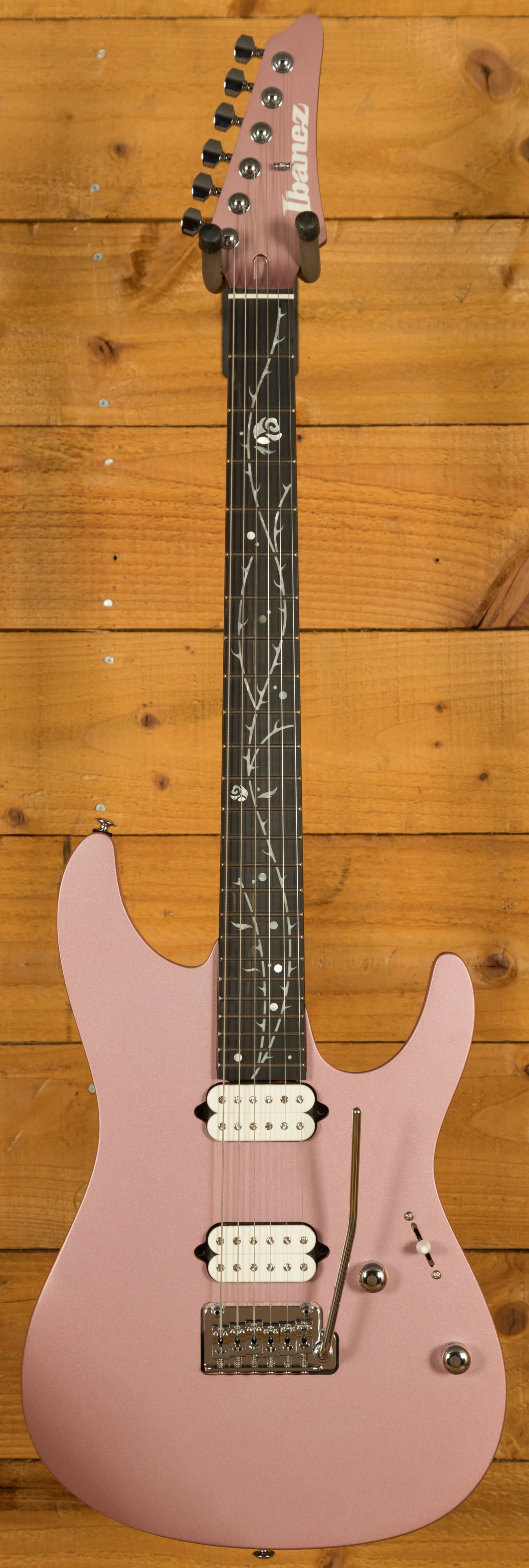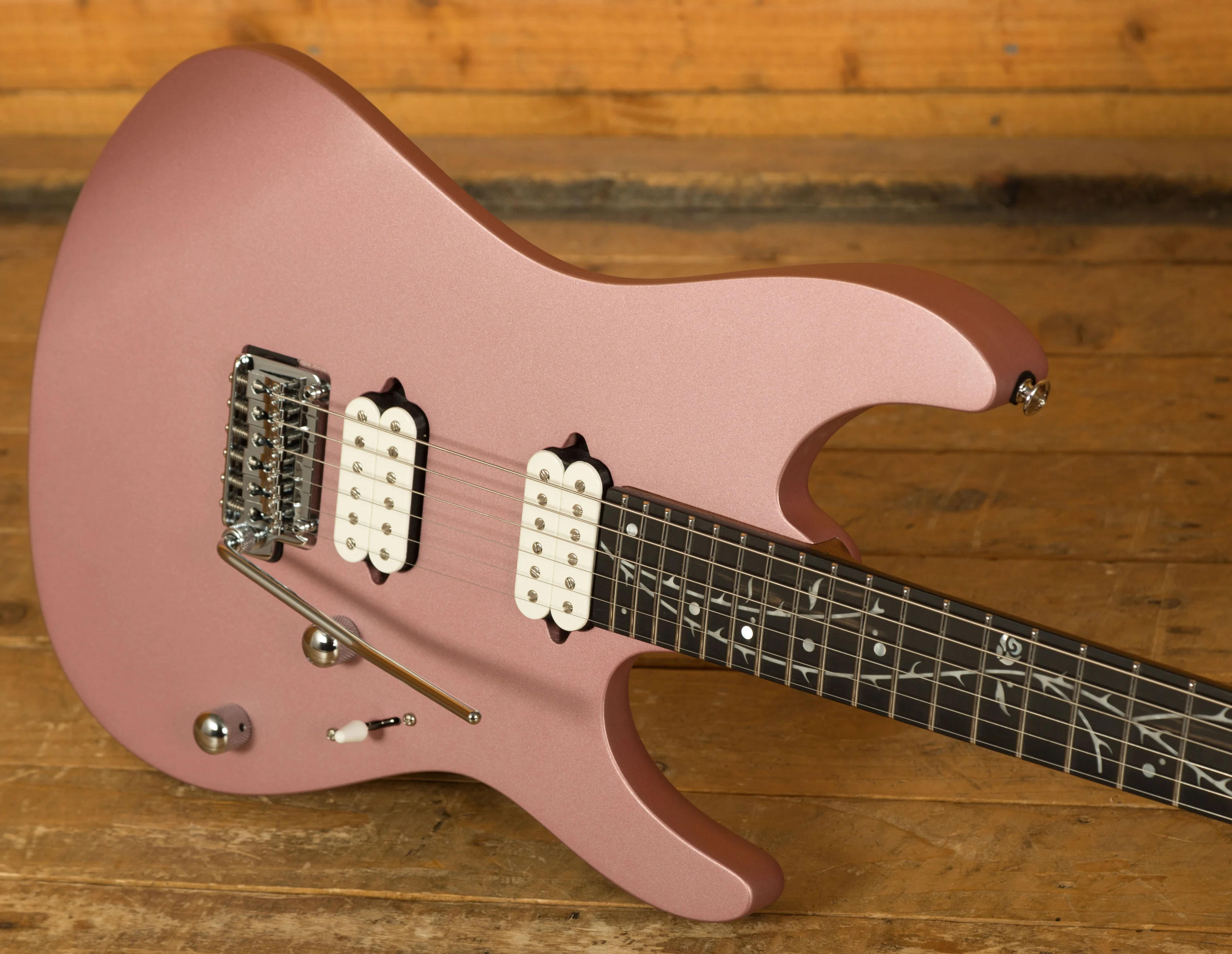 The ebony fretboard contributes to the guitar's strong tonal attack and quick response. Known for its tight lows, balanced mid-range, and crisp highs, the ebony fretboard is complemented by a stunning Tree of Death inlay that enhances the guitar's aesthetic appeal.