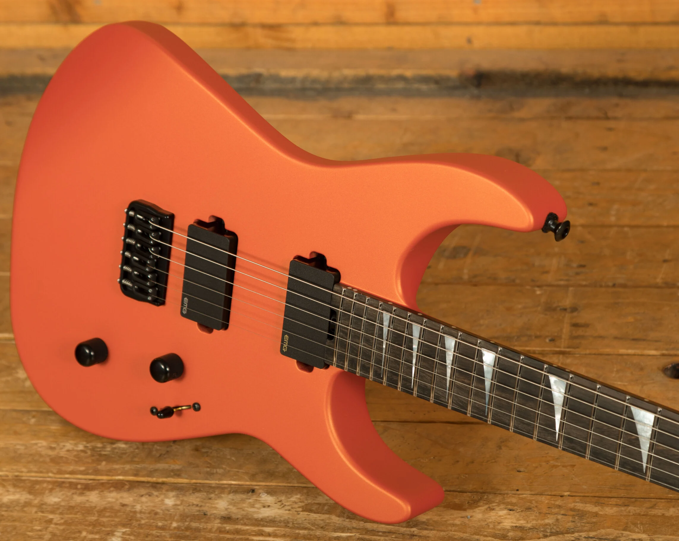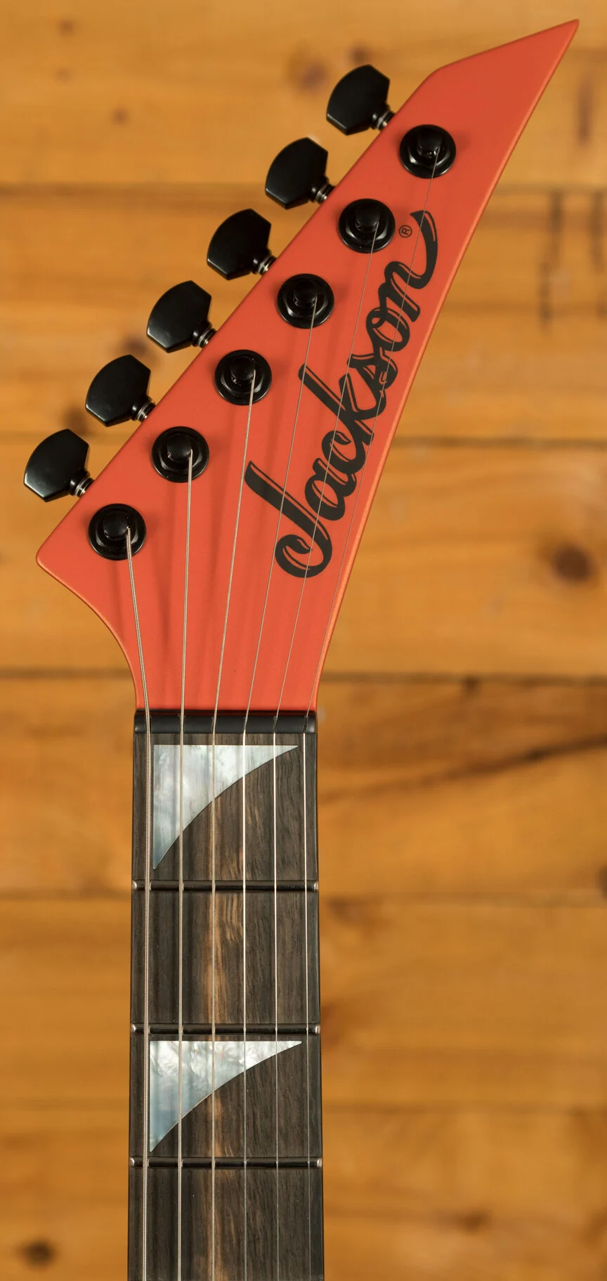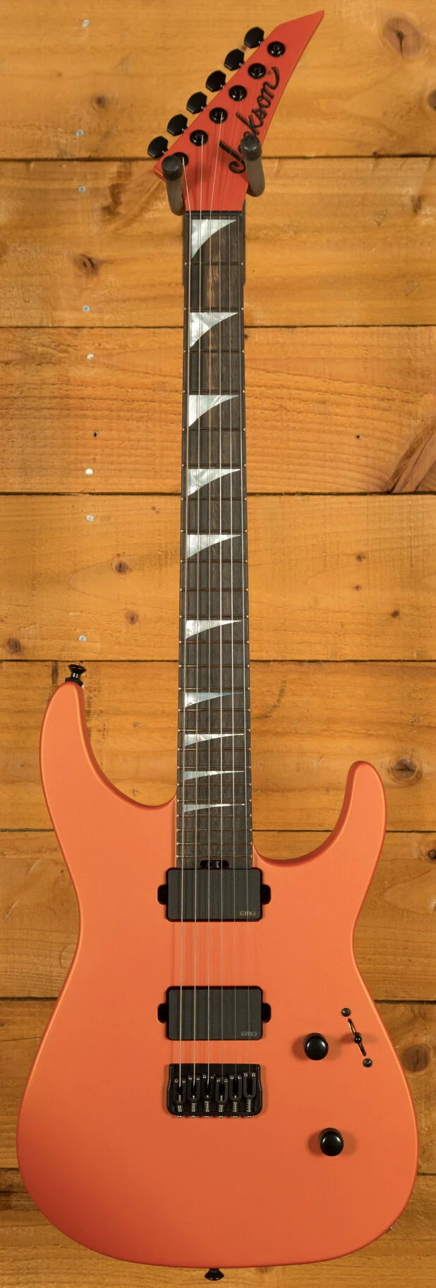 The fingerboard is a masterpiece of design for the modern shredder. Crafted from ebony with a 12"-16" compound radius, it offers unparalleled comfort and speed. The tighter radius at the nut facilitates comfortable chording, while the flatter radius towards the bridge allows for effortless high-speed playing and wide bends without fretting out. 24 jumbo stainless steel frets provide a slick, smooth playing surface that makes bending a breeze and ensures long-lasting durability. Inverse mother of pearl sharkfin inlays add a touch of classic Jackson style, while Luminlay glow-in-the-dark side dots ensure perfect fingerboard navigation even on the darkest stages. A heel-mount truss rod adjustment wheel allows for quick and easy neck relief adjustments on the fly.