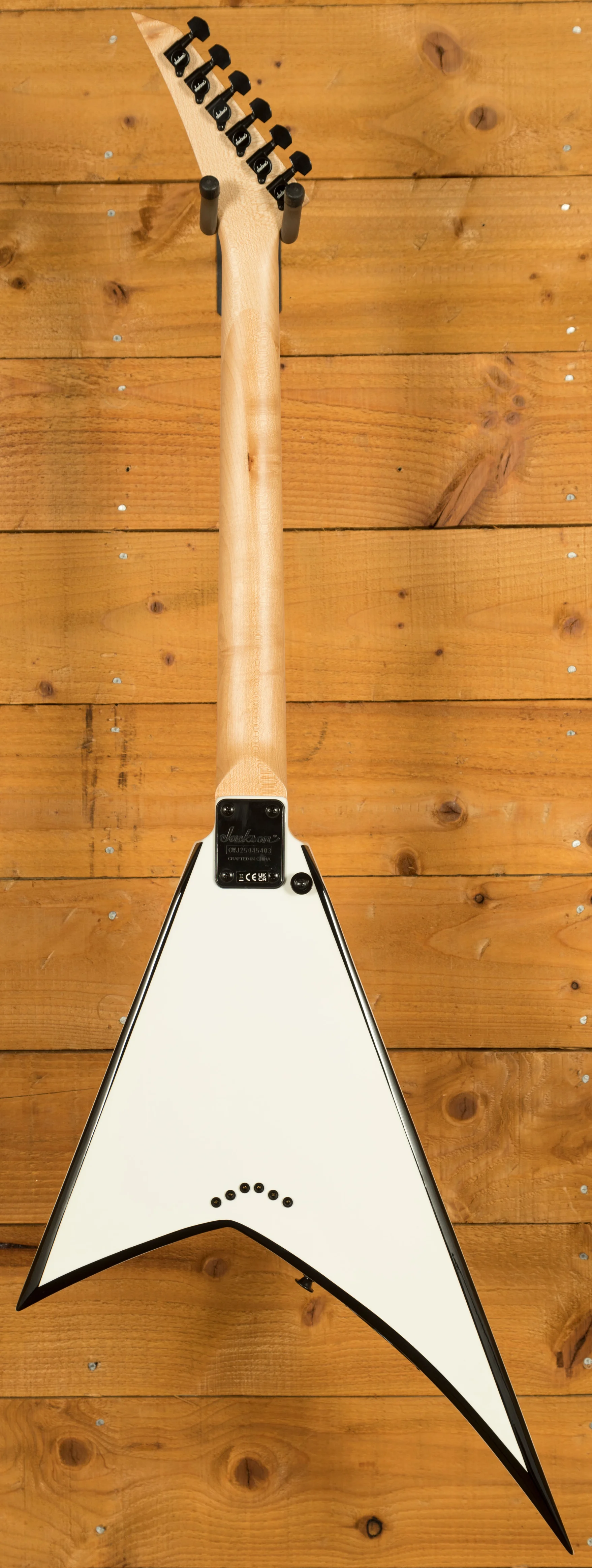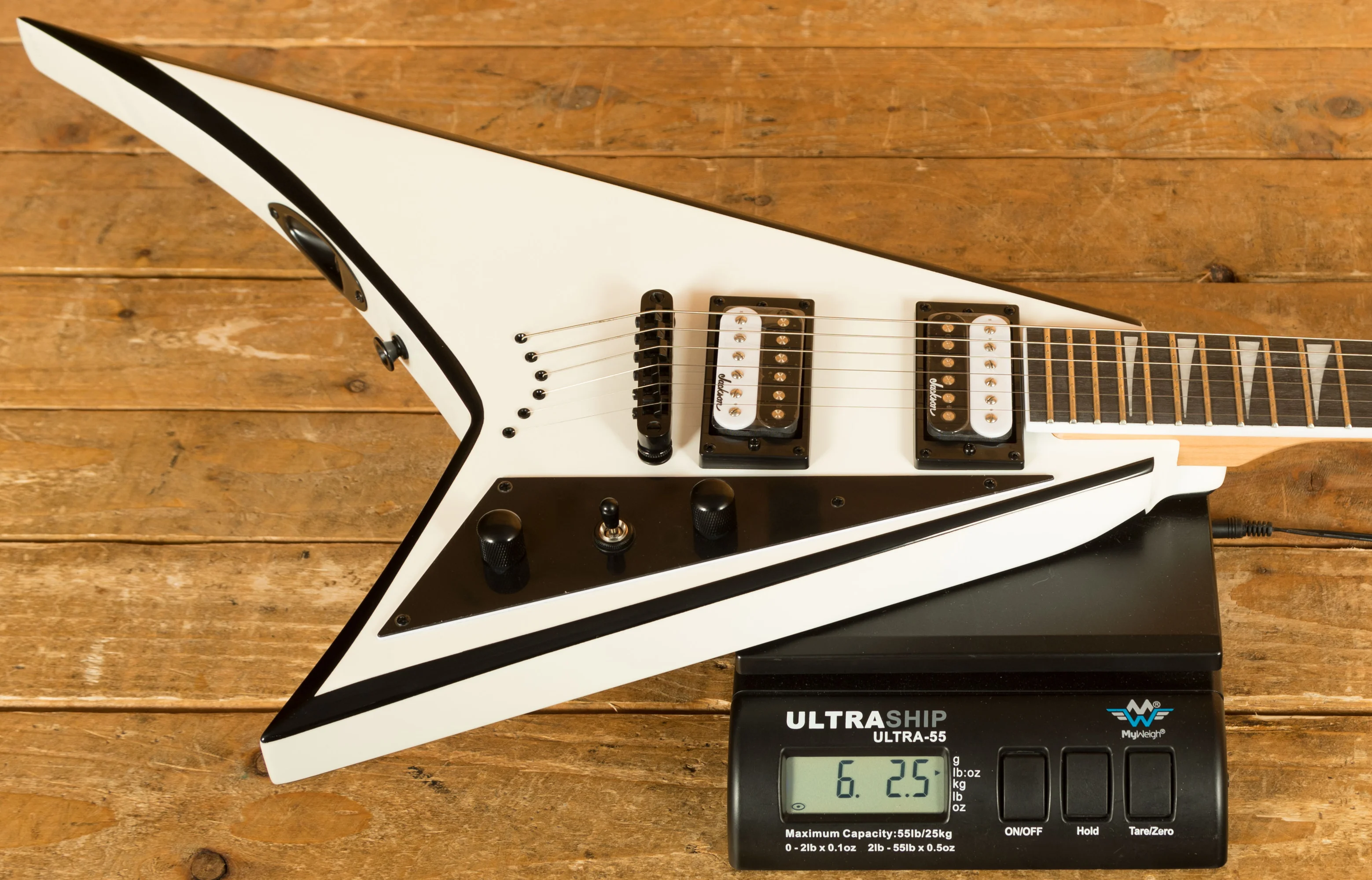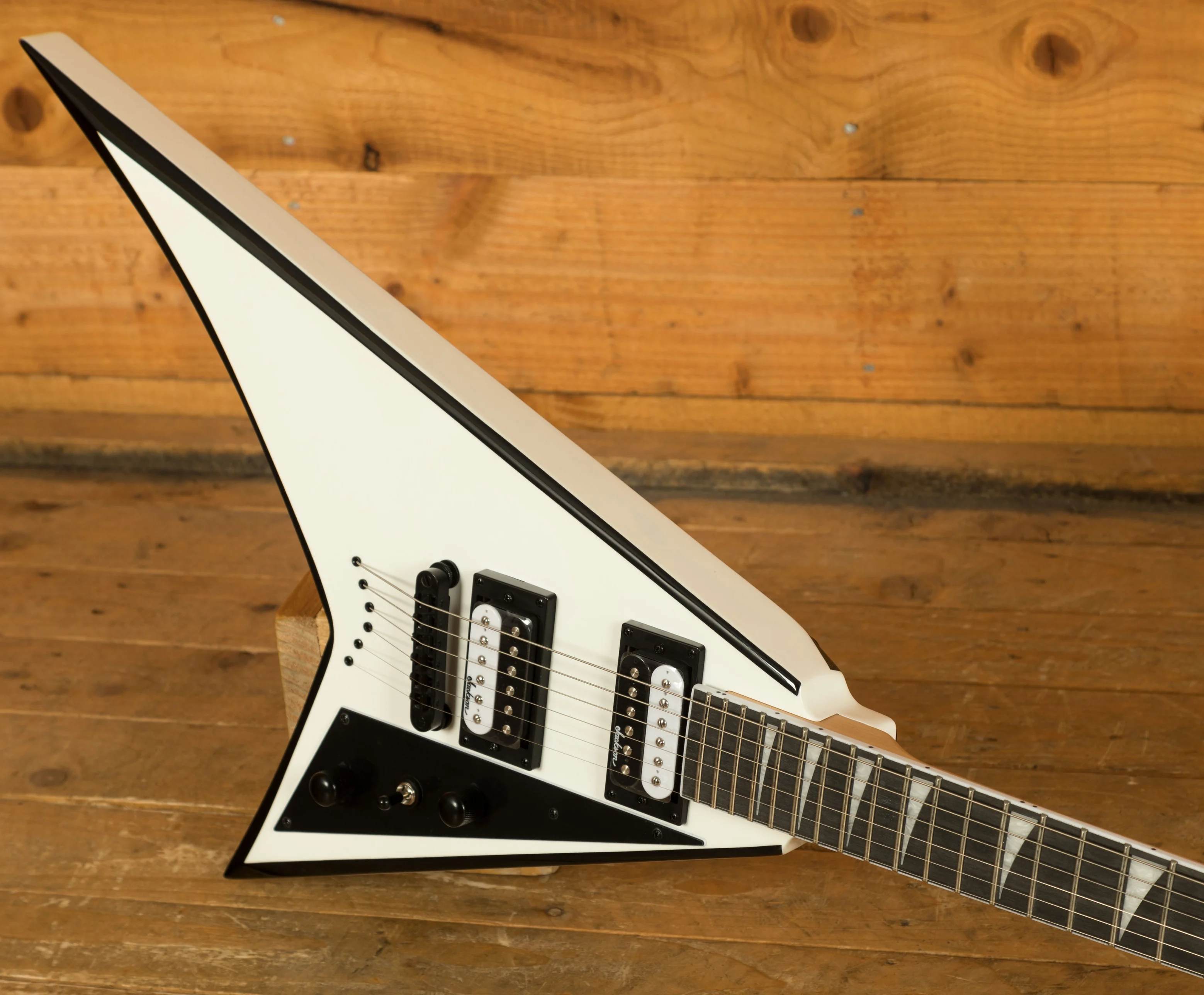 The JS Series Rhoads JS32T has a poplar body and a bolt-on maple speed neck with graphite reinforcement and scarf joint for rock-solid stability. Hosting 24 jumbo frets and pearloid sharkfin inlays, the 12”-16” compound radius fully bound amaranth fingerboard creates the ideal playing surface for fat riffs and easy chording near the black plastic nut while gradually flattening in the upper registers for lightning-quick solos and wide bends without fear of fretting out.