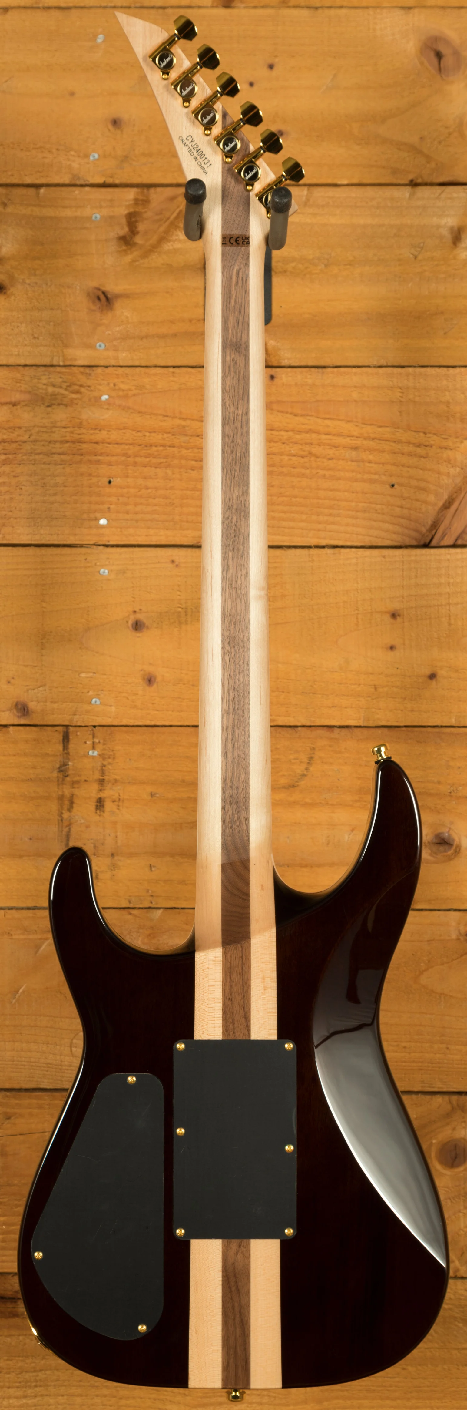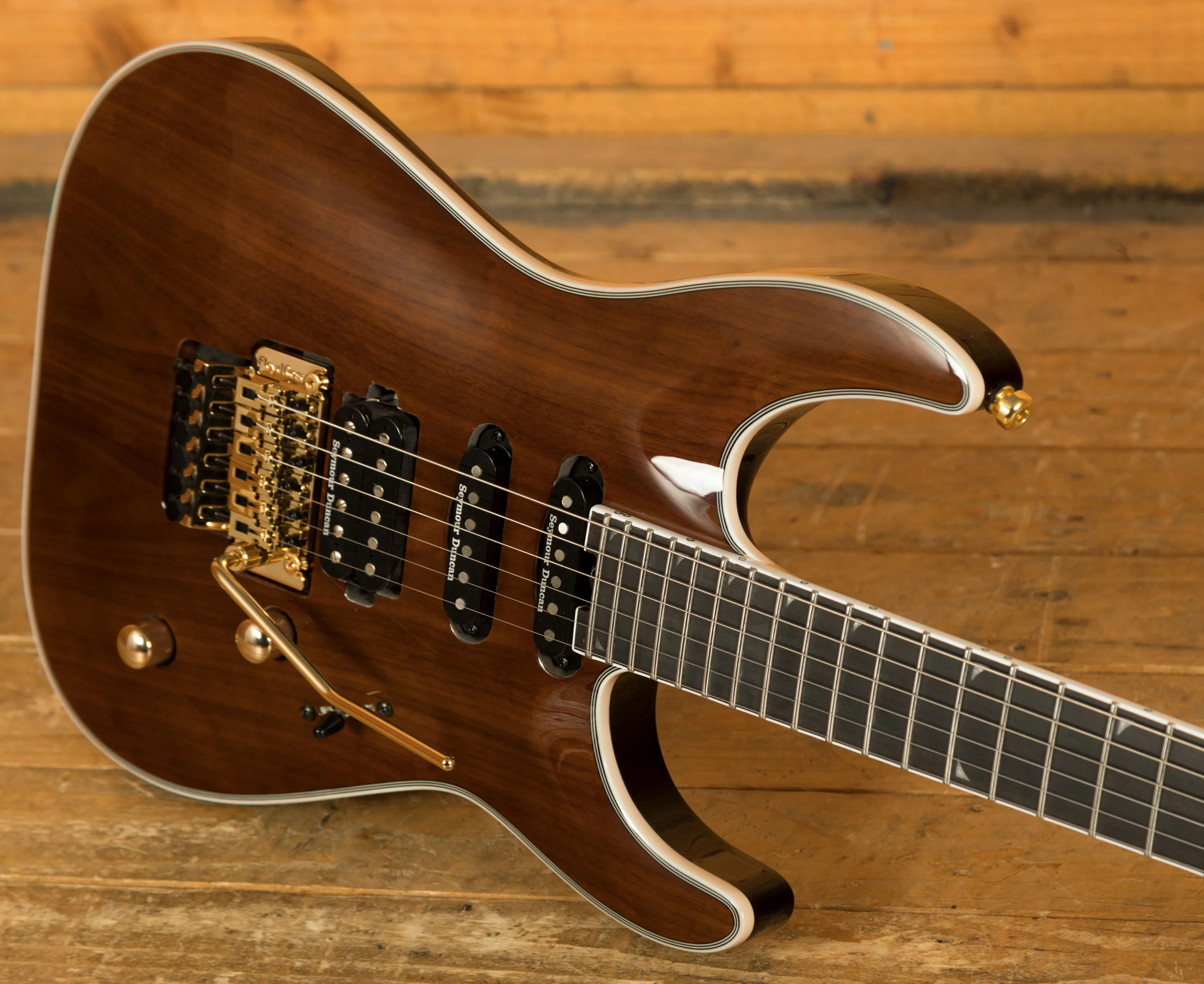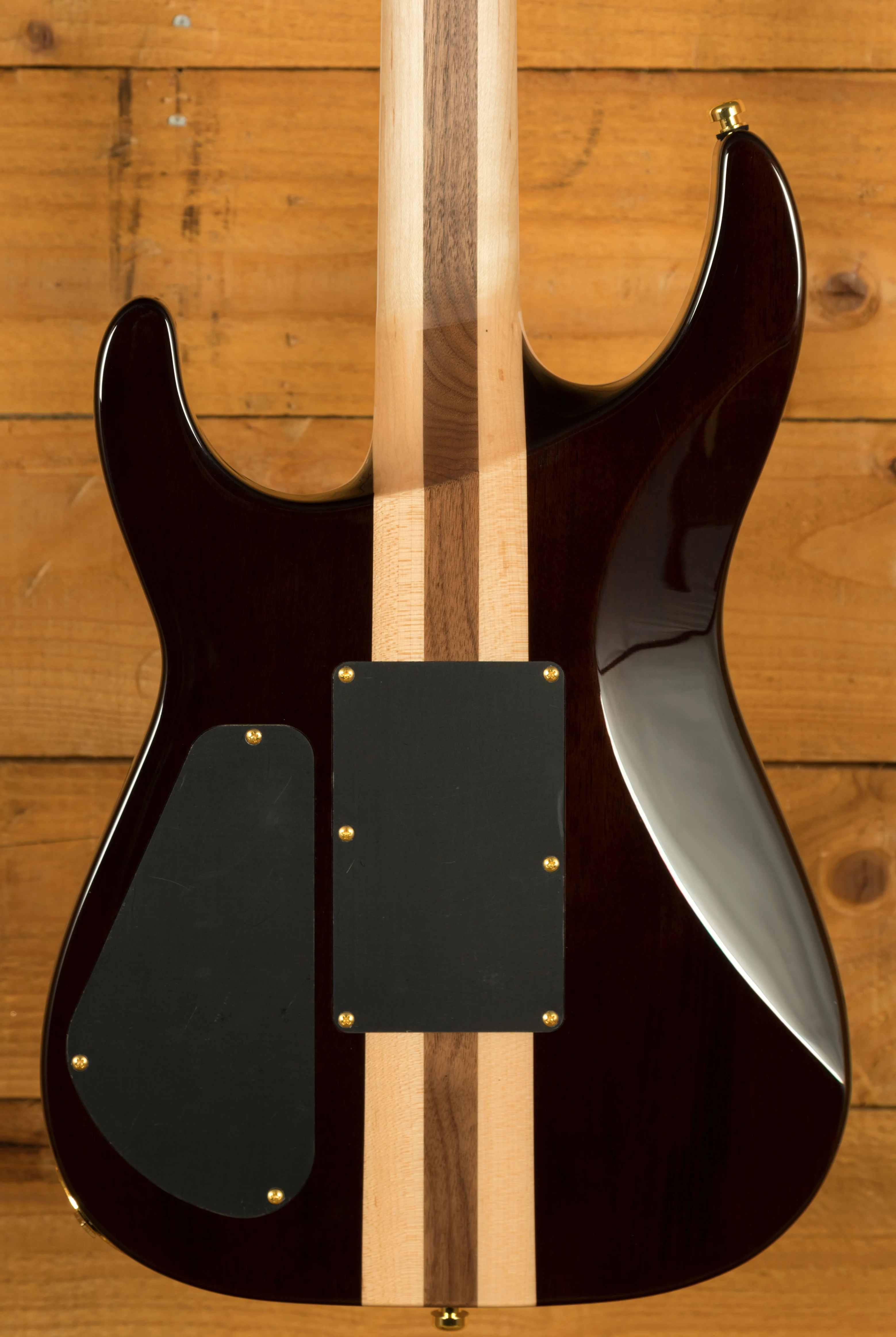 The Soloist body boasts a six-ply arched top made from okoume with a striking walnut top, offering a sleek and ergonomic design. The three-piece through-body maple/walnut neck features graphite reinforcement and an oiled finish on the back for enhanced playability. The bound 12"-16" compound radius ebony fingerboard ensures an ergonomic and smooth playing surface.