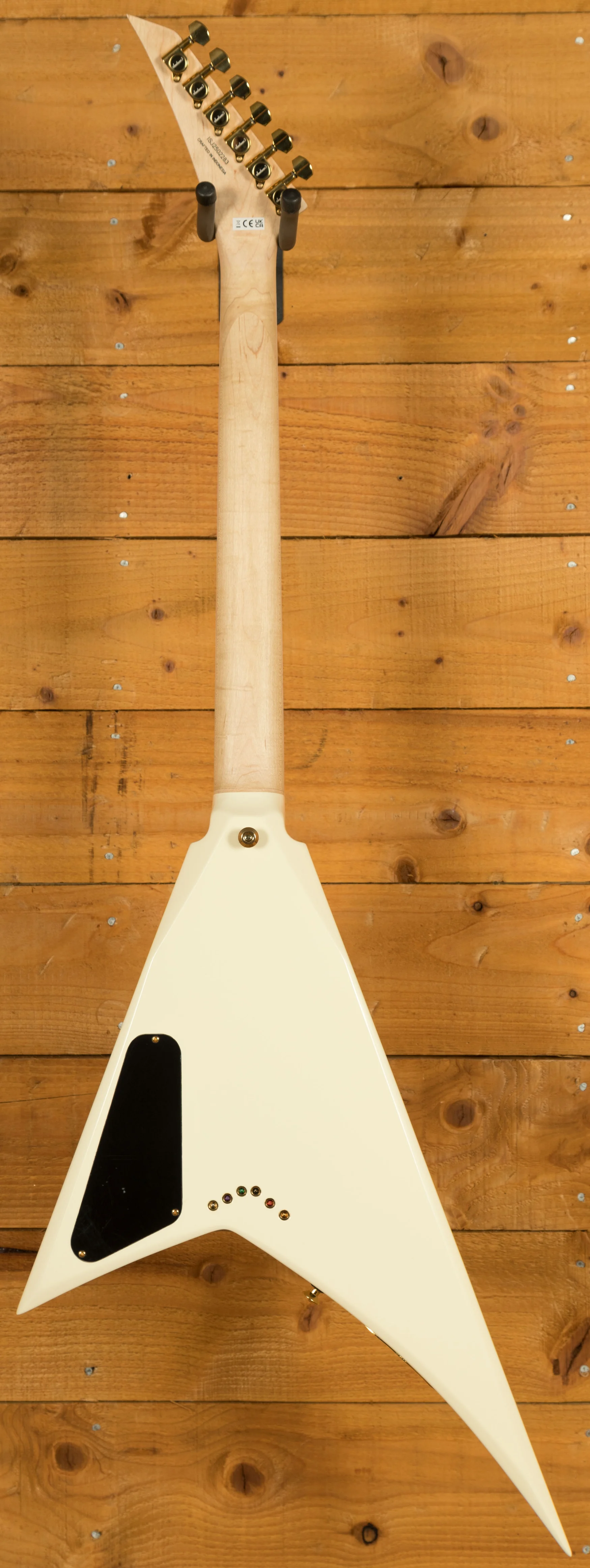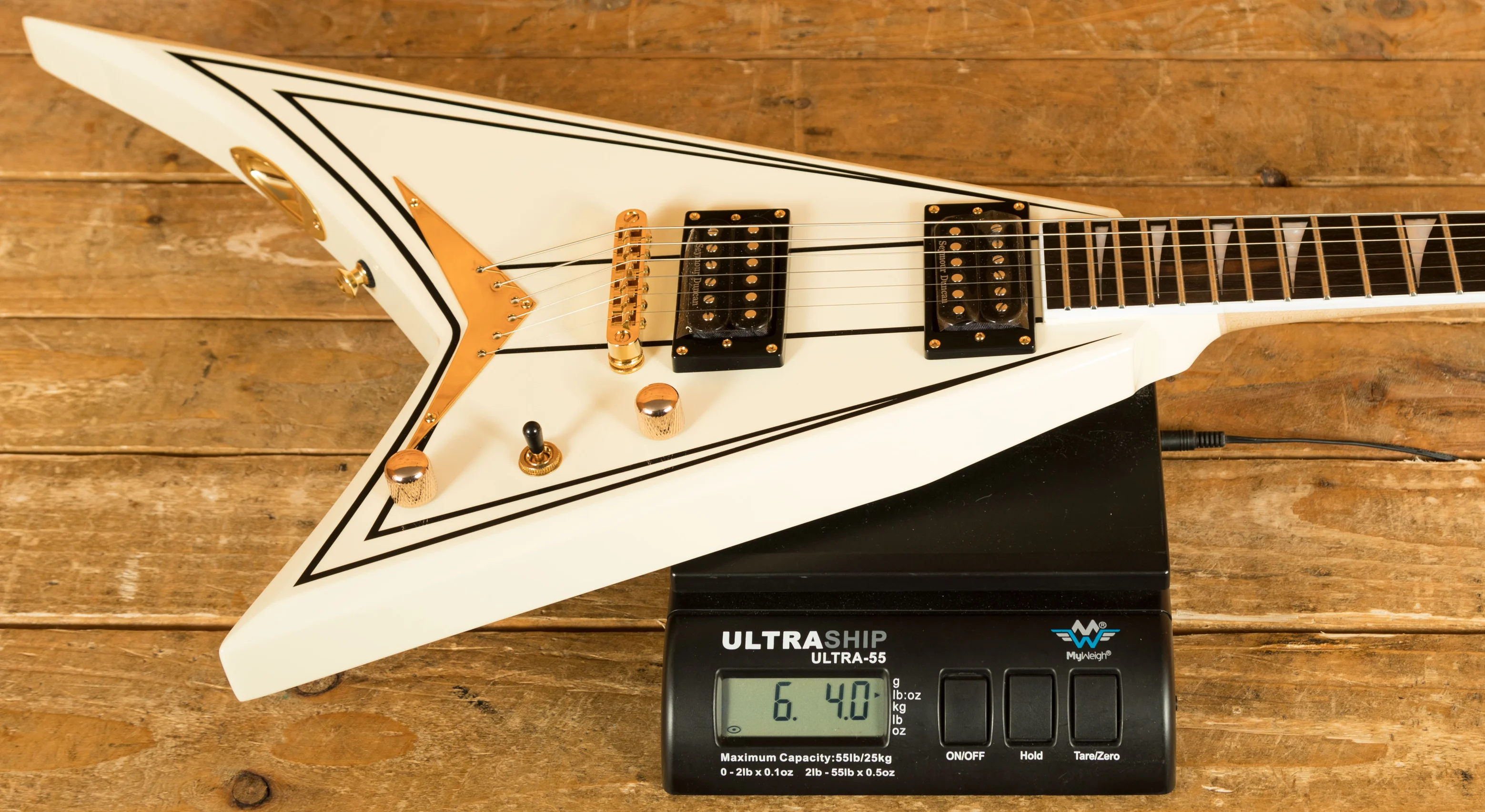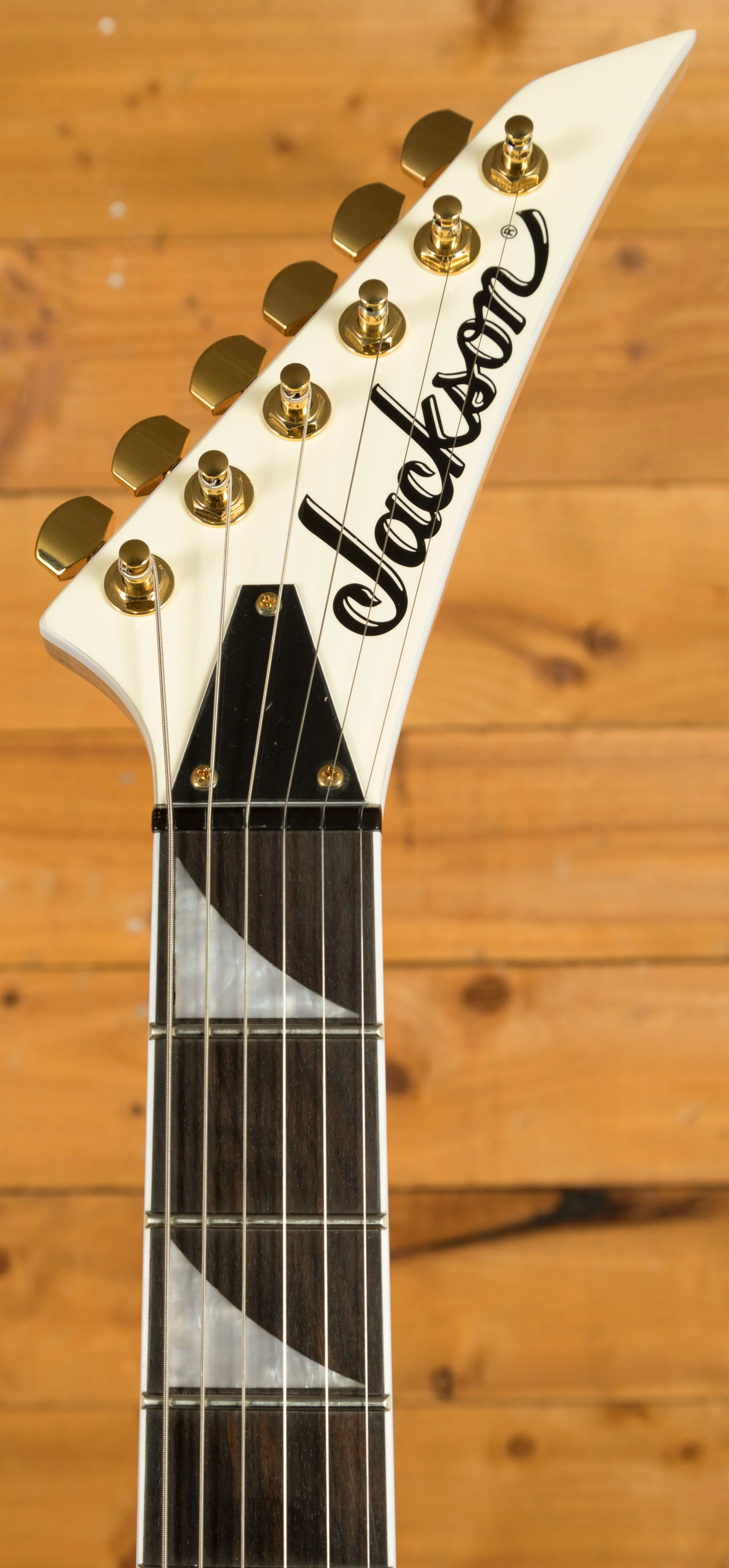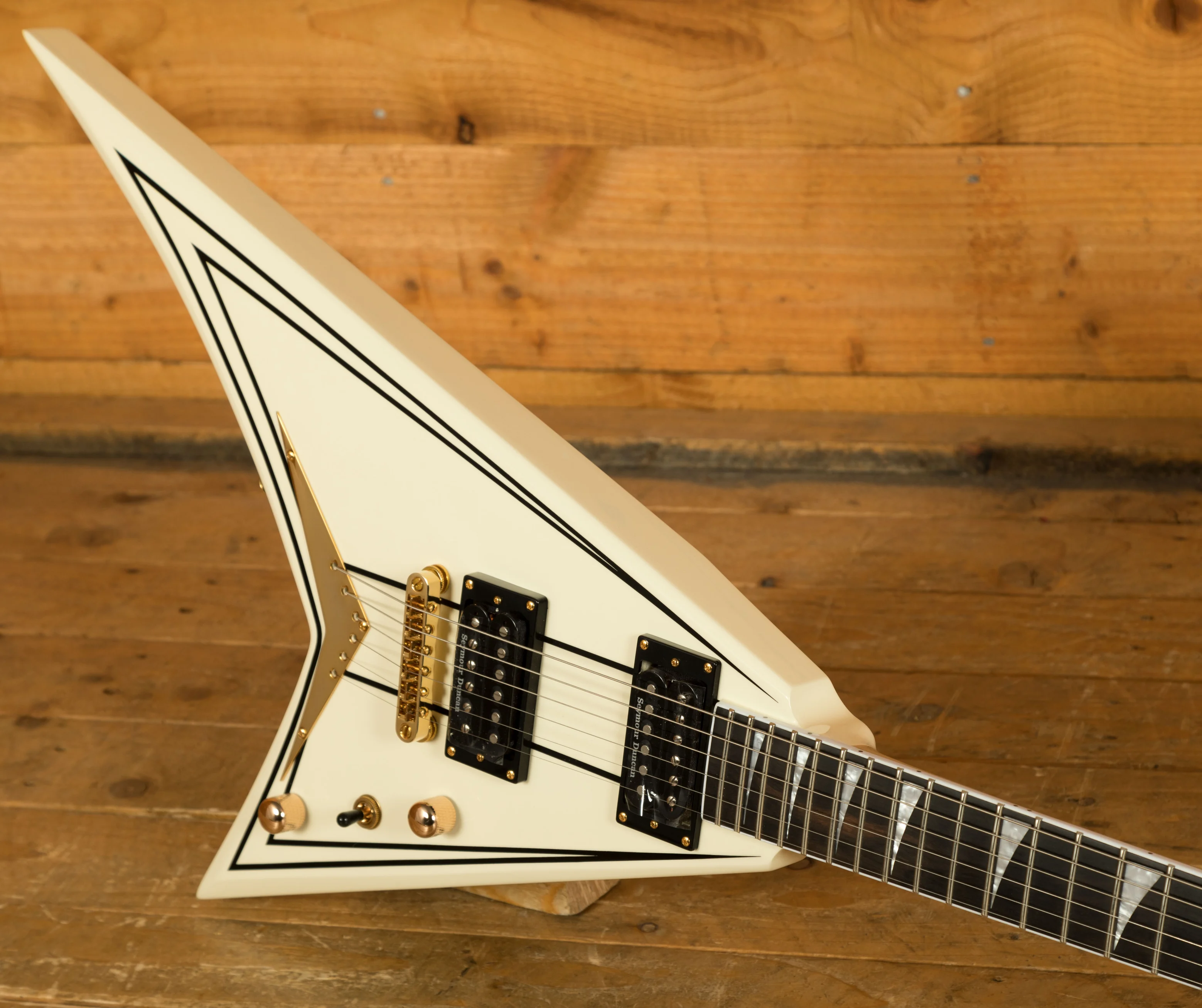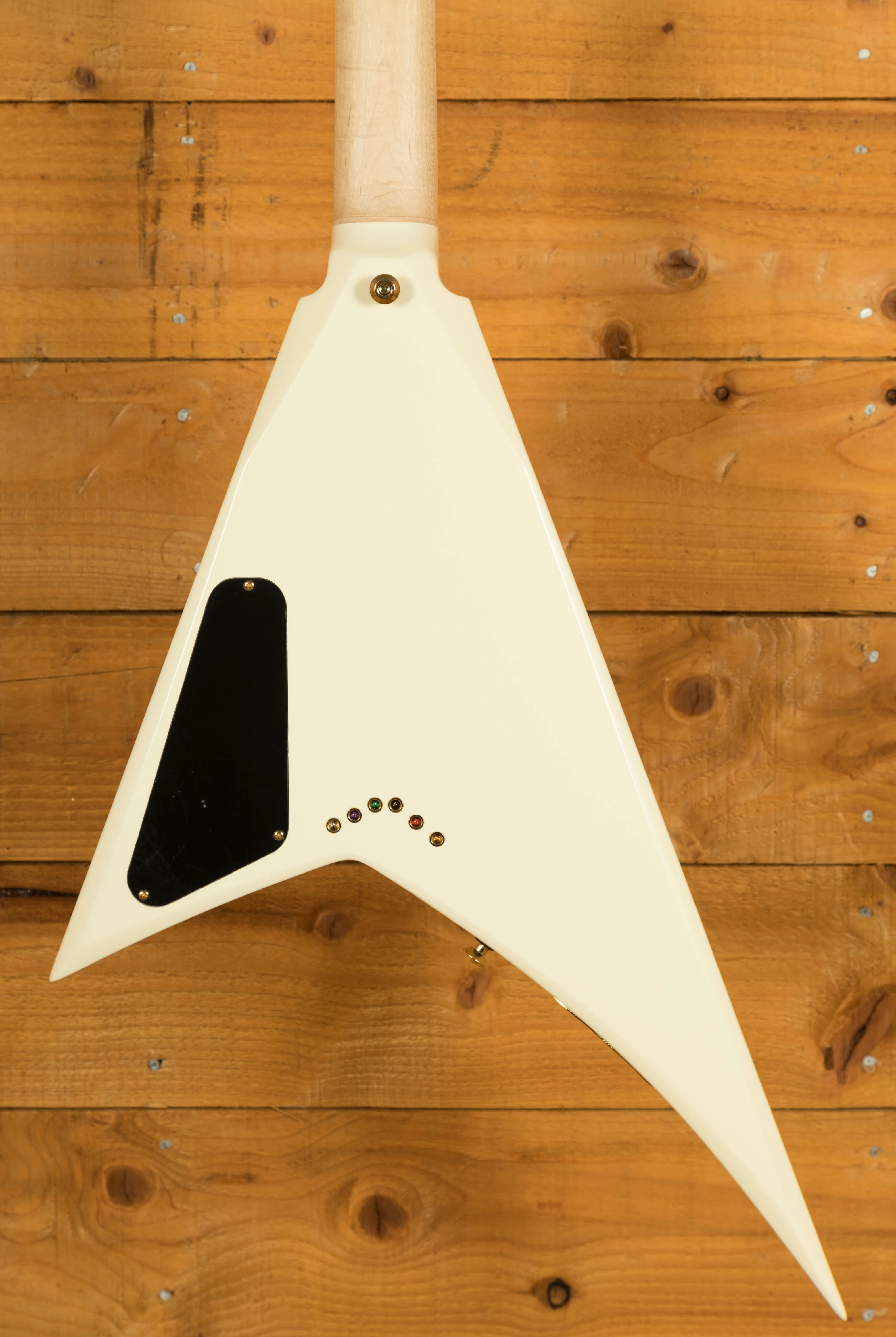 With its Ivory finish, black pinstripes and gold hardware, the RRT-3 is an elegantly formidable V-shaped axe loaded with supercharged features including a mahogany body, graphite-reinforced through-body maple neck with scarf joint and an ultra-smooth oiled back finish. Its bound 12"-16" ebony fingerboard hosts 22 jumbo frets and pearloid sharkfin inlays.