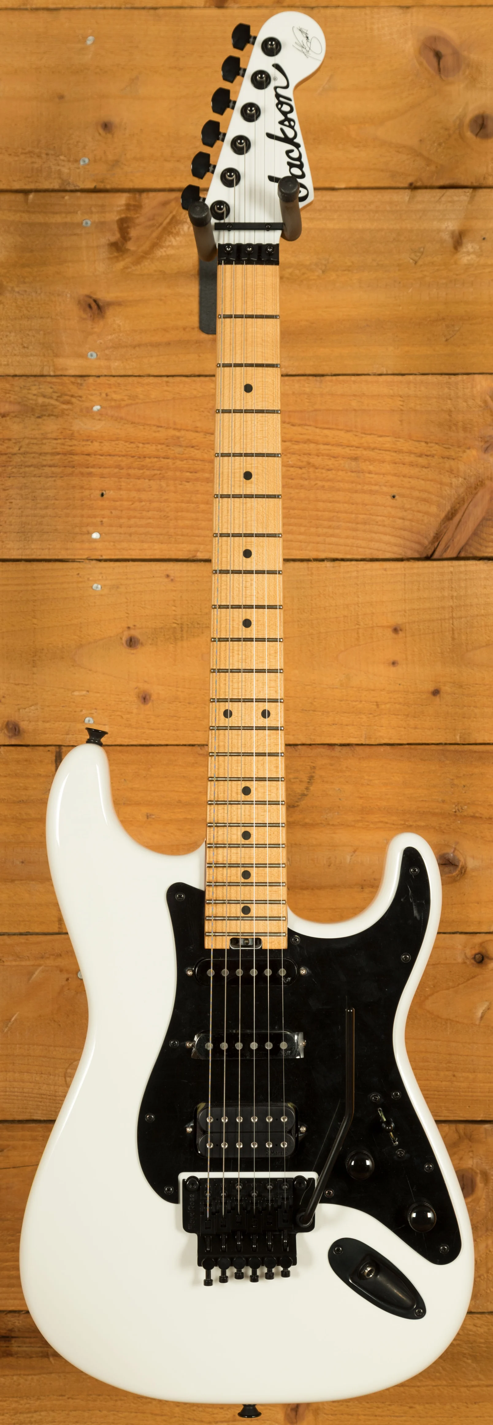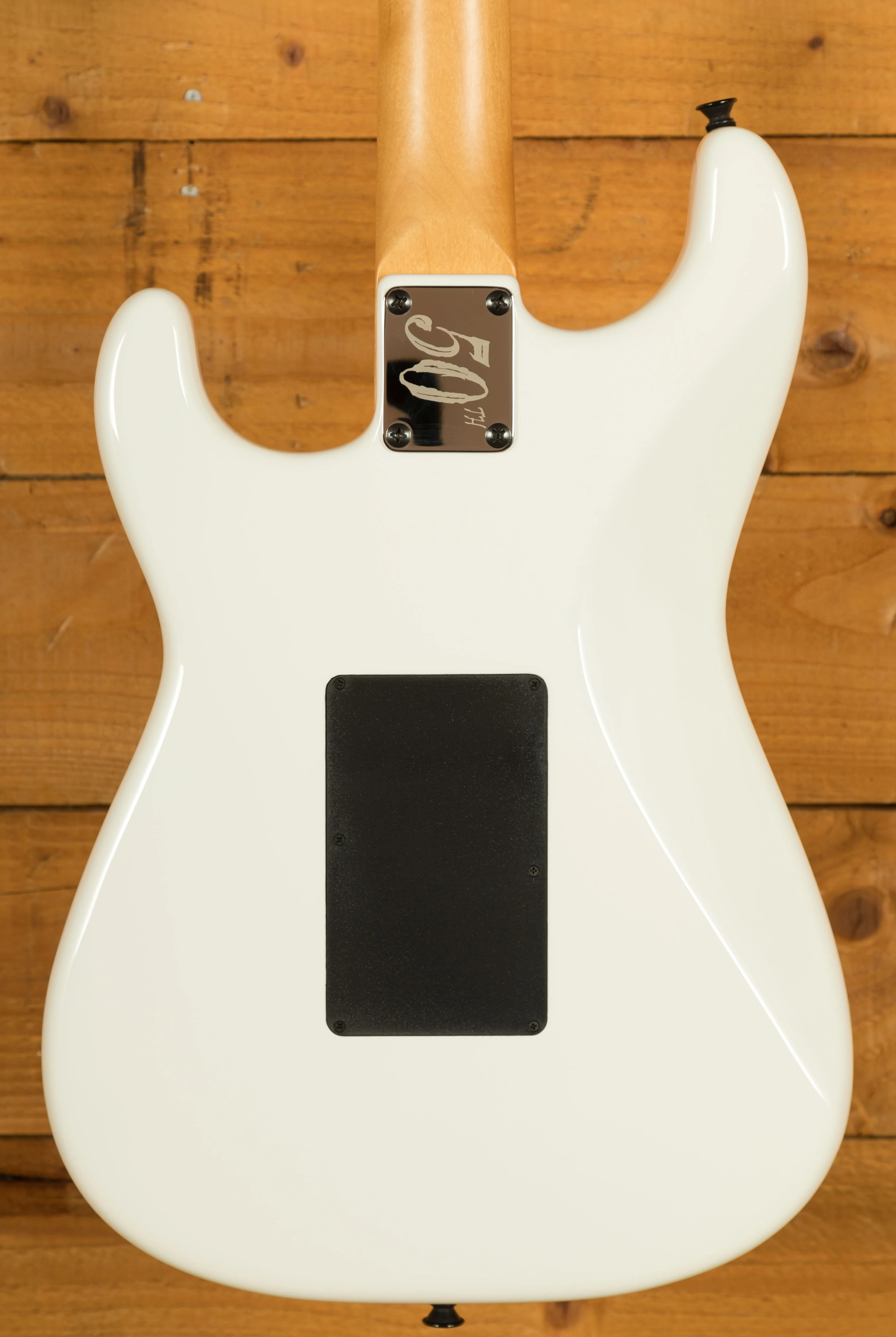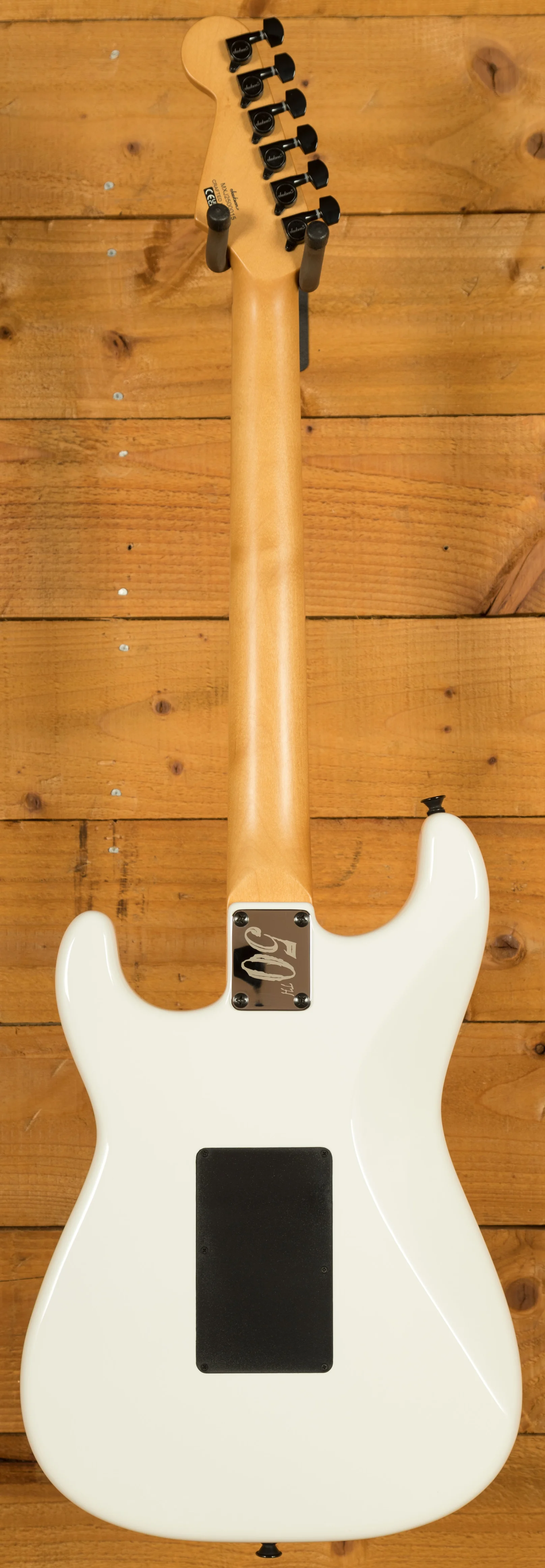 This guitar sits beautifully between his cheaper X Series models and his full-fat USA Signature. Adrian's main guitar live is still his Jackson USA model and this guitar has many of the same features, giving it the edge over the X Series model. You can get to the heel-mount truss rod easily, it has the alder body (as opposed to poplar), and a quartersawn maple neck. It has the hand-rubbed urethane neck, as Adrian loves the feel of necks worn back a bit, and this echos that smooth feel. He's also likes the Eric Clapton worn-in maple look, which this will give over time. He also loves having the Fender Strat sound on the neck and middle pickups whilst being able to provide the Maiden heaviness with the bridge pickup. The pickups in this mirror the pickups in his USA signature - DiMarzio Super Distortion DP100 in the bridge, and Samarium Cobalt Noiseless in the middle and neck. I think this version of his guitar looks killer, with the maple being tinted and with the white headstock. It's worth noting that the Floyd on this version is also top mounted, rather than recessed like the X Series version. These won't hang around and nor should they - Adrian has been delivering his killer playing and writing for decade after decade, inspiring many of us to start and continue playing. The guitar also features a cool 50th Anniversary neckplate.