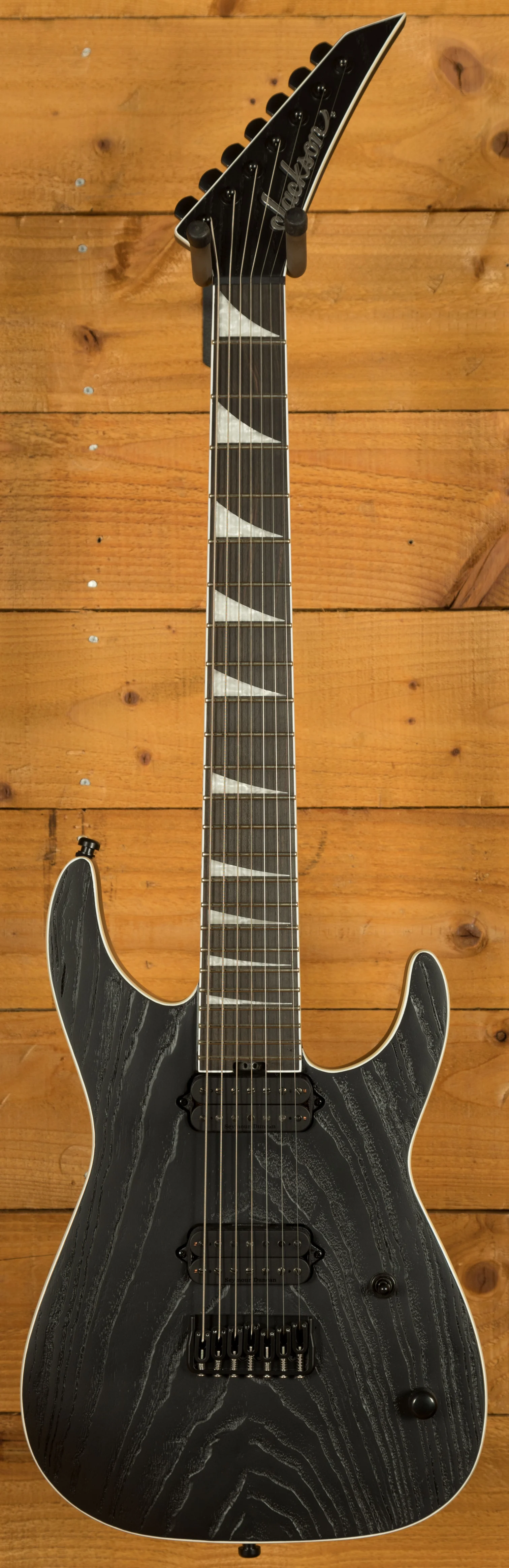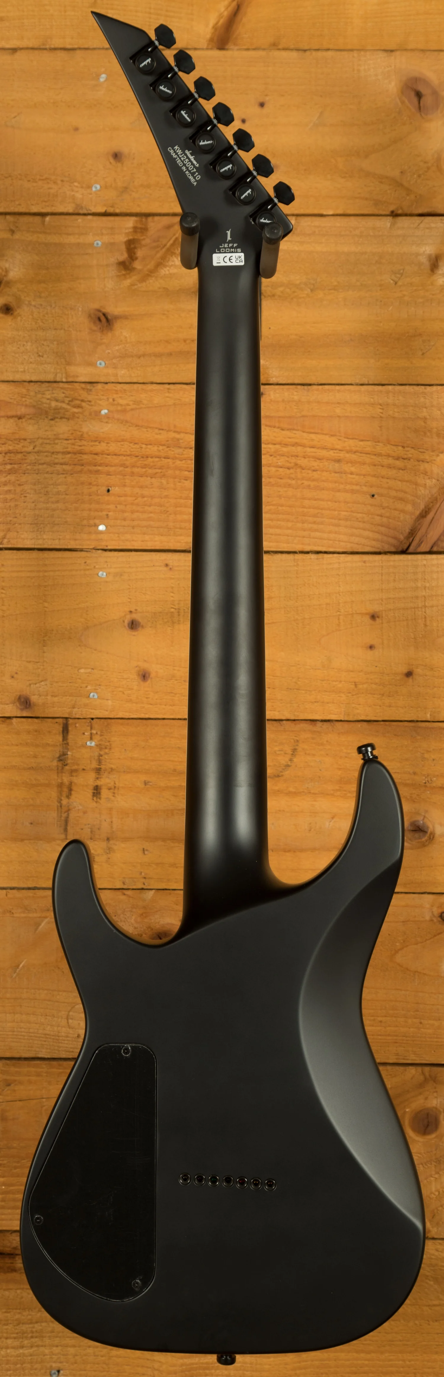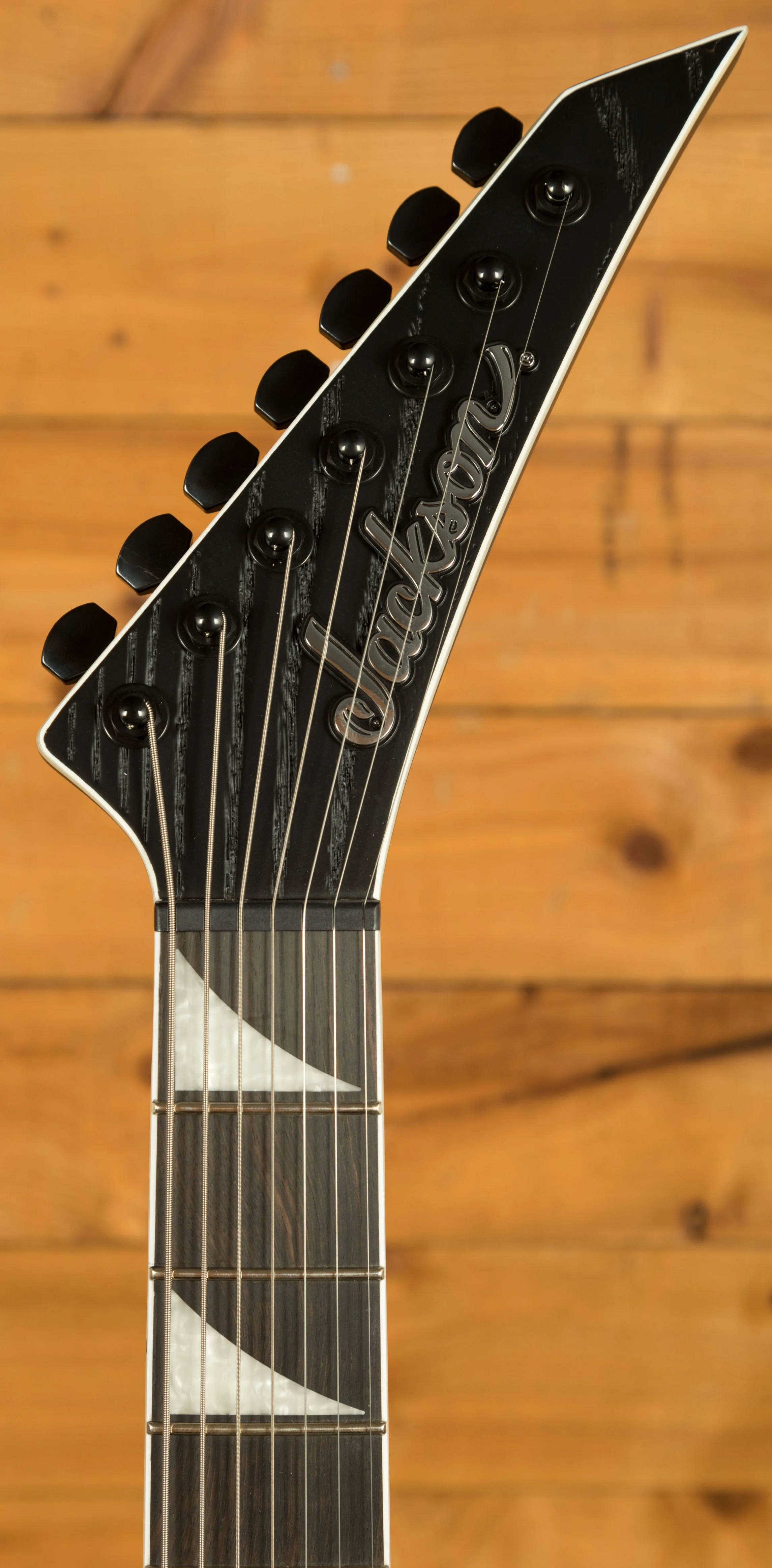Additional hardware includes a Hipshot hardtail bridge with string-thru body construction and Jackson locking tuners, ensuring excellent tuning stability and intonation, even during intense performances. The sleek Satin Black finish, Jackson’s signature pointed 7-in-line headstock, and black hardware give the guitar a stylish, modern look that matches its powerful performance capabilities.