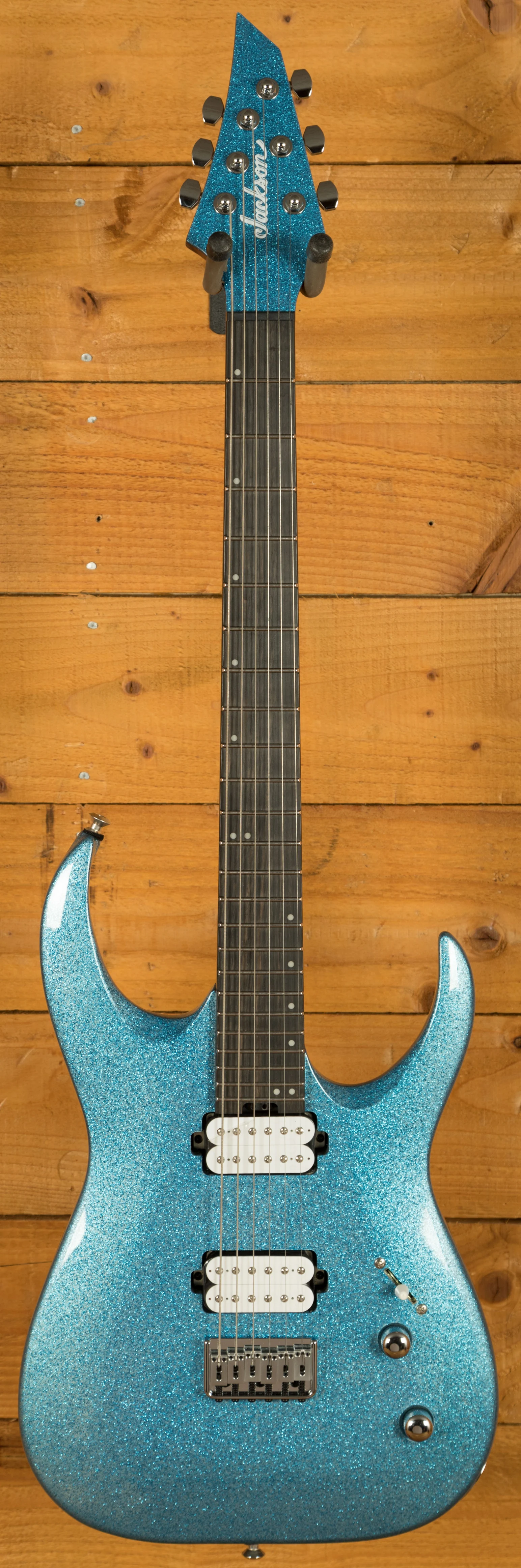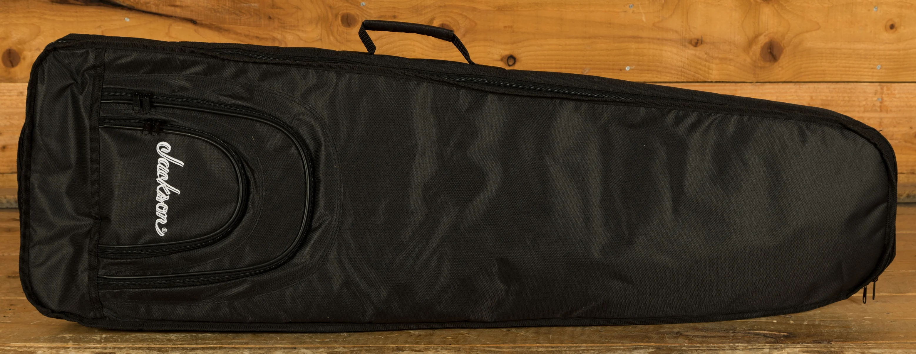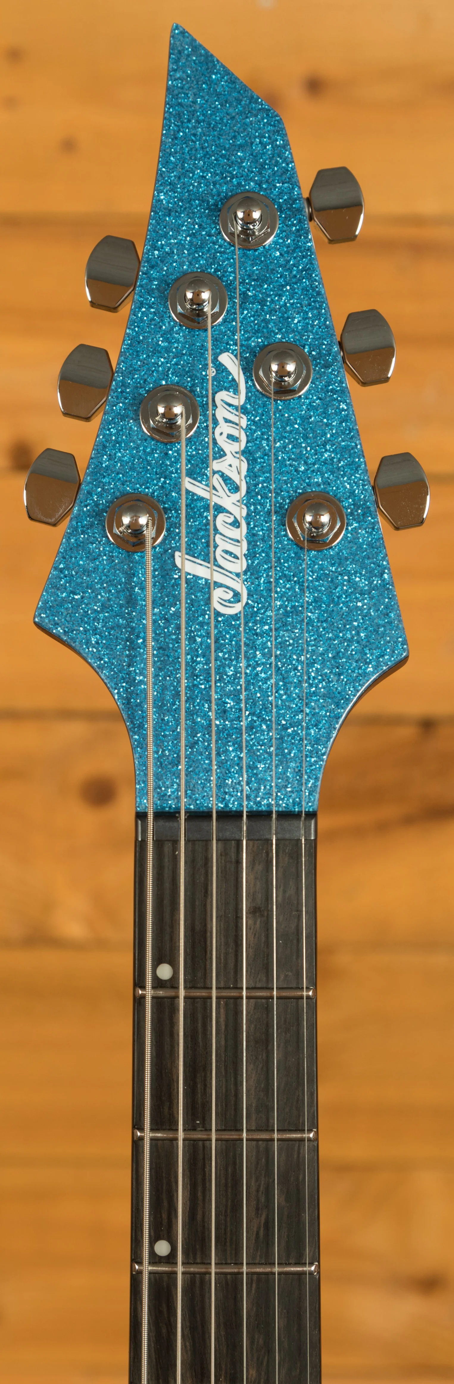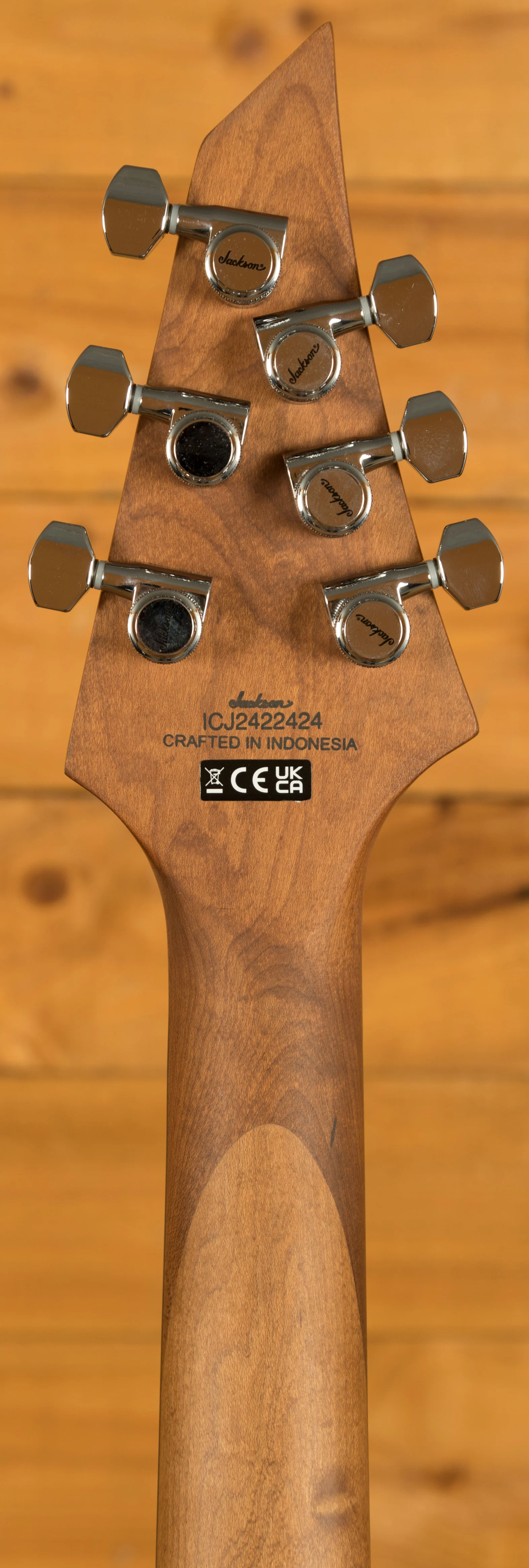 Hardware features include a Jackson HT6 string-through-body hardtail bridge for improved resonance and tuning stability, sealed die-cast locking tuners for quick string changes and enhanced tuning reliability, and Dunlop dual-locking strap locks for secure handling during live performances.