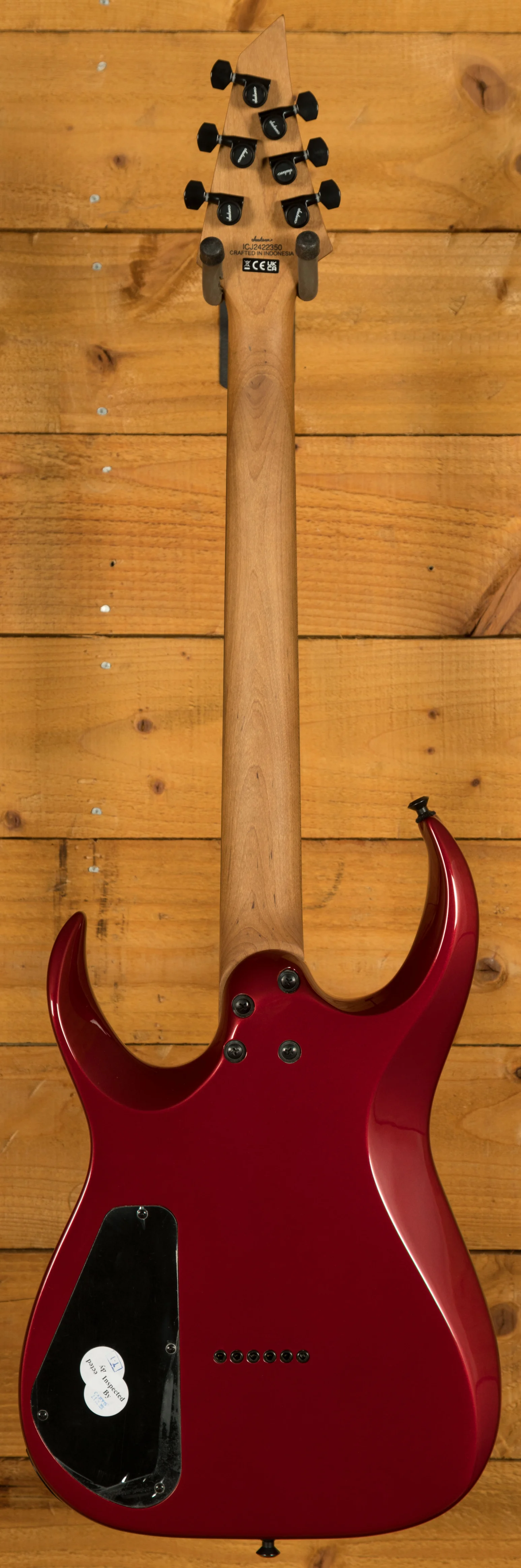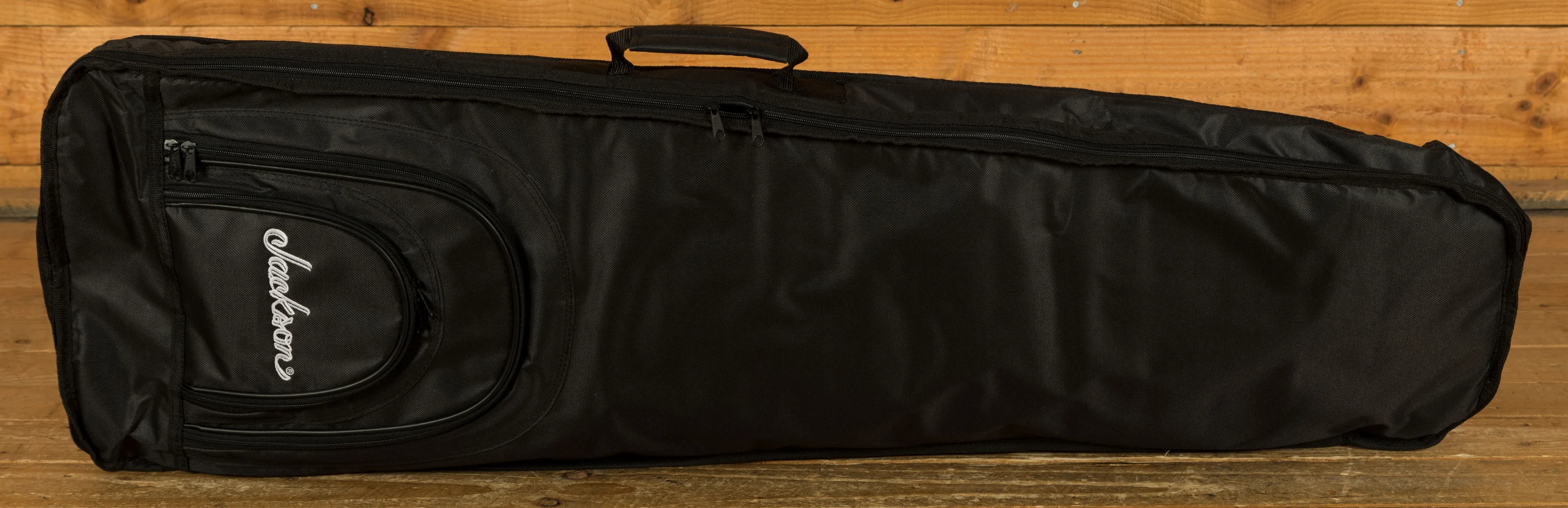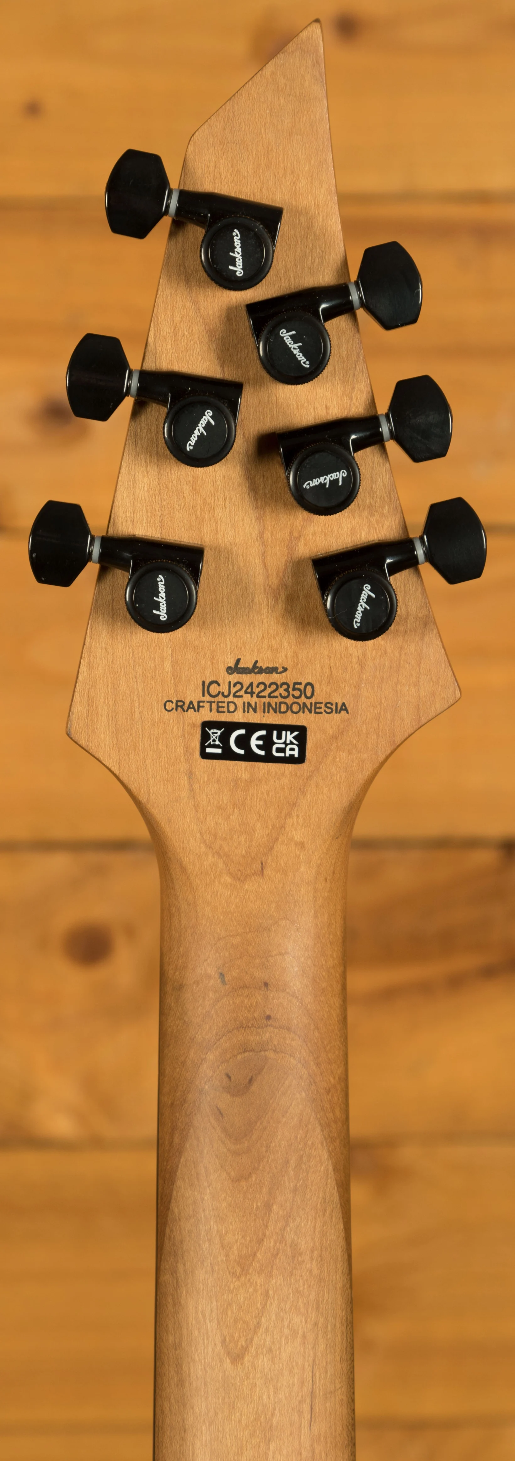 Hardware features include a Jackson HT6 string-through-body hardtail bridge for improved resonance and tuning stability, sealed die-cast locking tuners for quick string changes and enhanced tuning reliability, and Dunlop dual-locking strap locks for secure handling during live performances.