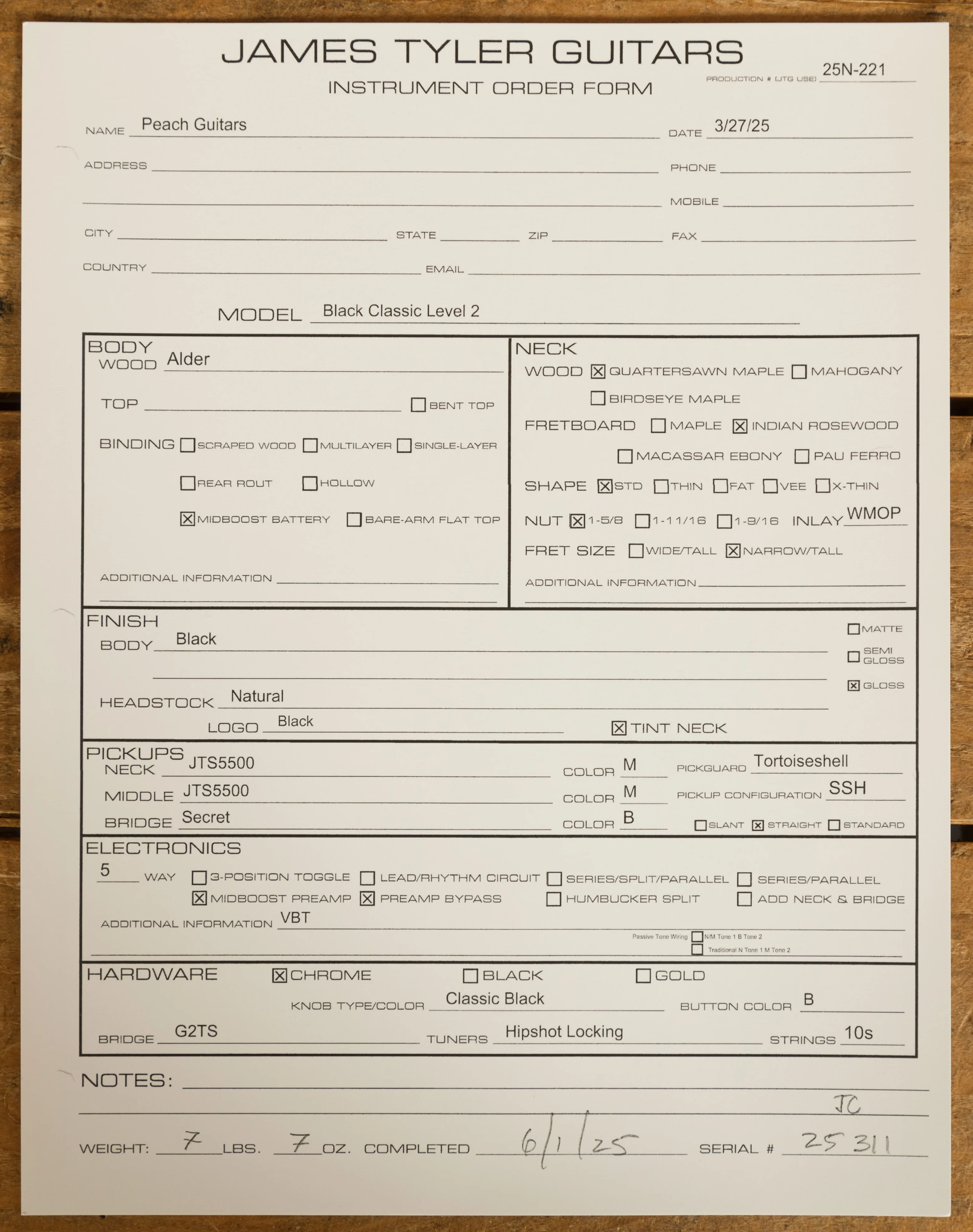 Neck and Fretboard: The neck is made from quartersawn maple, paired with an Indian rosewood fretboard. This combination provides exceptional stability, smooth playability, and a warm, rich tonal character. The fingerboard also features a 10"-12" compound radius. The neck shape is Tyler's Classic "Standard" 59 Profile and has "Narrow/Tall" frets