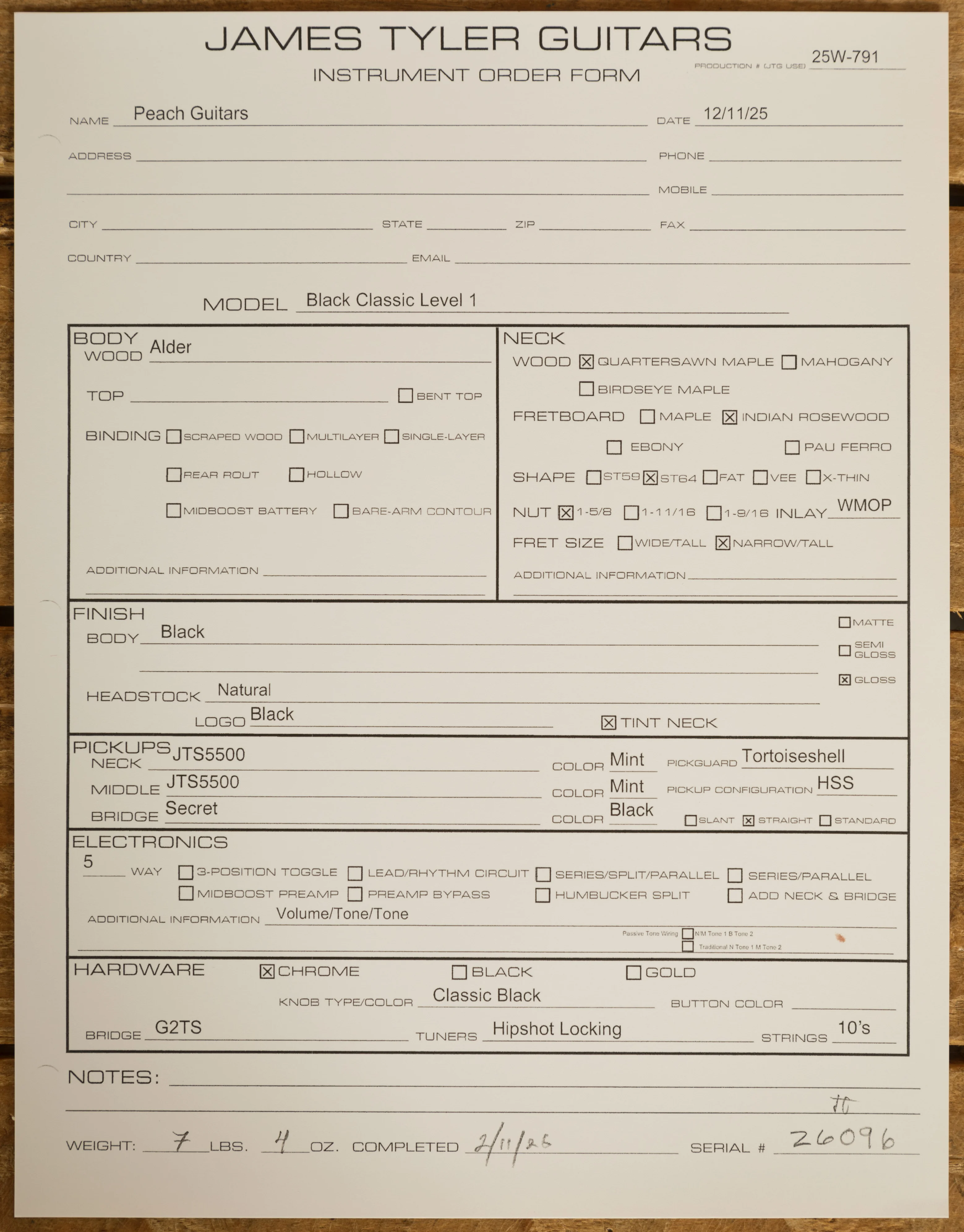 Neck and Fretboard: The neck is made from quartersawn maple, paired with an Indian rosewood fretboard. This combination provides exceptional stability, smooth playability, and a warm, rich tonal character. The fingerboard also features a 10"-12" compound radius. The neck shape is Tyler's "Standard" 64 profile, measuring .825" at the 1st fret and .950 at the 12th, and has "Narrow/Tall" frets.