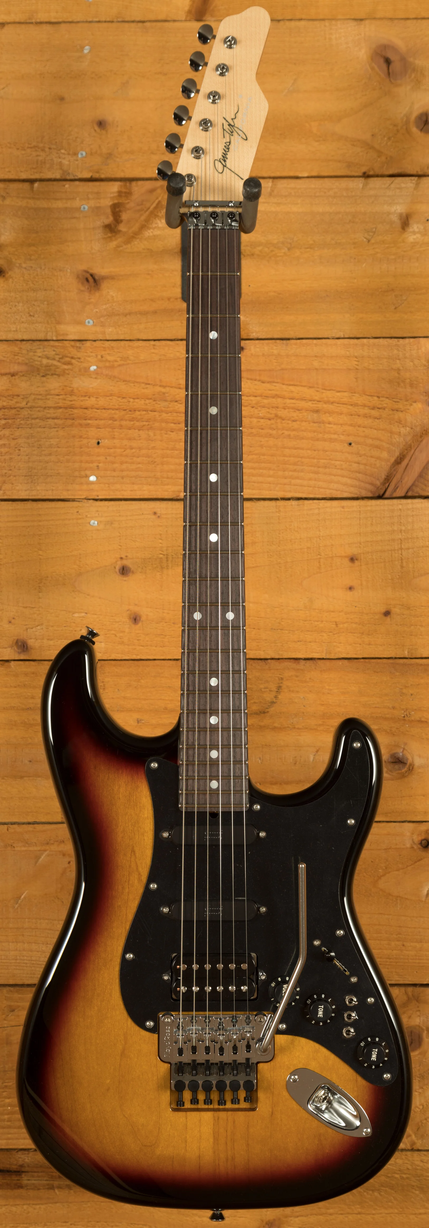 In 1982, Dann Huff met James Tyler and, impressed by the Tyler sound, brought his December 1964 Strat to Jim for modifications. Despite it being an invaluable vintage guitar, Dann insisted on having it "Tylerized." Jim replaced the frets, flattened the radius for a Floyd Rose, installed a Floyd, swapped the pickguard for a single-layer black one, added neck/middle stacks, an original JB 50mm, a Demeter preamp and midboost, and three series/parallel switches with a volume boost knob and tone control. A preamp bypass was placed under the boost knob, and a neck-on switch was added under the tone. Dann rarely turned off the preamp, and the guitar remained untouched until 1994, when David Graef replaced the Floyd with a Wilkinson VS100 and locking tuners.