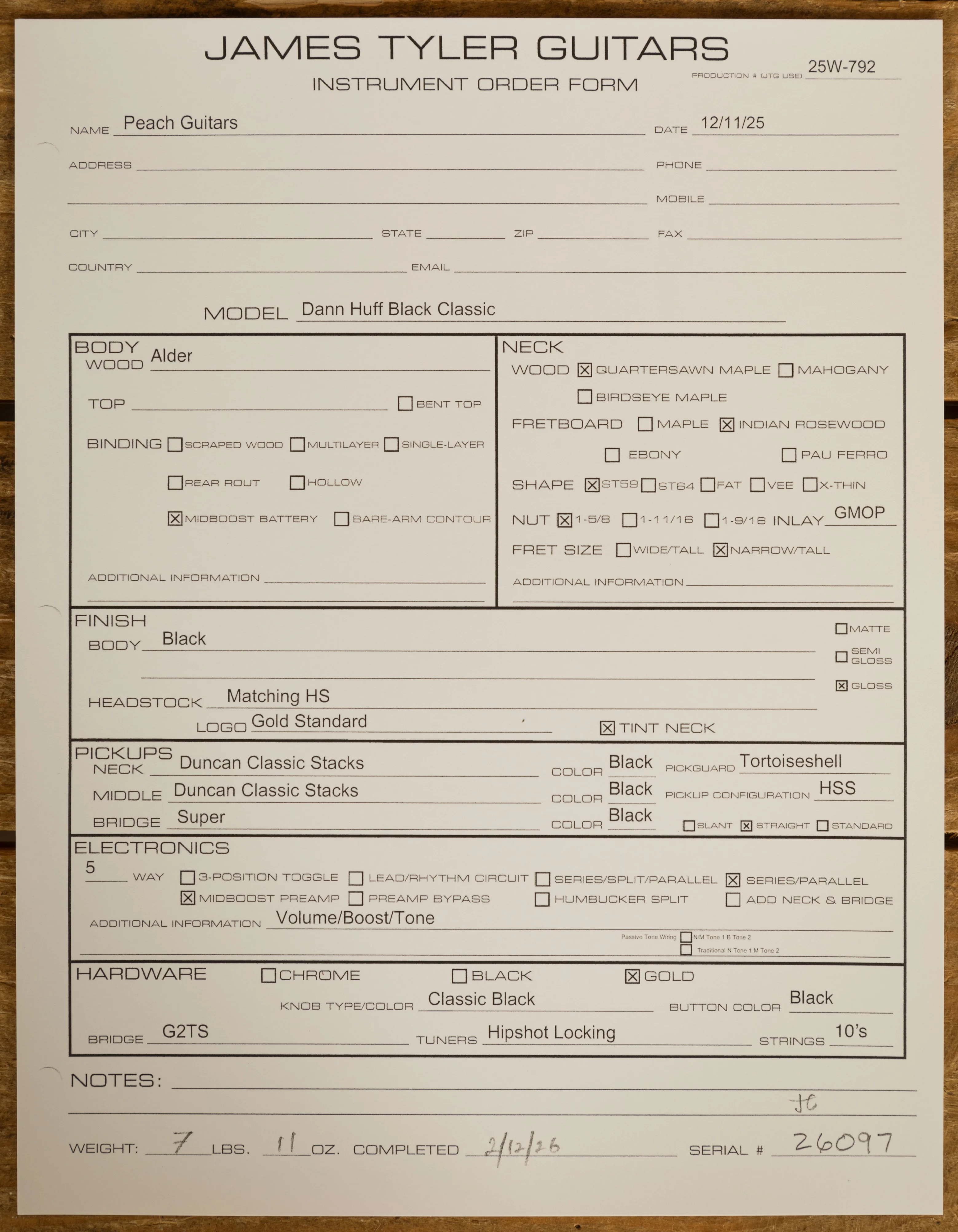 This recreation of that guitar is a passion project from the folks at James Tyler Guitars. A Black Classic with all the modifications to make it like Dann Huff's but with a vintage trem instead.