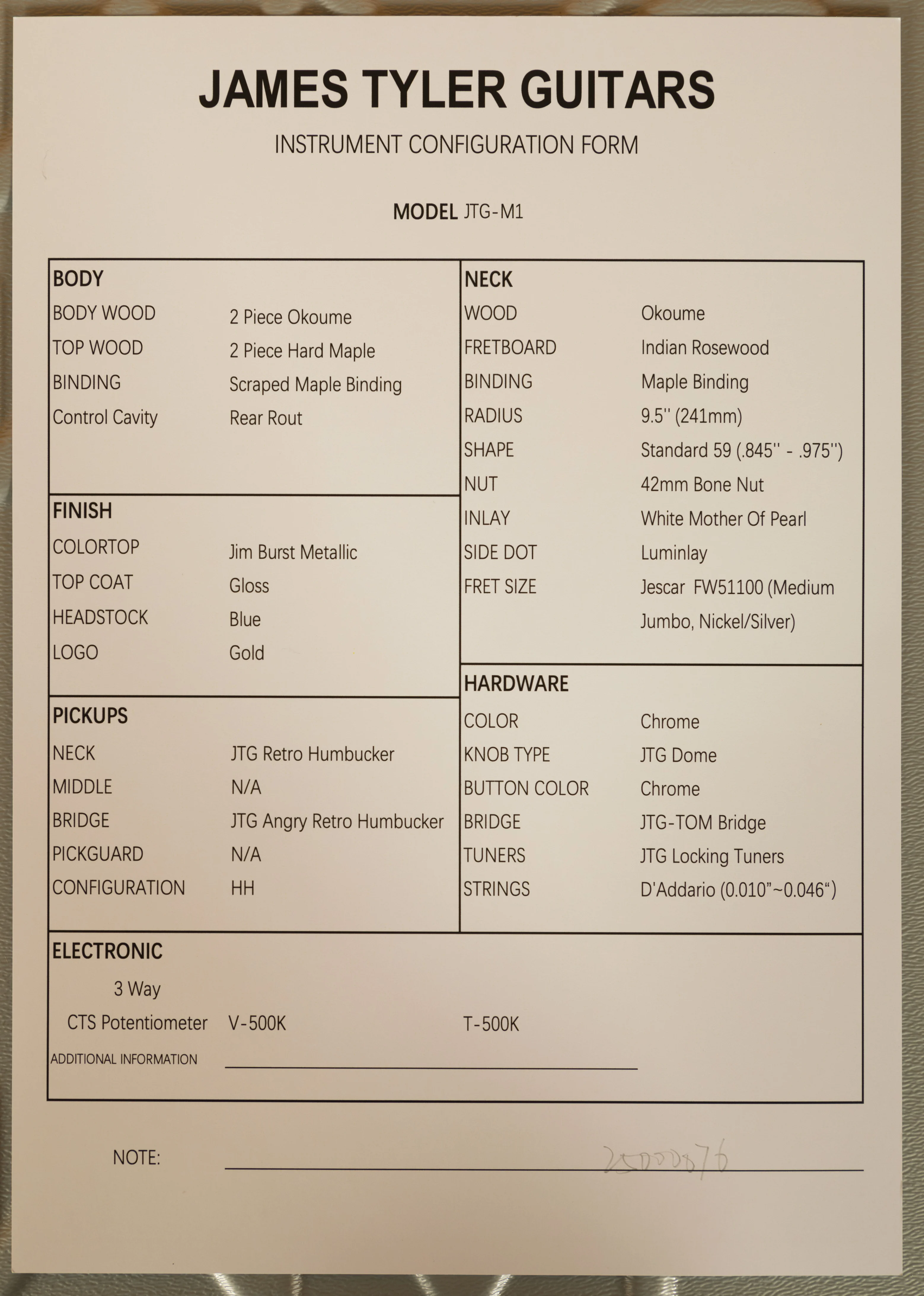 Body: The M1 is crafted from Okoume with a 2-piece hard maple top for a warm, full tone with some high end bite. Finished in Jim Burst Metallic, this regal looking guitar screams ultimate quality.