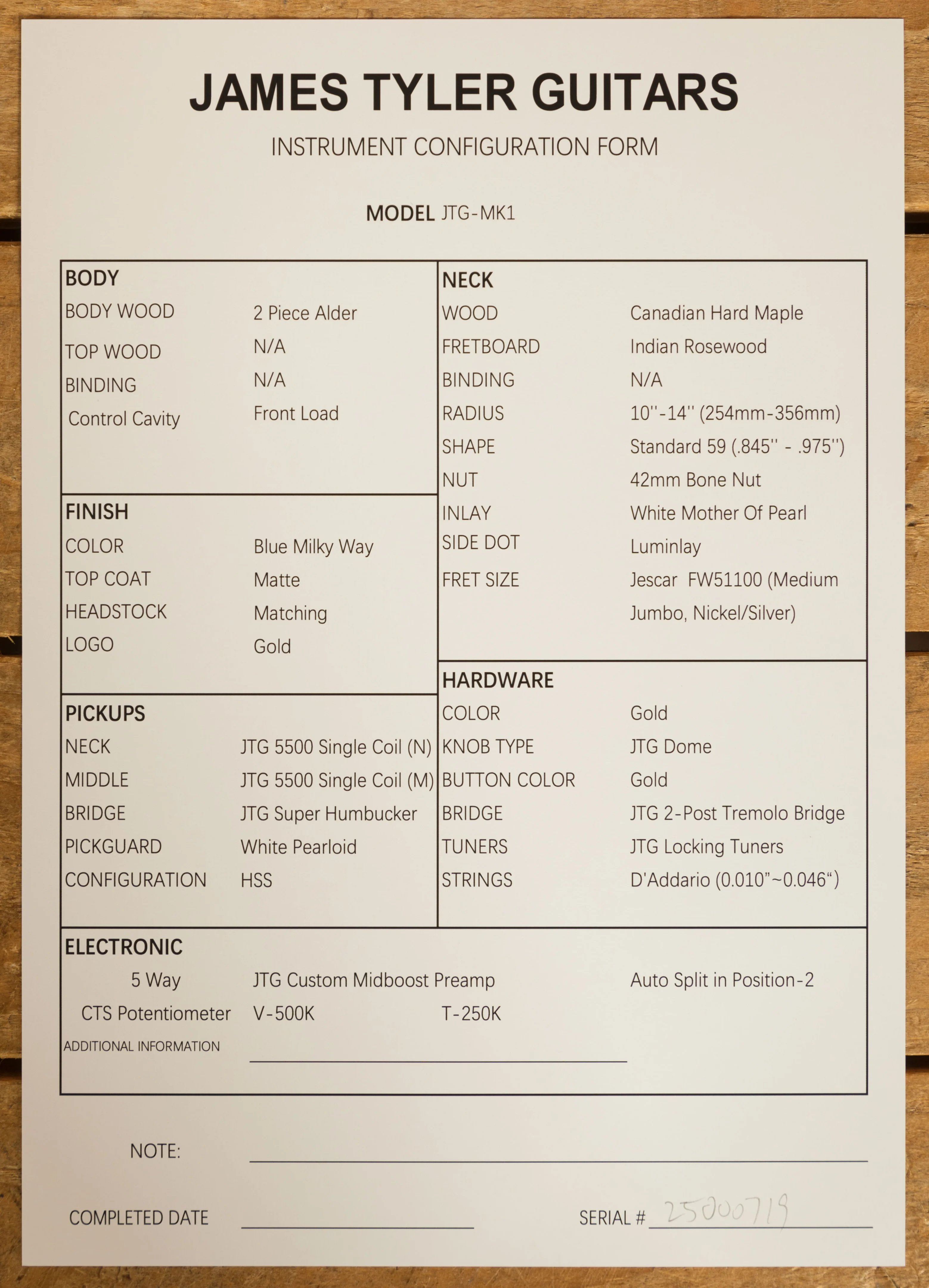 James Tyler guitars offer an exceptional experience in every aspect and the JTG range does not disappoint! Once you hold one, you'll instantly recognise the care and attention to detail put into every aspect of its design - it's as visually striking as it is sonically powerful. Whether you're a studio professional or a live performer, this guitar can handle anything from smooth clean tones to high-gain distortion with ease.
