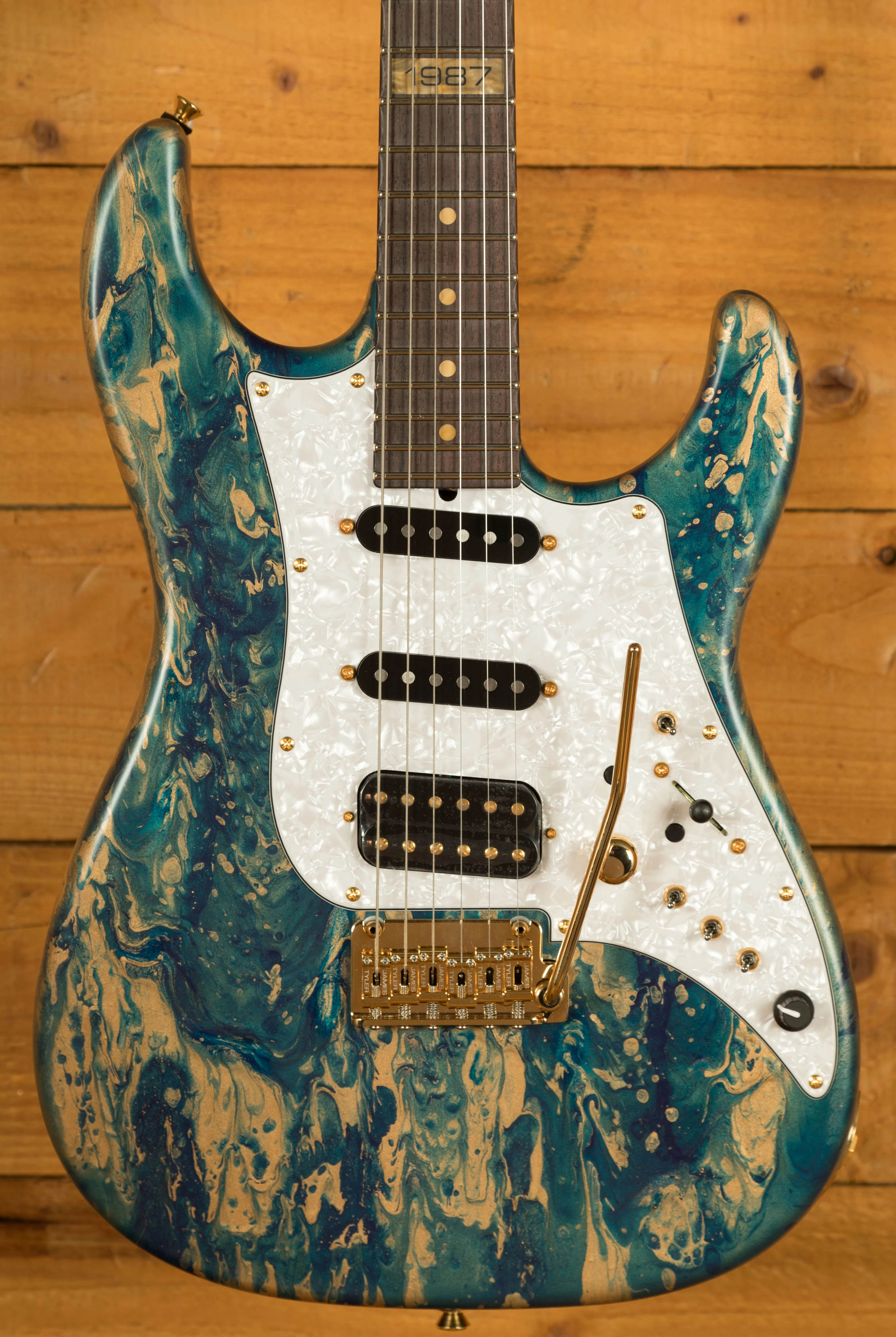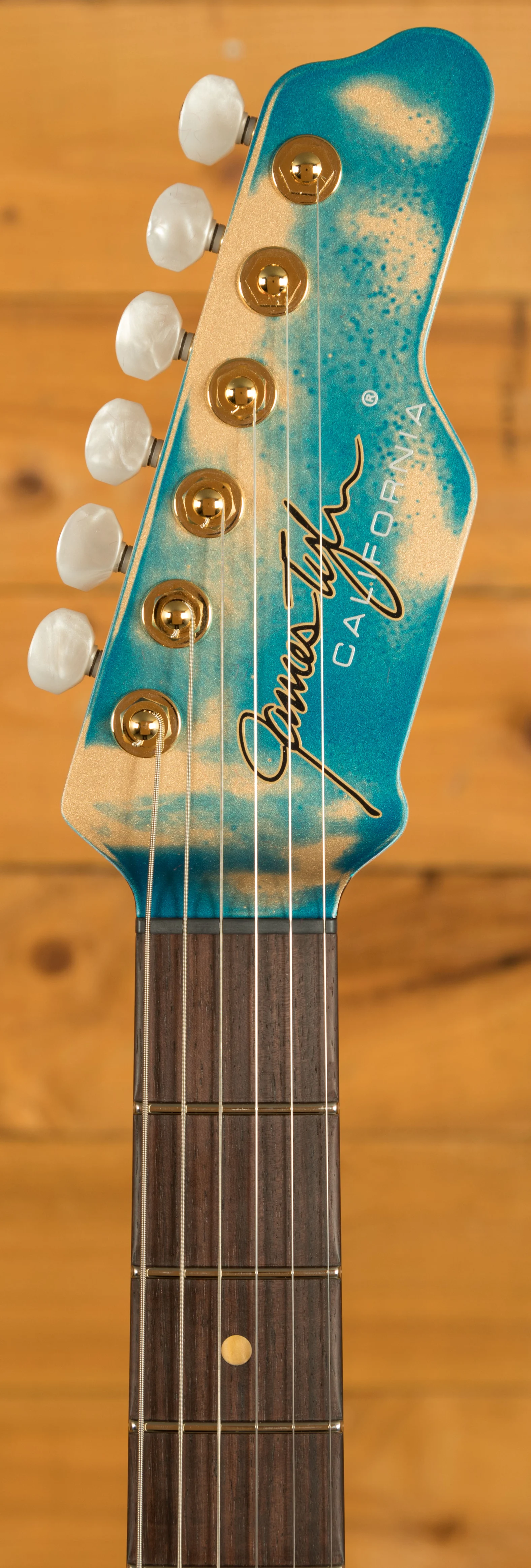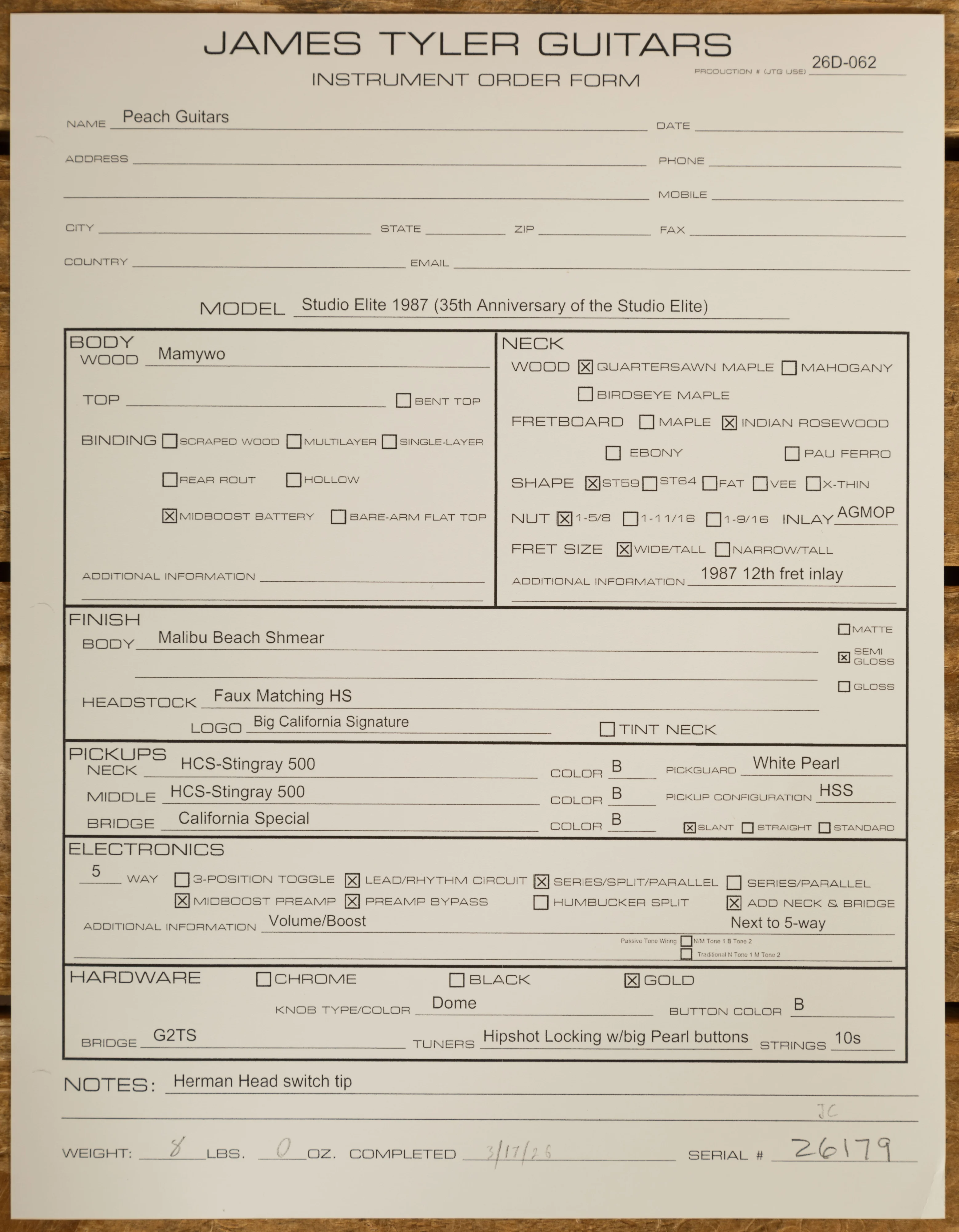 Body: The Studio Elite 1987 is crafted from solid Mamywo, a light wood that gives a nice raise in the mid frequencies. Finished in a semi-gloss Malibu Beach Shmear with faux matching headstock, this model commemorates the 35th anniversary of James Tyler Guitars