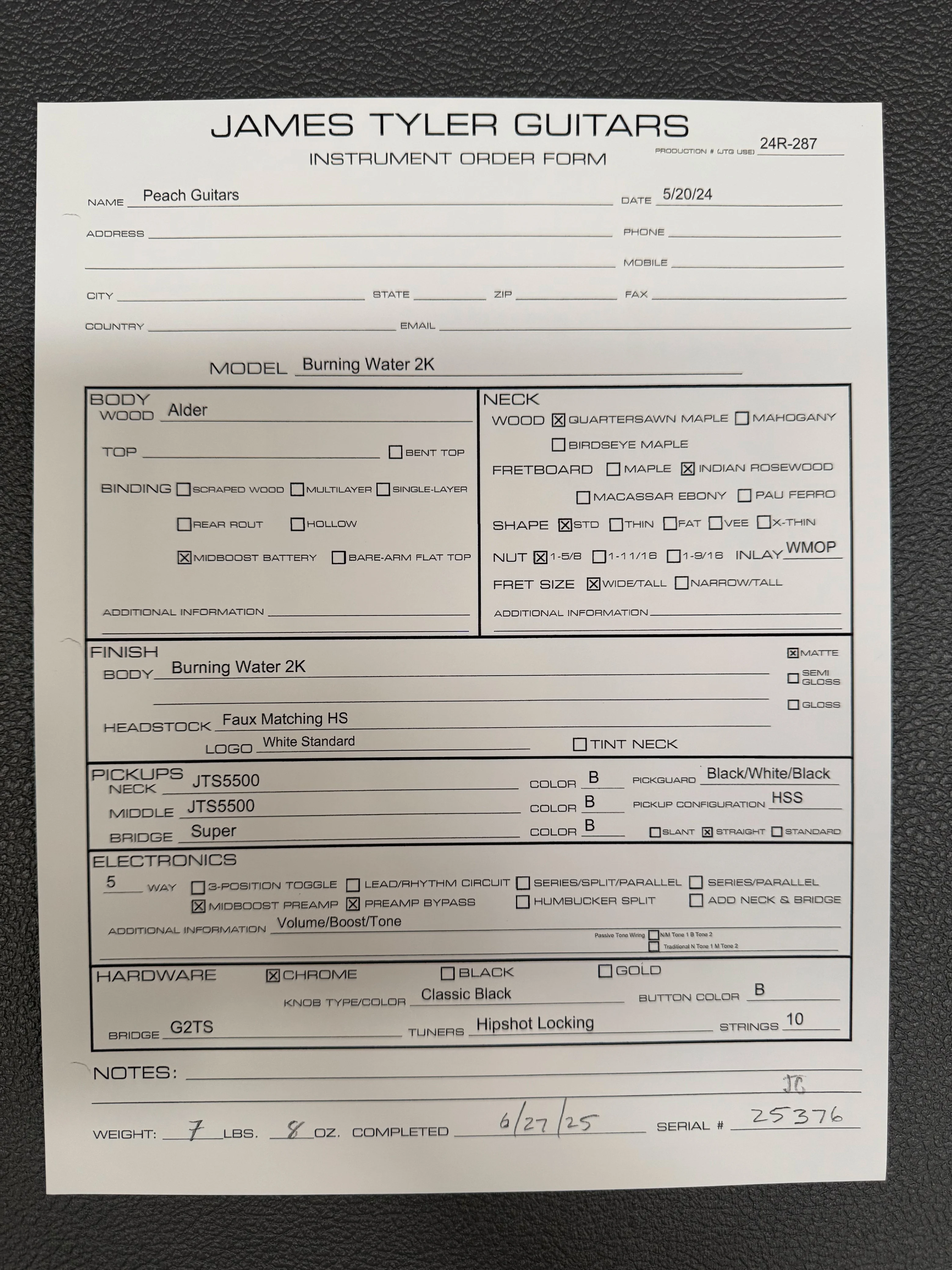 At the heart of the Burning Water 2K is its versatile HSS pickup configuration, featuring James Tylers proprietary JTS5500 pickups in the neck and middle positions, and a Super pickup in the bridge. The JTS5500s are powered by Alnico 5 magnets, delivering a familiar, yet enhanced tone with more attack, chime, and power. Players can expect a well-rounded sound with robust low-end, sparkling mids, and clear highs. The Super pickup is ideal for high-gain settings, offering a strong low end and bright top end while retaining excellent clarity for clean tones. This makes the guitar perfect for a wide range of genres, from rock to blues and beyond.