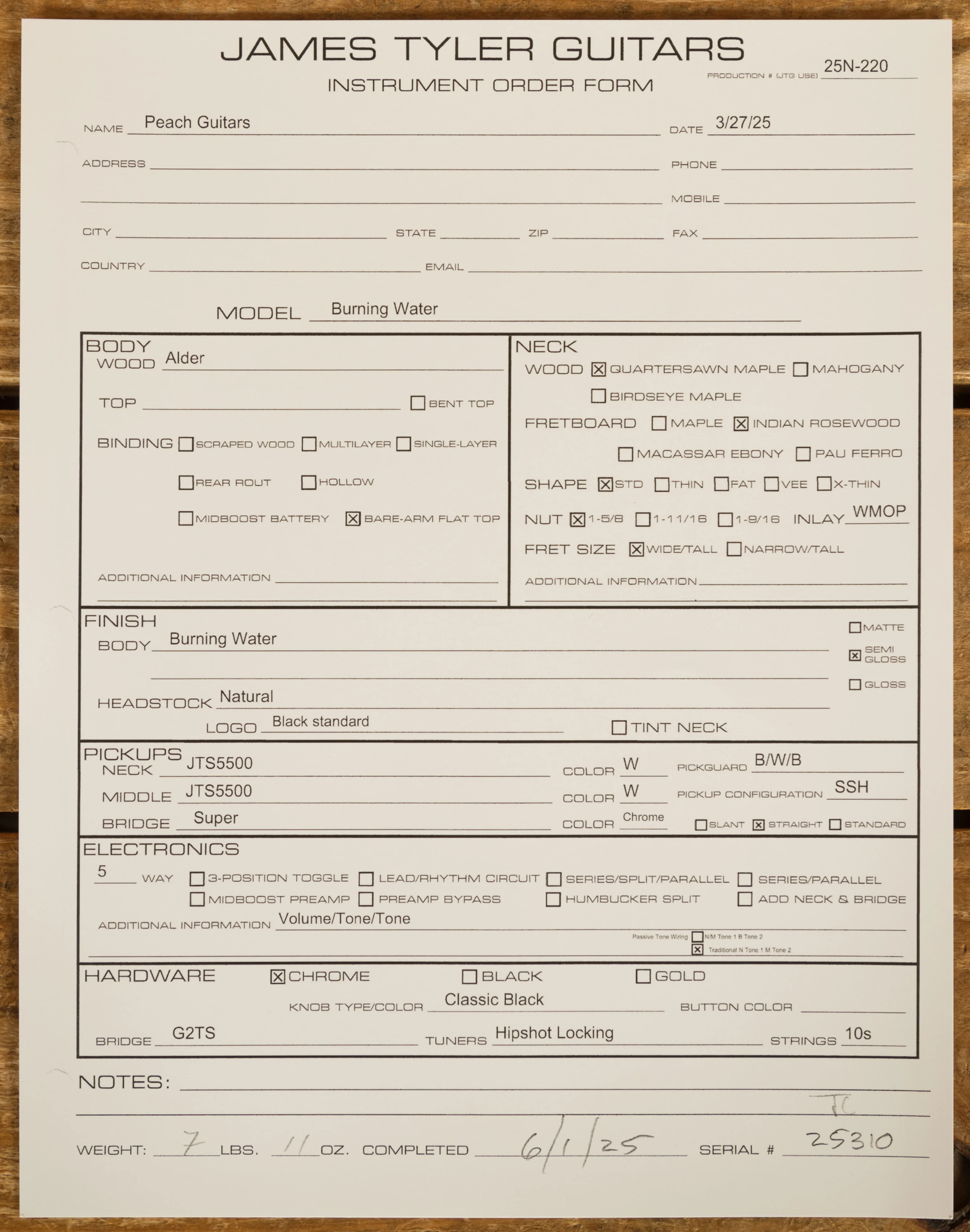 Amongst the Studio Elite models, the Burning Water stands as one of the most iconic creations from James Tyler Guitars. Originally developed for renowned session guitarist Michael Landau, it was named after Landaus band at the time. Over the years, this guitar has become legendary not just for its aesthetic appeal but also for its tonal versatility and powerful sound. Its distinctive look features the bare wood arm contour, making it a standout instrument in any collection.