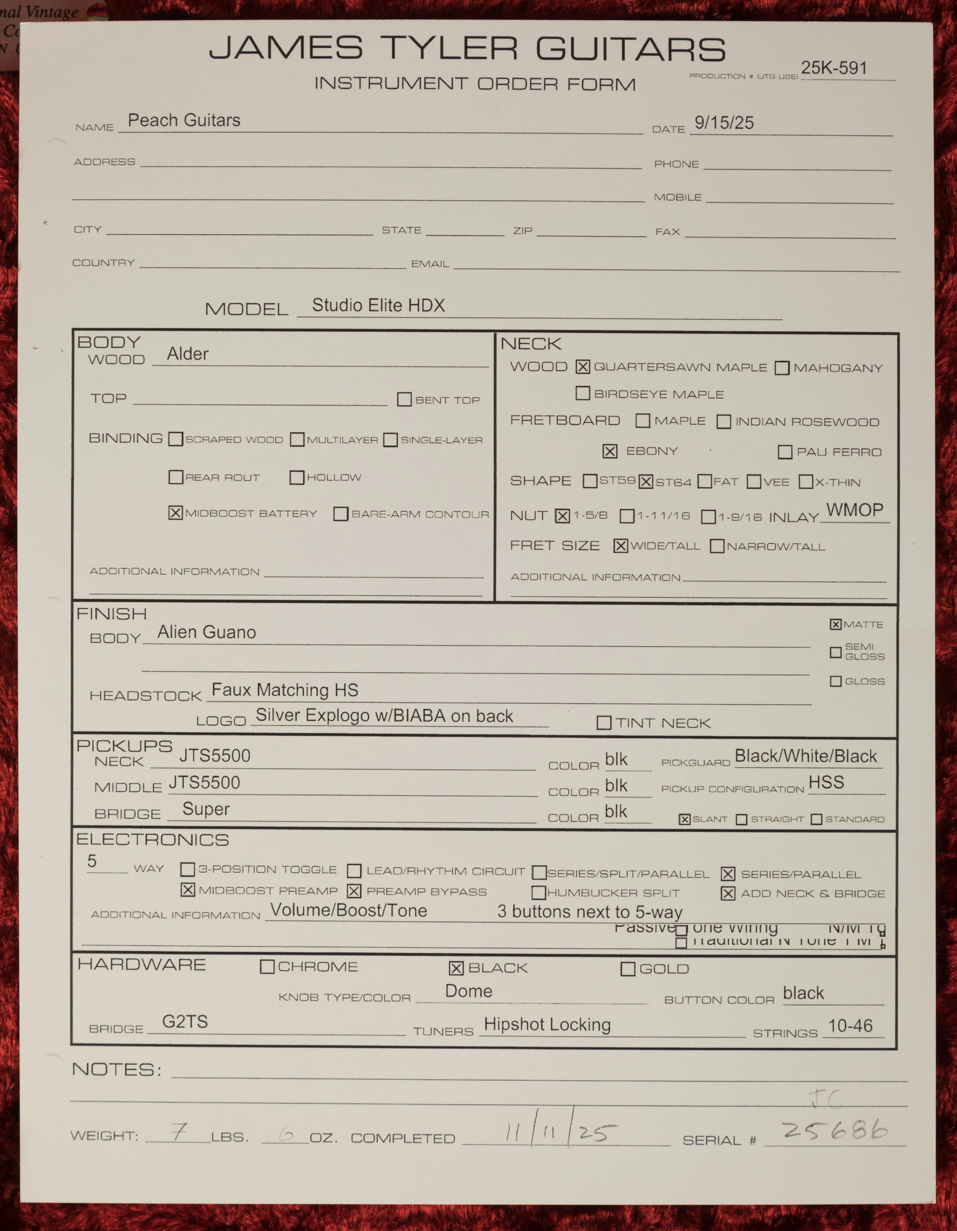 Bridge and Hardware: The Studio Elite HDX is equipped with a Gotoh two-post tremolo with James Tyler branded bent steel saddles, offering excellent tuning stability and smooth performance. Locking Hipshot tuners add to the guitar's reliability, ensuring that it stays in tune even during heavy playing sessions.