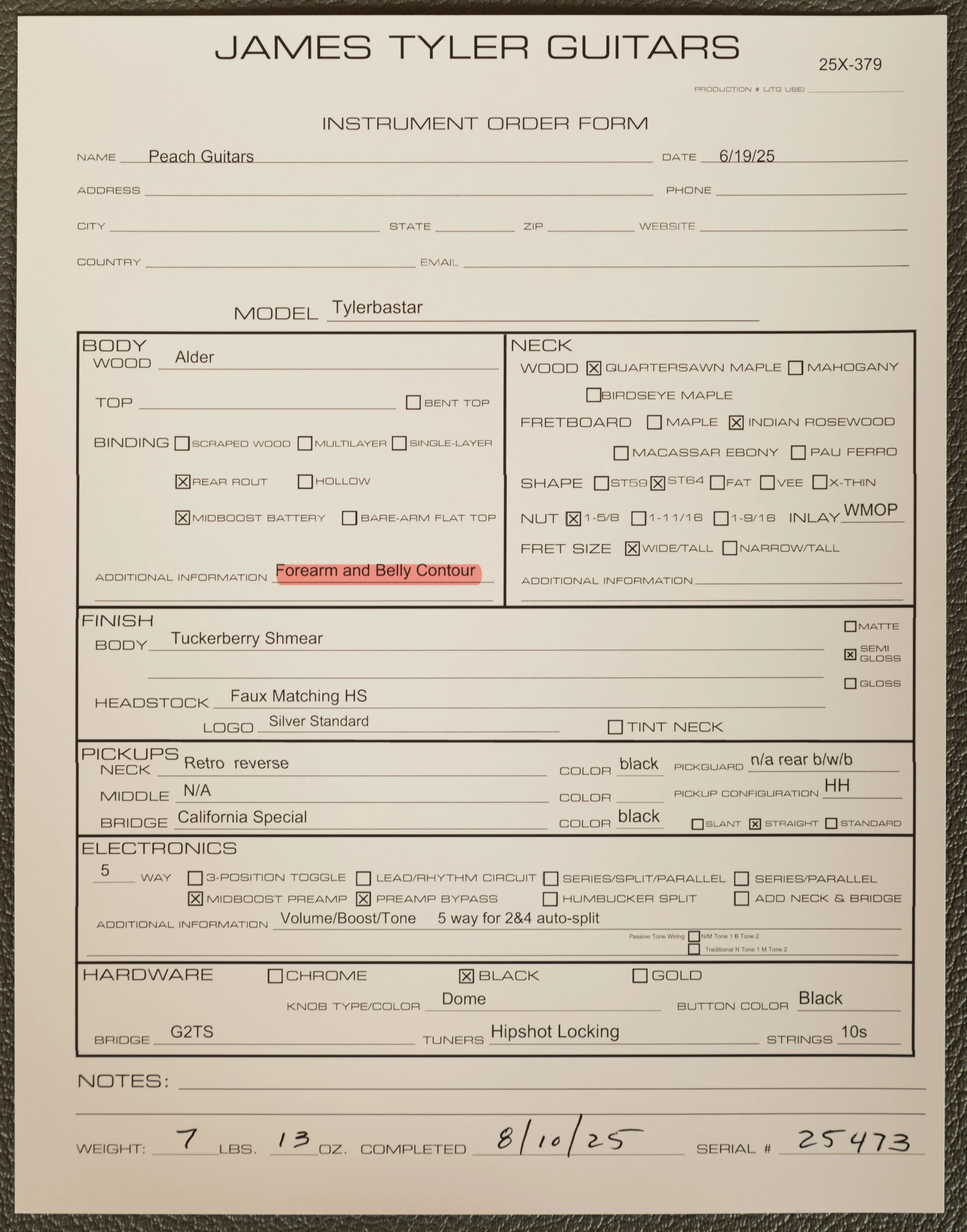 Electronics: This Tylerbastar comes equip with a plethora of electronics for an extremely versatile tonal palate. The active midboost preamp is a high gain/low impedance circuit that gives you lower lows and higher highs with a 2dB volume increase - on top of this, you can utilise the midboost control to increase the mids and output further. This preamp can be bypassed easily with the touch of a button for passive tones or added in to give some extra "oomf" at the perfect moments. It also features a 5-way Super Switch to split the humbuckers in positions 2 and 4.