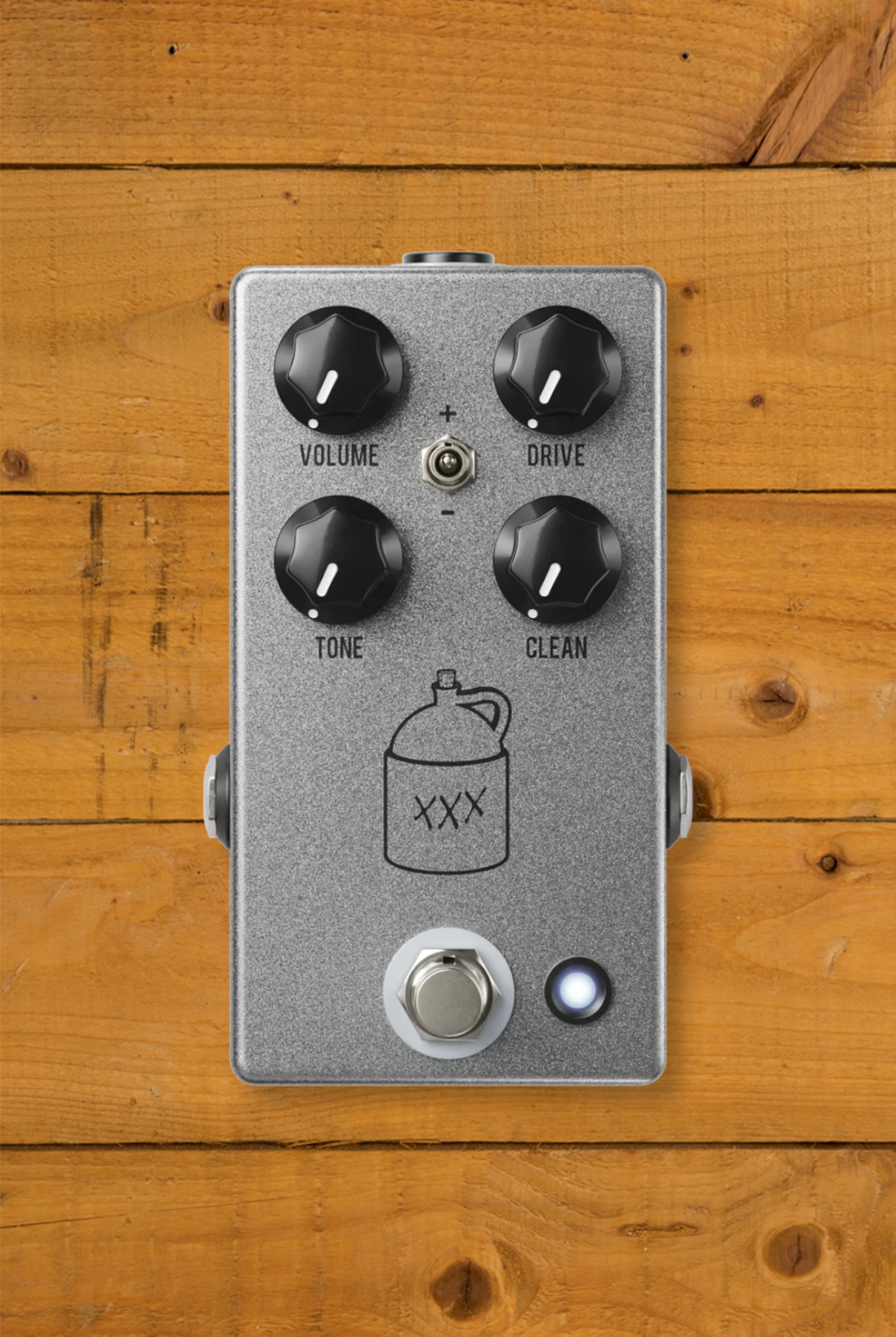 The JHS Moonshine V2 is a bold, mid-heavy overdrive pedal inspired by the legendary green box but reimagined with more gain, more flexibility, and a distinct voice. It retains the familiar Volume, Tone, and Drive layout, but adds two key features: a Clean blend knob and a Proof toggle switch for selecting between low and high gain modes.