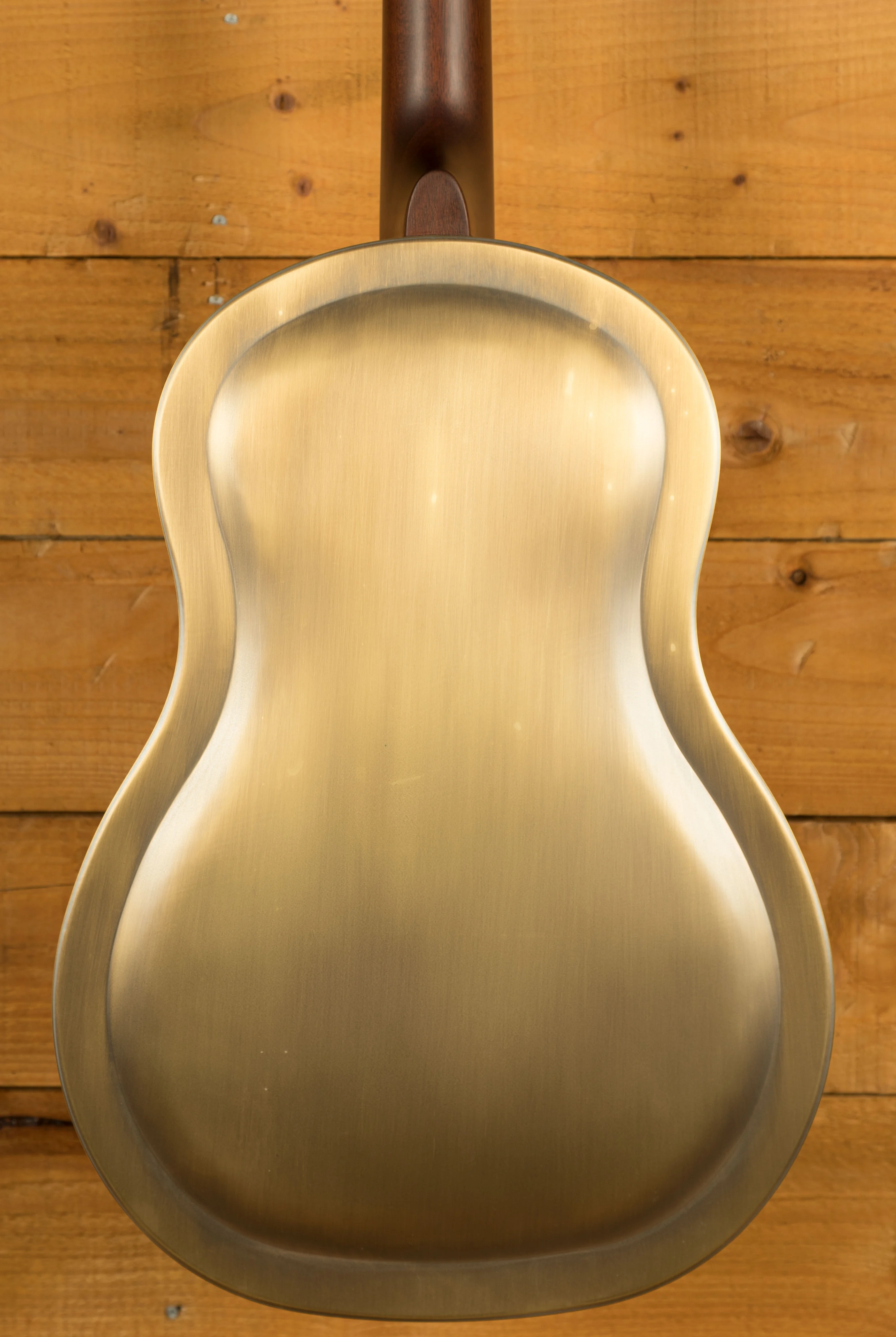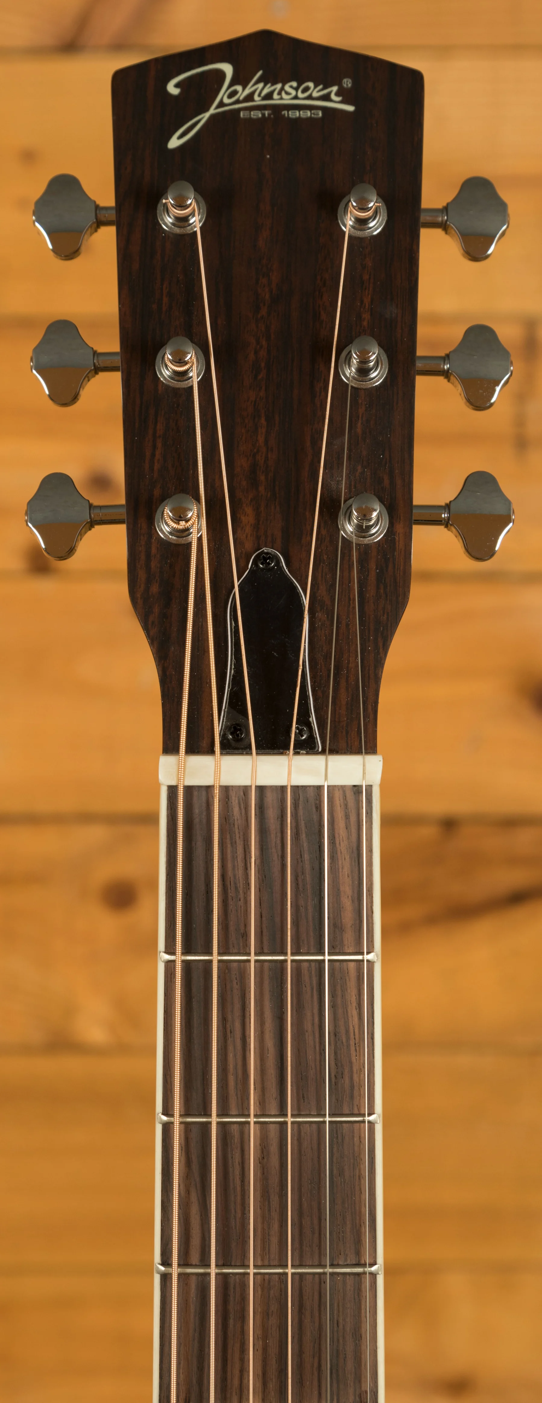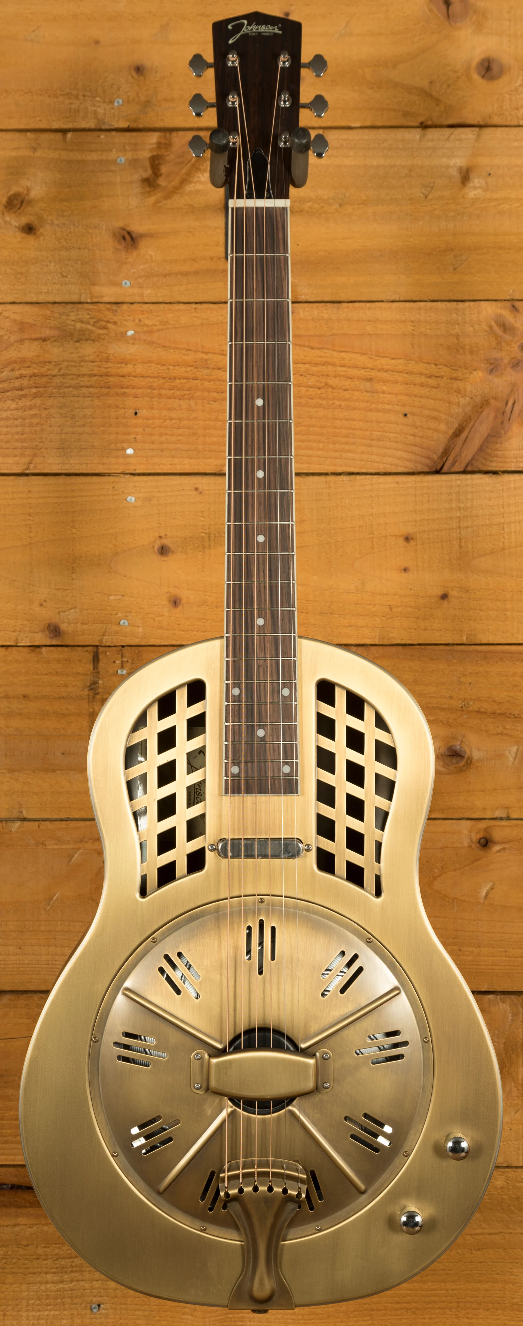 The brass body of the Johnson 995 offers a rich, warm tone with a pronounced midrange. This material choice provides a slightly mellower sound compared to steel-bodied resonators but still retains the bold projection and signature tone that resonator guitars are known for. The brass construction also contributes to the instrument's durability, ensuring it can withstand the demands of frequent play.